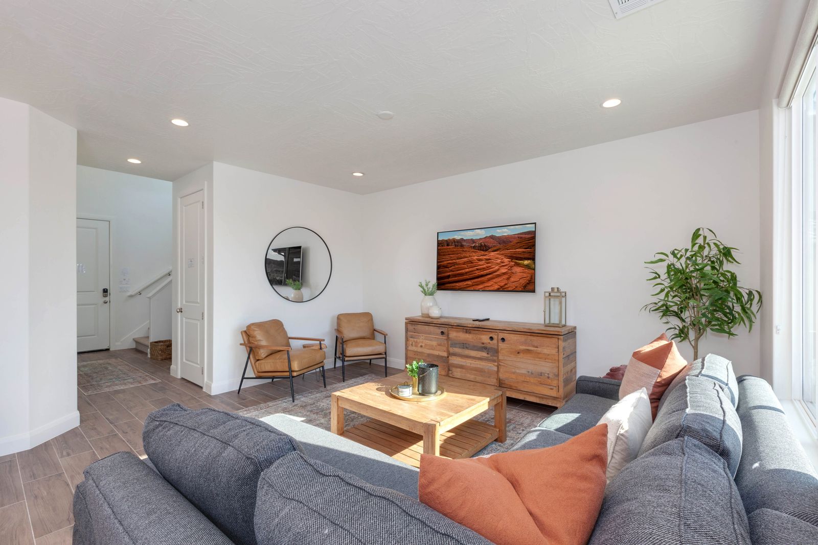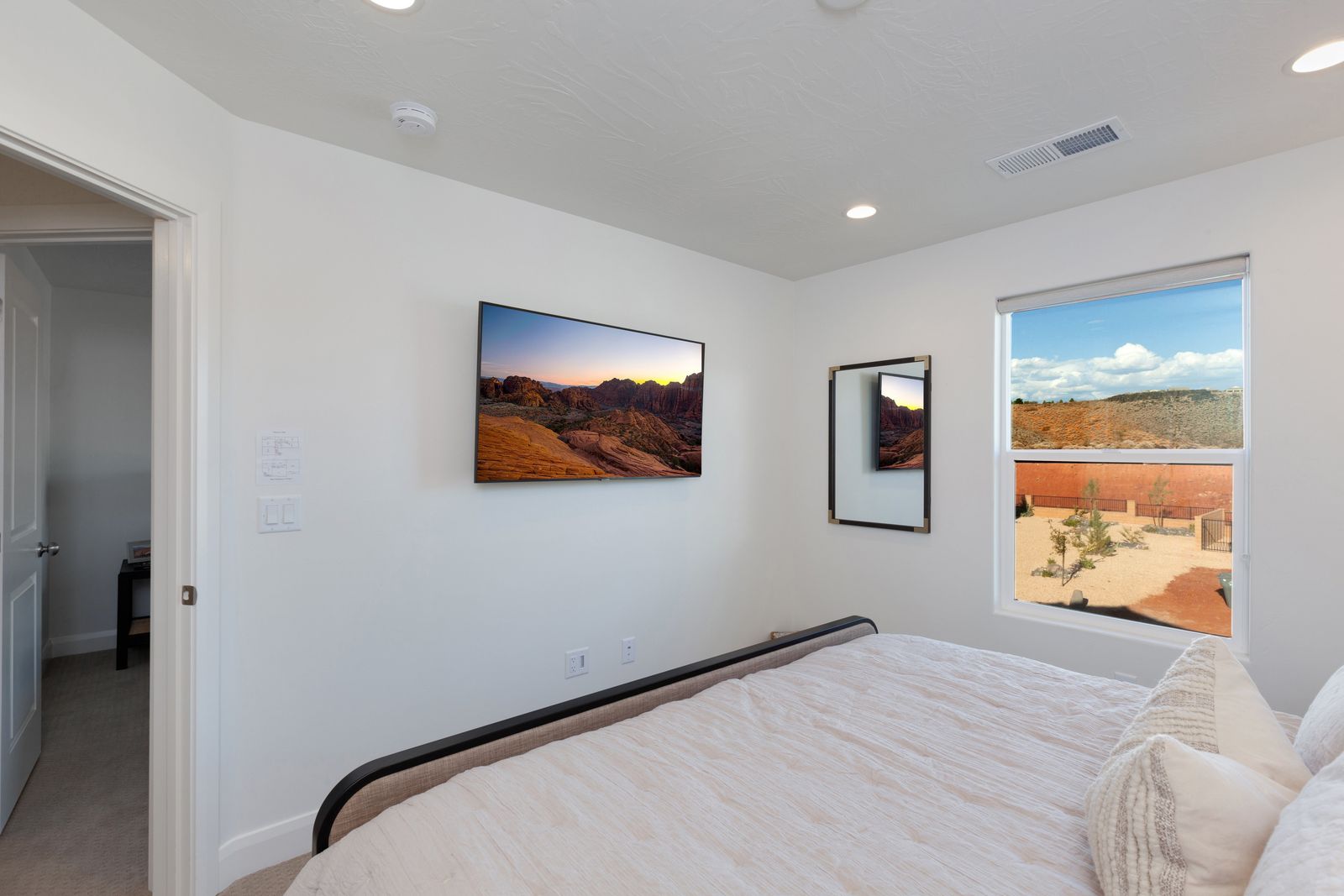 This newly built five-bedroom / 3.5-bath townhome can comfortably sleep up to 12 guests or 14 guests with two sleeping pads. Located right off of I-15, this home is in the perfect spot for day trips to one of the many National or State parks. Spend your days exploring the nearby hills or boating at the nearby lakes! Back at home, challenge each other to a ping pong tournament or grill up some burgers for the family. The main bedroom hosts a king bed, tv, and an ensuite bathroom. Off the entry, up the stairs, you'll find three more king bedrooms and a bunk room, all with smart TVs. Whether you adventure through the mountains, lounge by the pool, or stay home, this is the perfect place for you!