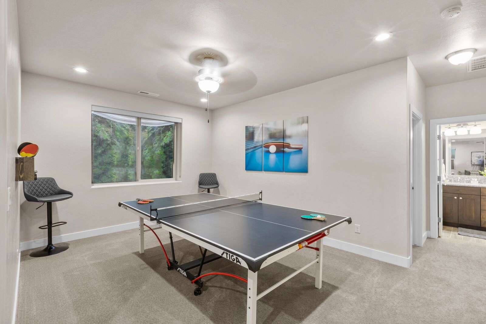 The upper level features a spacious living room with a cozy fireplace, perfect for gathering around on chilly evenings. The living room also boasts a PlayStation and a Smart TV, so you can relax and unwind with your favorite movies or games. Just off the living room, you'll find a door leading out to a balcony with breathtaking views of the surrounding mountains. Downstairs, you'll find another living room with a gaming area that features four side-by-side TVs, 3 Xboxes, a Nintendo Switch, and plenty of board and card games to keep everyone entertained for hours on end. The gaming room is perfect for kids and adults alike. With three living rooms, this vacation home offers plenty of space for your entire group to spread out and relax. You'll also find a laundry room with two side-by-side stacked washer and dryers, so you can keep your clothes fresh and clean throughout your stay. And if you're looking for even more amenities, the rental home is located in the Paradise Village community, which includes a clubhouse and public pool available for your use. Whether you're planning a family reunion or a fun getaway with friends, this rental home is the perfect place to stay. So why wait? Book your dream vacation in Paradise Village today and start planning an unforgettable trip with your loved ones!