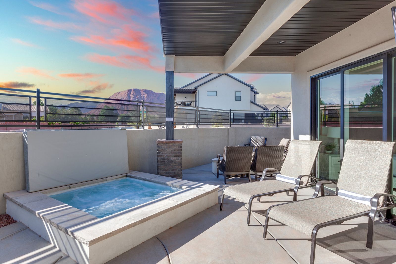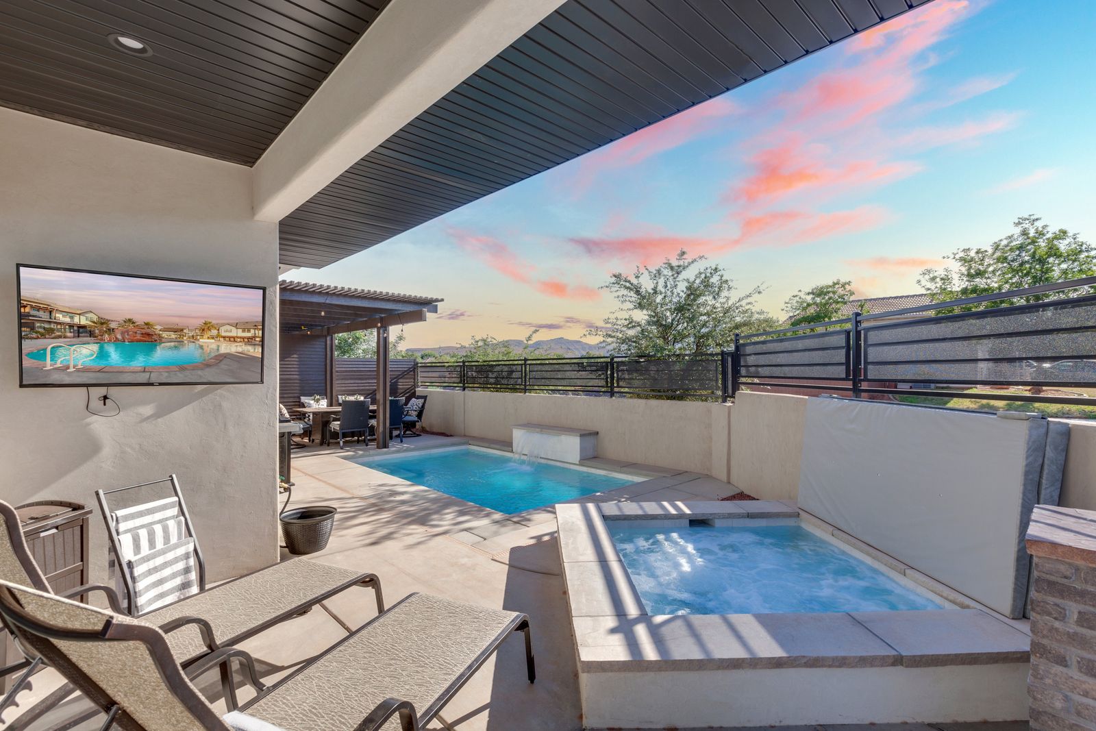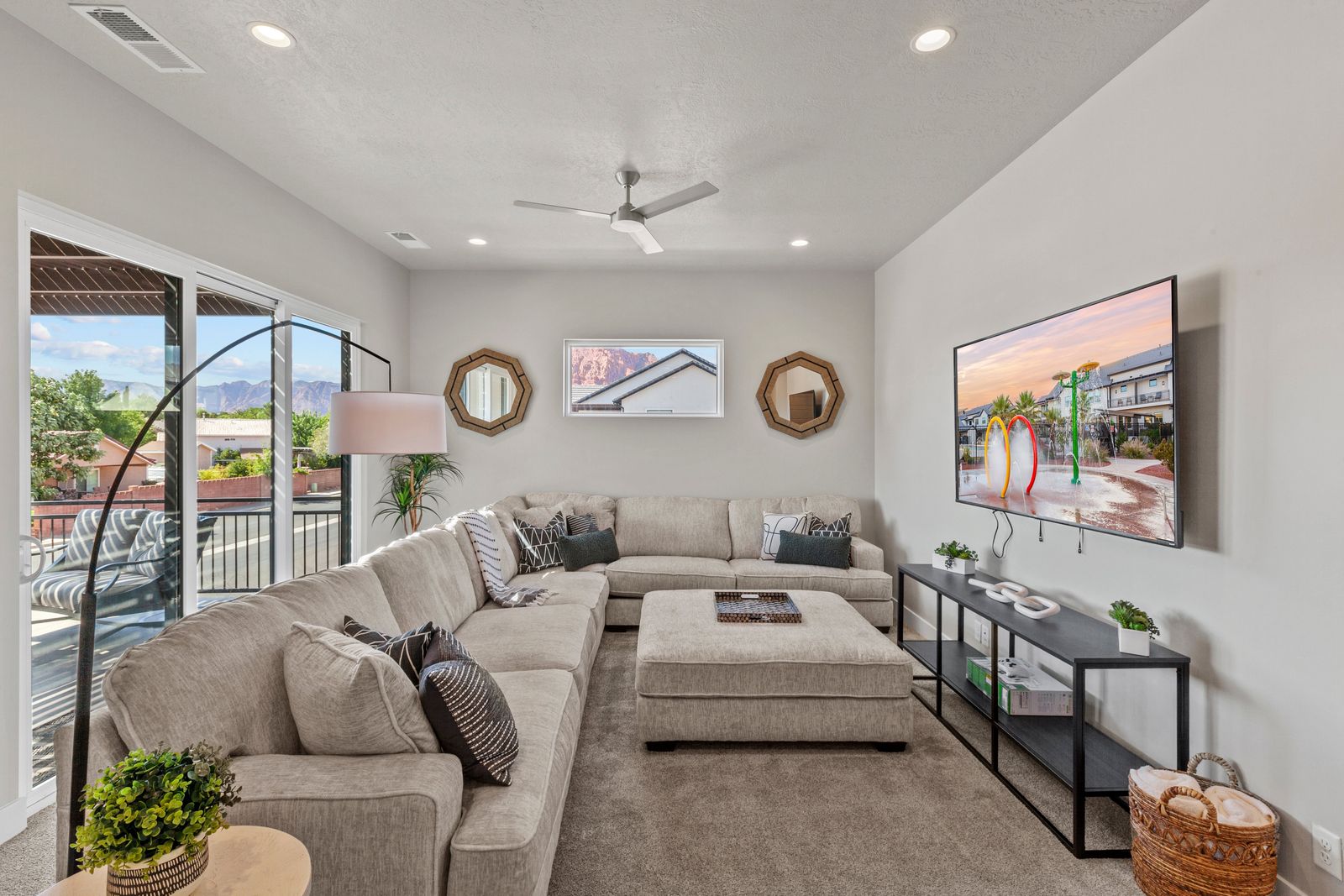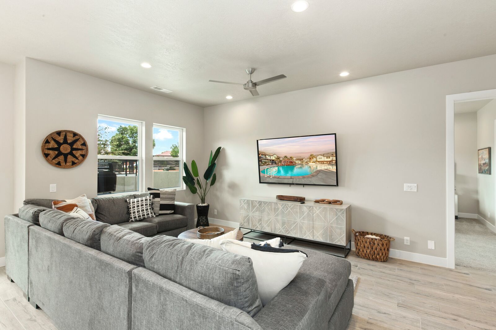 Your Vacation begins at Red Mountain Retreat at Ocotillo Springs Resort, this amazing new home with 5 bedrooms and 5.5 bathrooms can comfortably sleep 17 people, or with the use of a pull-out sofa sleeper, fit as many as 19. It lies in the beautiful scenic foothills of the Santa Clare Mesa, an oasis among the stark beauty of the red mountains. It is ideal for those looking for a more peaceful environment. With quick access to multiple national parks, amazing resort amenities, and golf a short drive away. After a day of adventure, you can enjoy an evening with a live show at Tuacahn Amphitheater under the beautiful desert stars. You will never have a dull moment in this desert oasis.