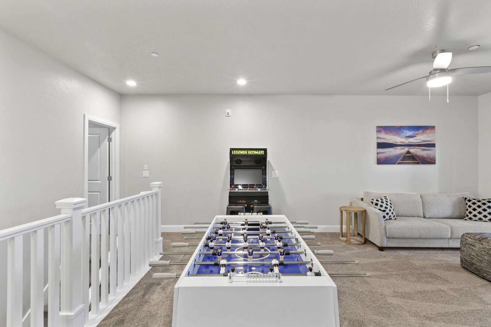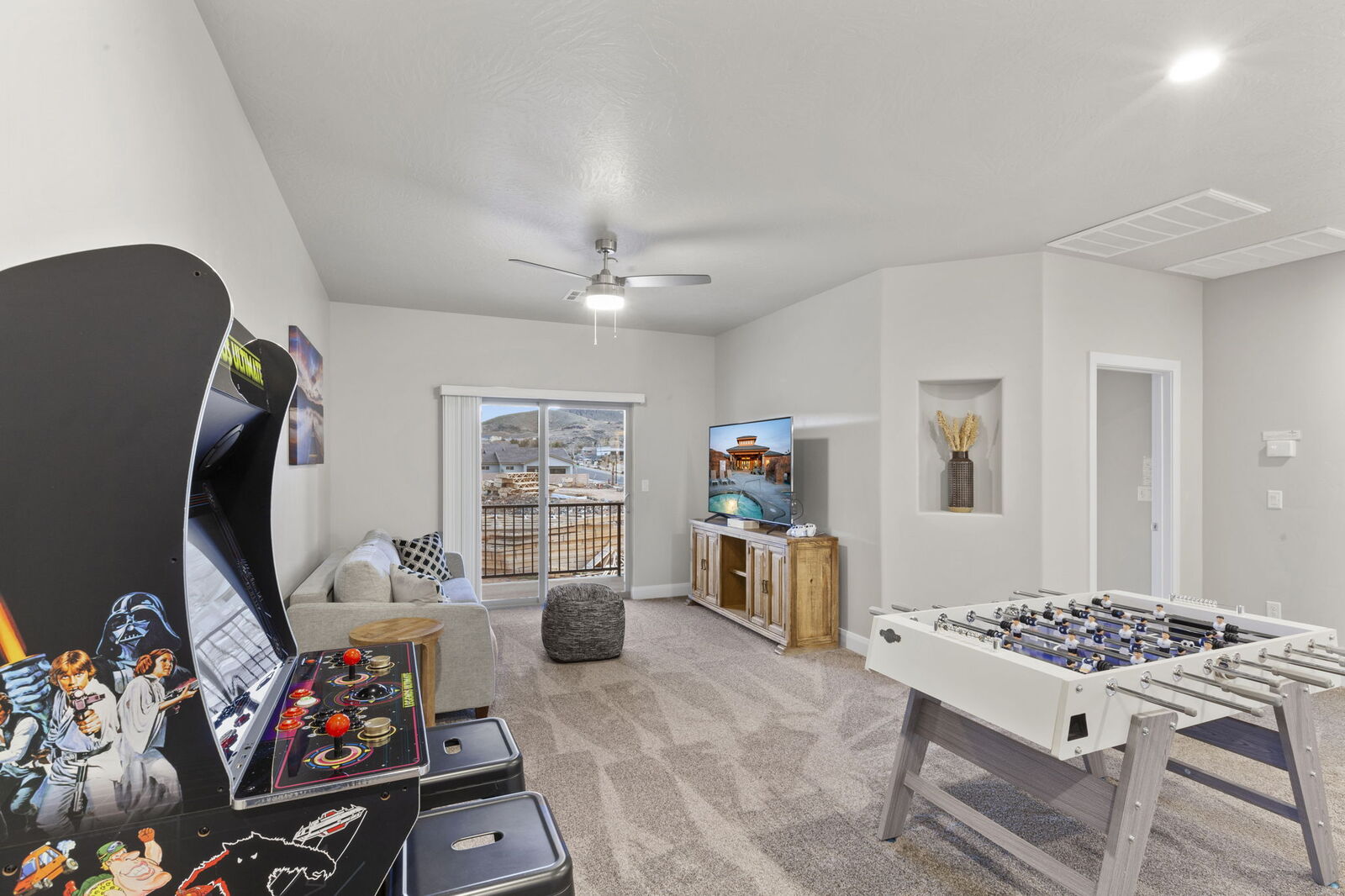 This home offers the utmost in relaxation and entertainment. On the main level, there is a bedroom featuring a queen-size bed and a private bathroom with a large shower. The upstairs primary suite features a king-size bed, private bathroom with a large shower, access to the balcony with stunning mountain and park views, and a Roku TV. The second bedroom upstairs has a queen bed and a large closet while the bunk room includes two triple bunk beds that sleep six and a Roku TV. The upstairs loft is complete with a king-size sleeper sofa, Xbox and an old-school arcade game with 300 classic games to enjoy. The two-car garage is equipped with a ping pong table and a 65-inch TV for entertainment. The backyard is ready for barbecue fun with a hot tub, grill, and outdoor seating. It’s the perfect spot for grilling and taking a private soak in the fenced-in yard.