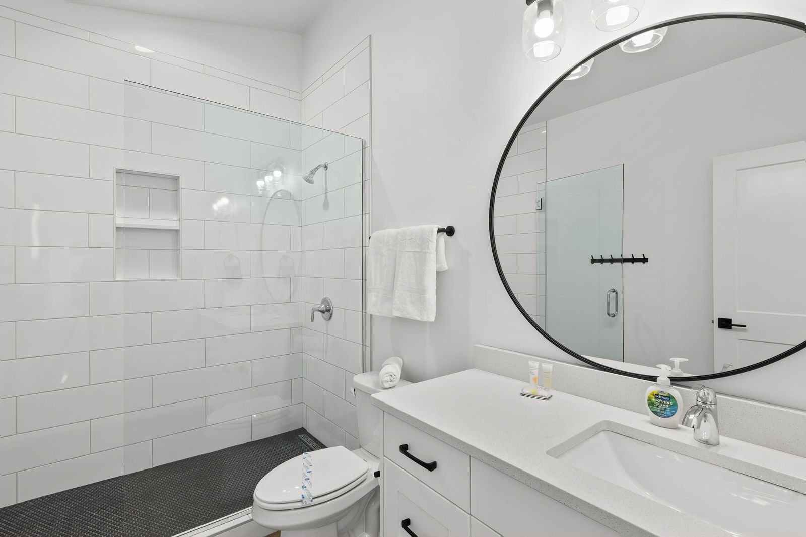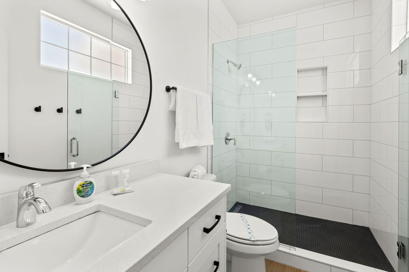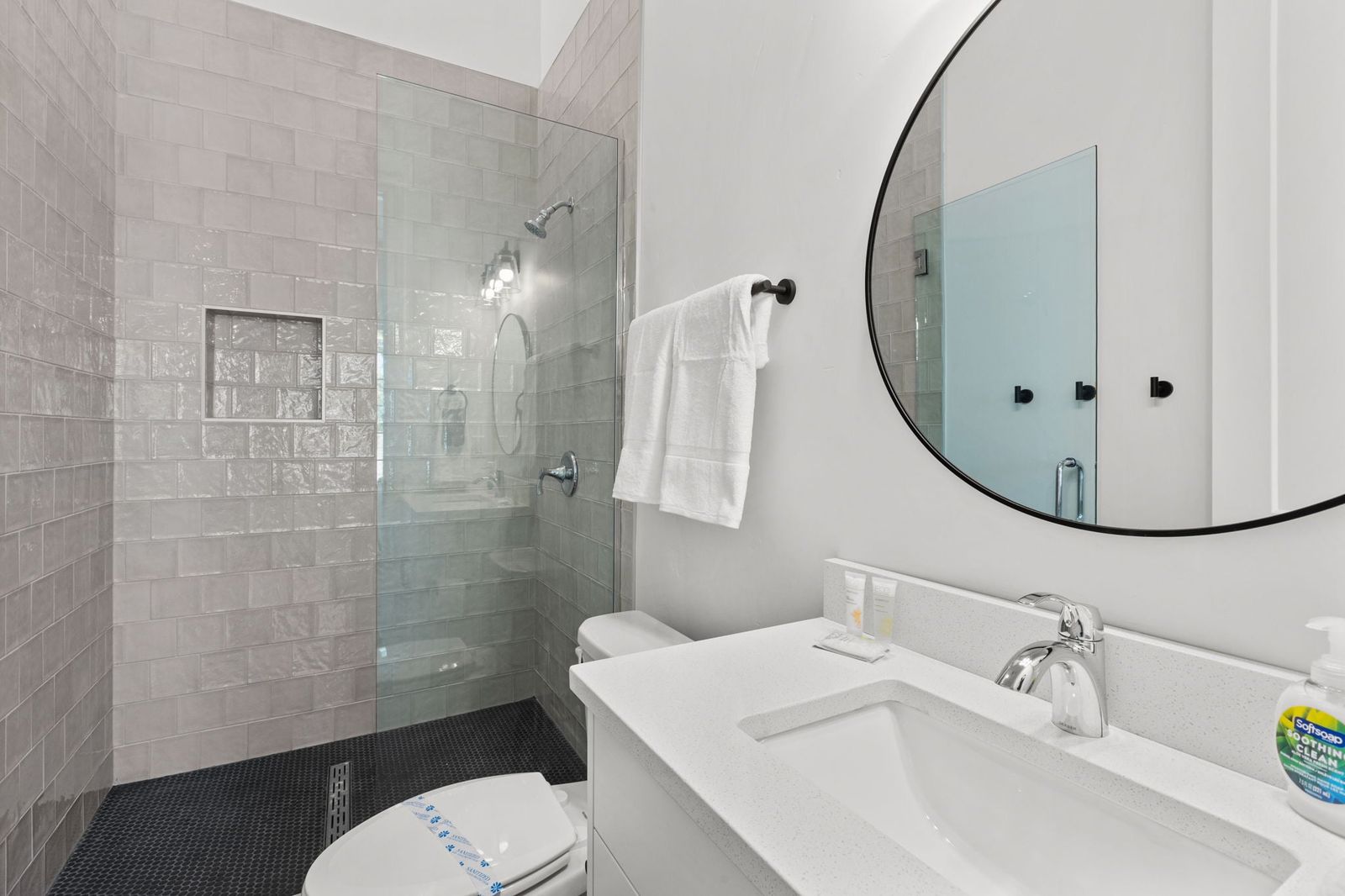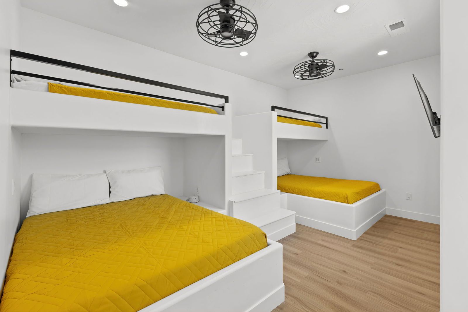 Upstairs: - King Suite #3: 15” king mattress, 55” Smart TV, nightstands with 2 USB ports, a sound machine, and private bathroom with a walk-in shower