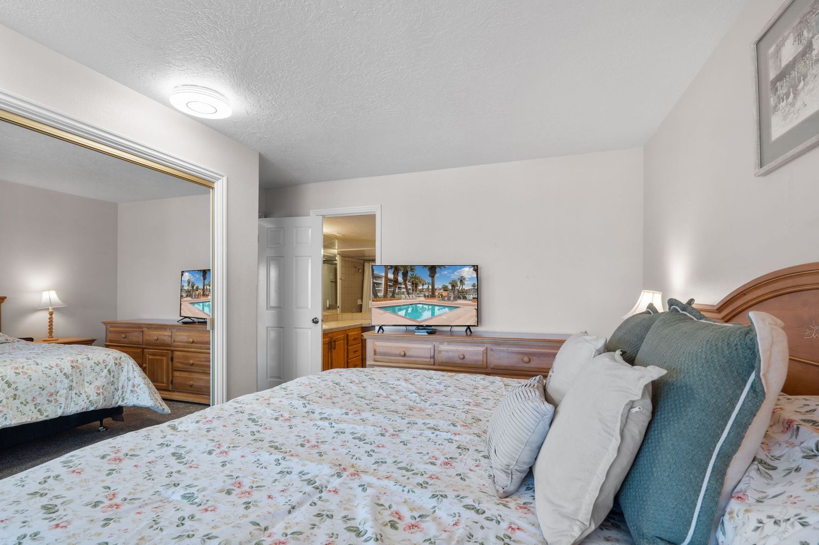 Drift into a world of serenity as you sink into plush bedding in any of our three charming bedrooms. Wake up each morning refreshed and ready to seize the day's adventures! Pamper yourself in our luxurious bathrooms, where rejuvenating showers and soothing baths await. When it's time to kick back and relax, enjoy a movie night in our cozy living room, complete with a TV and DVD-player. Pop some popcorn, settle in, and let the laughter and joy fill the air! Dive into Happiness by taking a dip in the sparkling community pools, where laughter and splashes mingle with warm sun rays. Whether you're a water enthusiast or simply looking to bask in the sun, these pools are your oasis of fun. Sip your morning coffee or savor a sunset view on your very own screened-in balcony. Gaze out at breathtaking views while relishing the fresh air - the perfect backdrop for making unforgettable memories. Need to mix business with pleasure? This condo is designed to accommodate your work needs while keeping the vacation vibes alive. Stay connected with high-speed Wi-Fi, all while being just a stone's throw away from pure leisure. Explore to your heart's content and return to your personal oasis when the day is done. Your unforgettable vacation starts here. Pack your bags and let the good times roll!