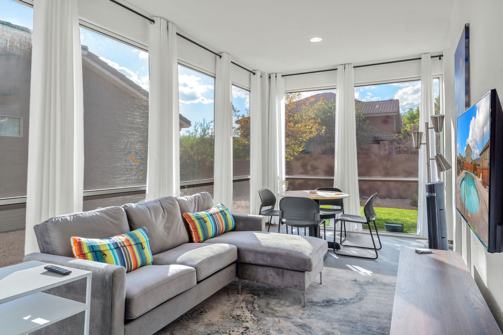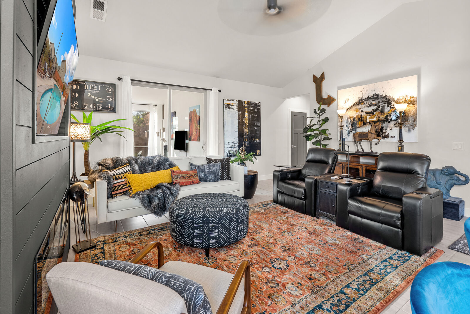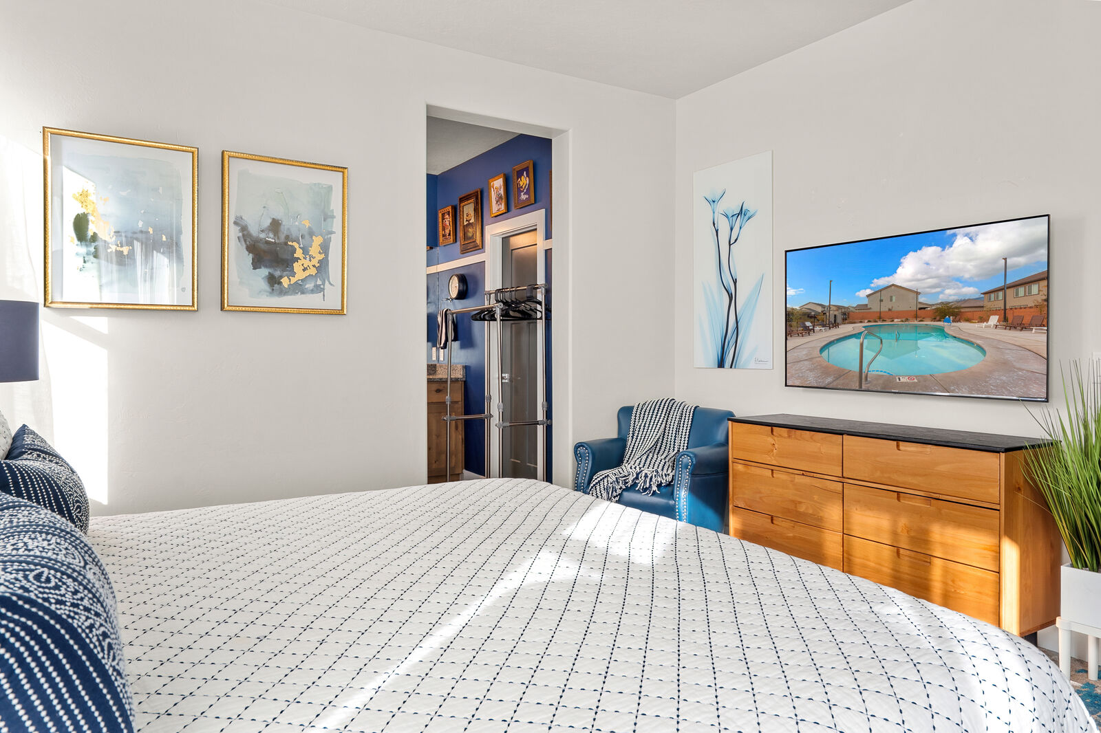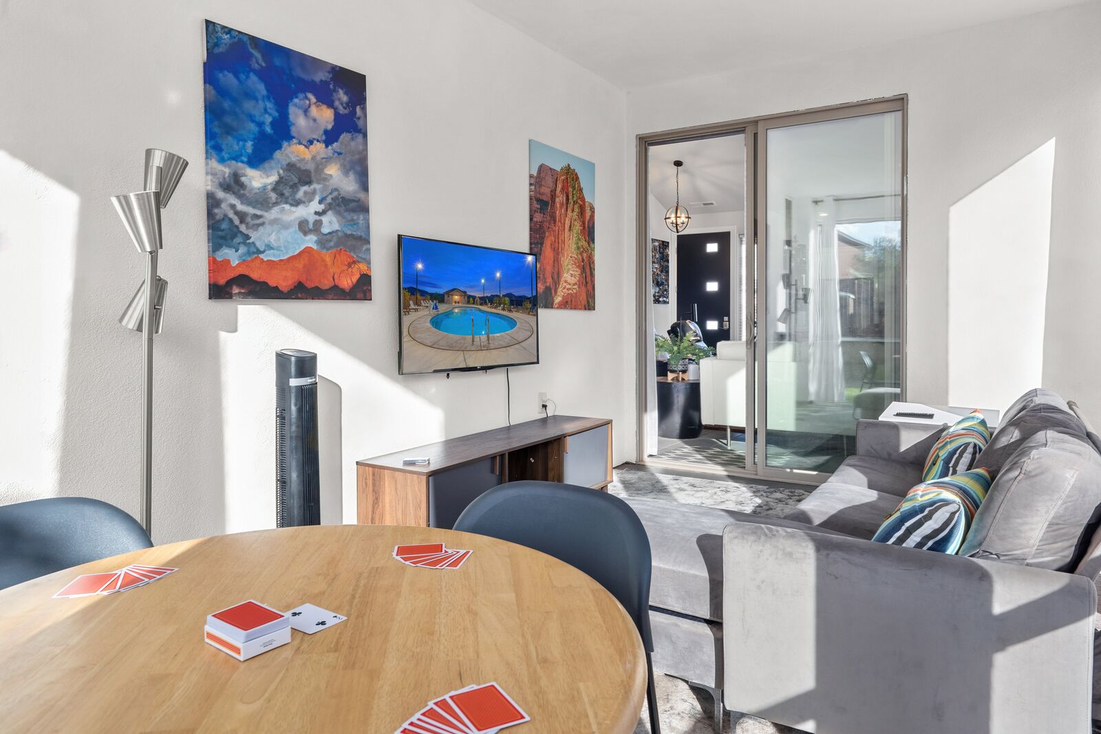 Red Mountain Villa is a spacious 3-bedroom, 2-bathroom haven, providing comfortable accommodation for 8 guests (expandable to 10 with twin foam pads). The master bedroom features a private ensuite, while the queen bedroom and bunk room share a bathroom. Delight in the pleasant Southern Utah climate as you unwind on the lanai, enjoying your favorite movie, and take advantage of the prime location just across the street from the resort pool, where you can soak in the magnificent vistas that surround you in the stunning Southern Utah weather.