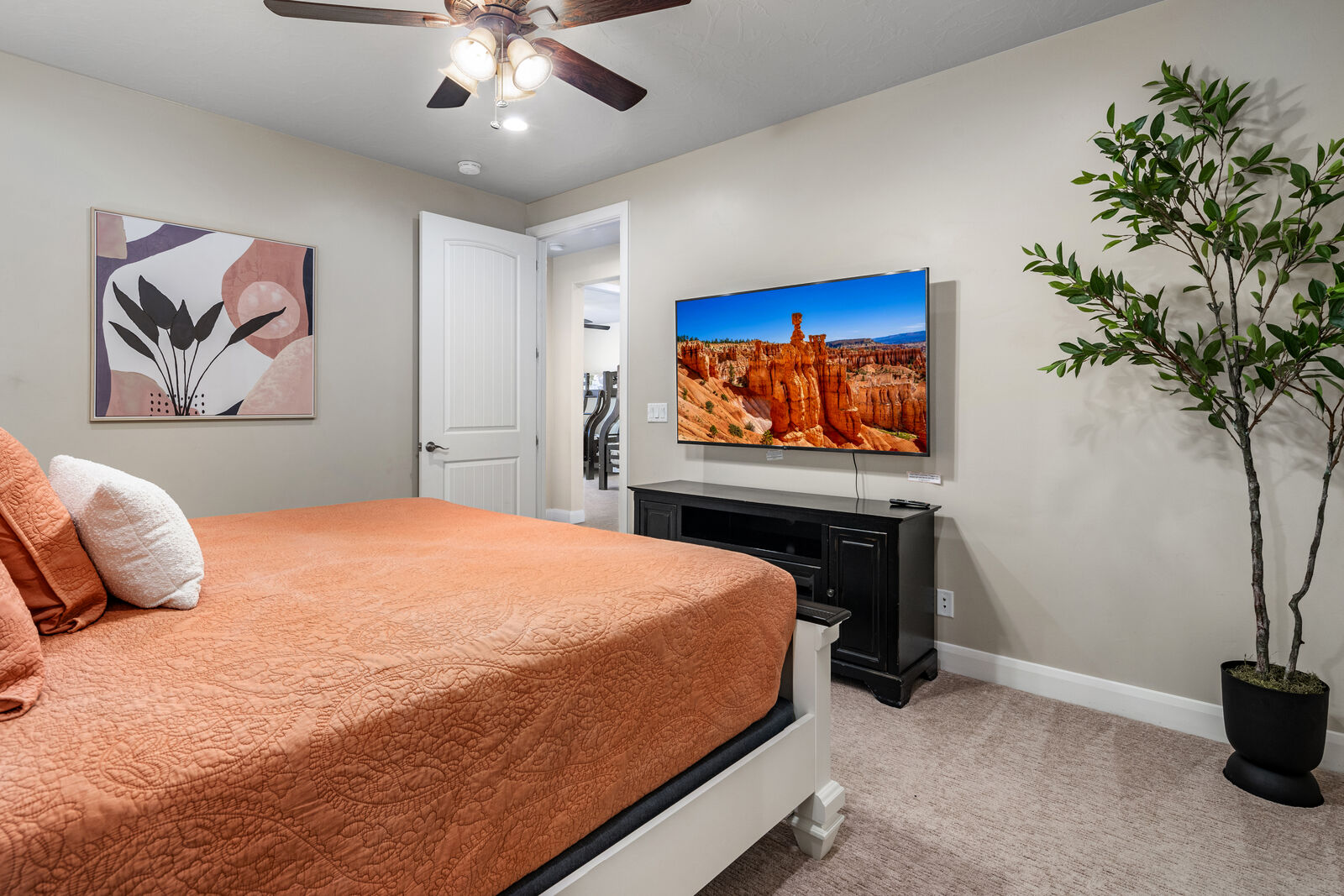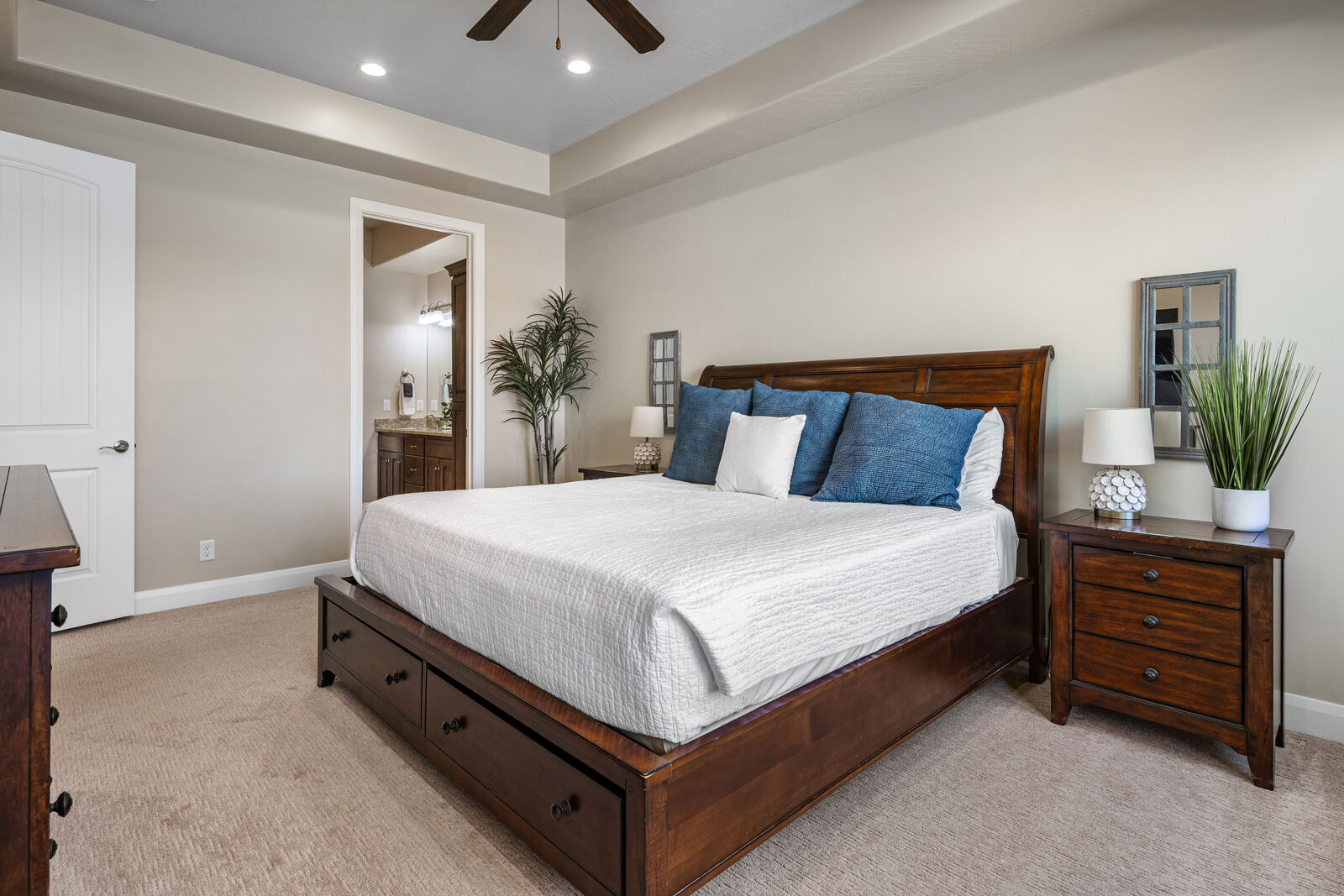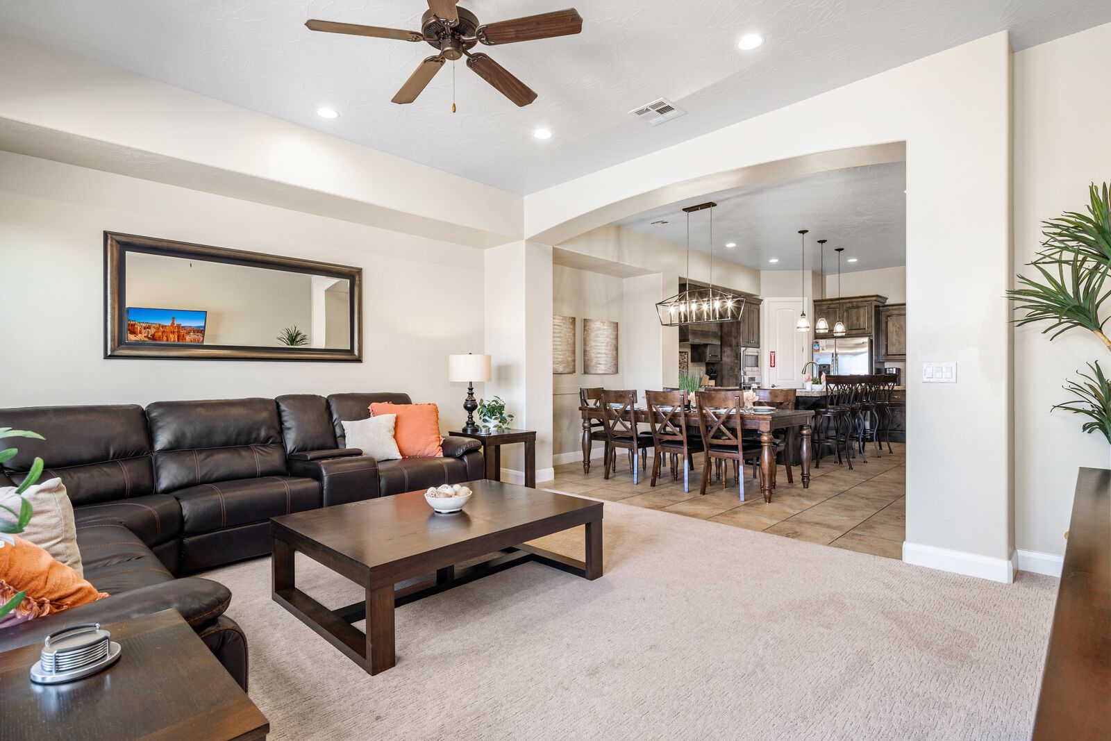 Go on a journey of comfort and elegance in this stunning 5-bedroom, 3.5-bathroom home, perfect for groups of up to 14, with the option to accommodate 16 using an inflatable queen mattress. The main floor features a luxurious primary bedroom suite with a king bed, a spacious walk-in shower, and a soaking tub for ultimate relaxation. Head upstairs to the second-floor primary suite, offering another king bed, a dedicated workspace, and a shared ensuite with private access to an additional king bedroom. The queen bedroom invites you to step out onto a private balcony with breathtaking views of the Coral Canyon Golf Course. For the kids, the final bedroom is a fun retreat with 2 full beds, 2 twin trundles, and a shared bathroom.