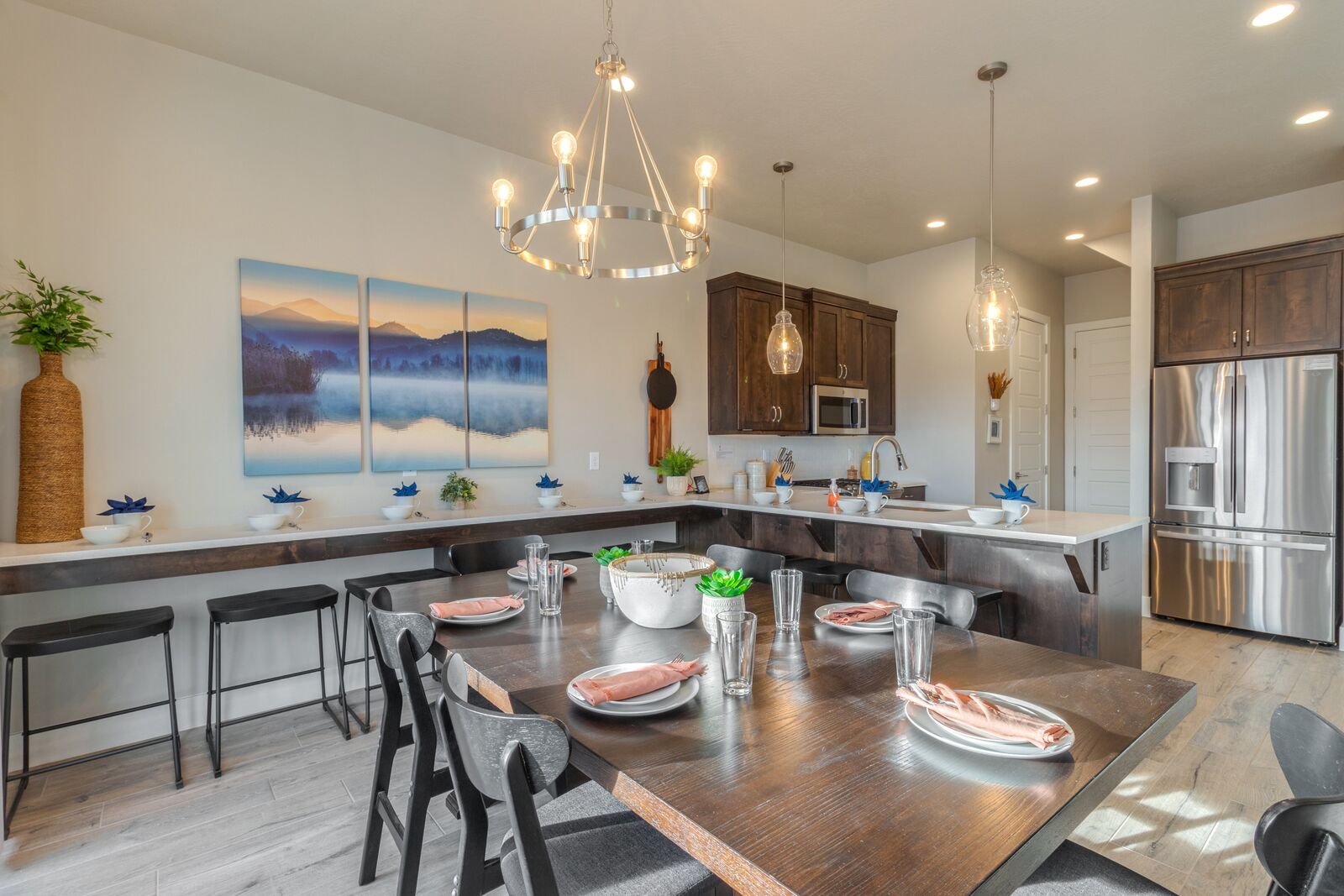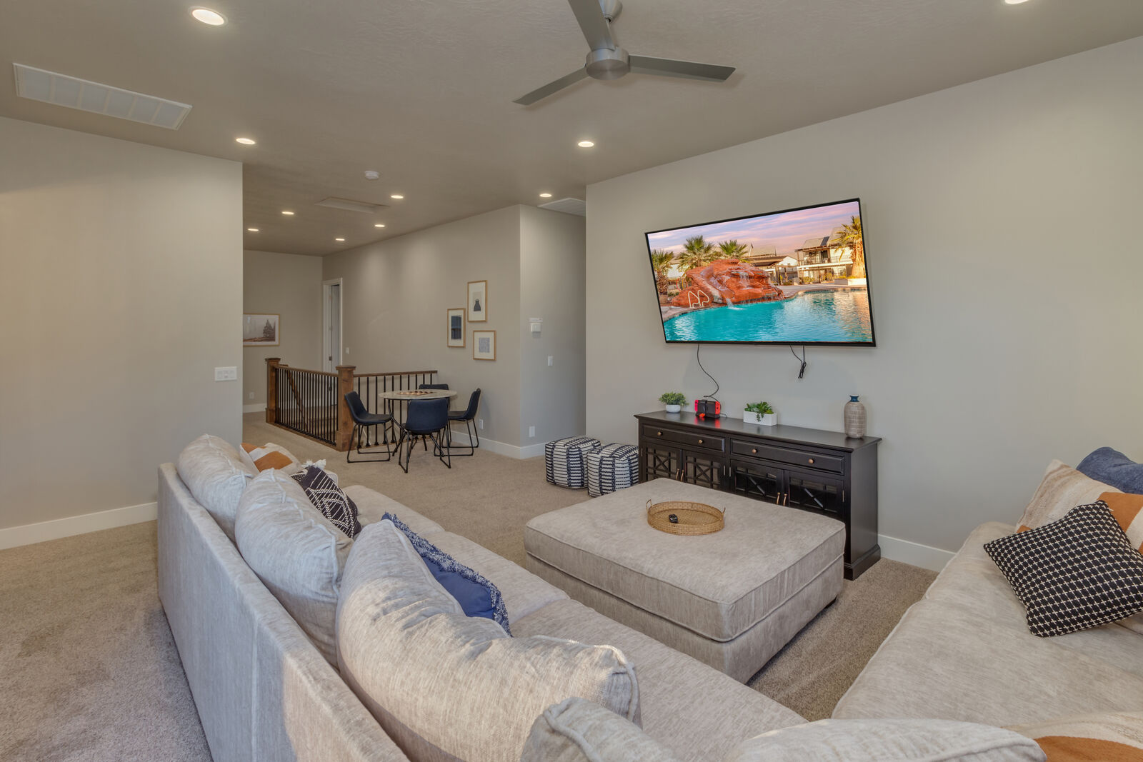 This gorgeous 5 bedroom/ 5.5 bathroom home can comfortably sleep 16 guests but up to 18 with the use of the sleeper sofa. The master bedroom has a king-size bed, Samsung TV, a private bathroom with a walk-in shower and soaker tub, and private access to the backyard pool/ spa. Bedrooms 2 & 3 each include a king-size bed, Samsung TV, and a private bathroom with a walk-in shower. Bedroom 4 is the first of the 2 bunk rooms, with 1 Full/ Queen bunk bed, Samsung TV, and a private bathroom with a walk-in shower. The last bedroom, just off the spacious loft, is the second of the 2 bunk rooms and it contains 2 triple tier twin bunk beds (6 twins) and a full sleeper sofa. This bedroom shares a bathroom with the loft and has a shower/ tub combo. You will also find a porta-crib provided for your use. As the sun sets, come home after a day full of adventure and relax in your private pool and hot tub. Host a game night by challenging each other to games on the Nintendo Switch, playing card/ board games, or having a ping pong tournament! With countless local wonders to visit, as well as gorgeous on-site amenities, Oasis at Ocotillo Springs is sure to be a favorite vacation destination for years to come!