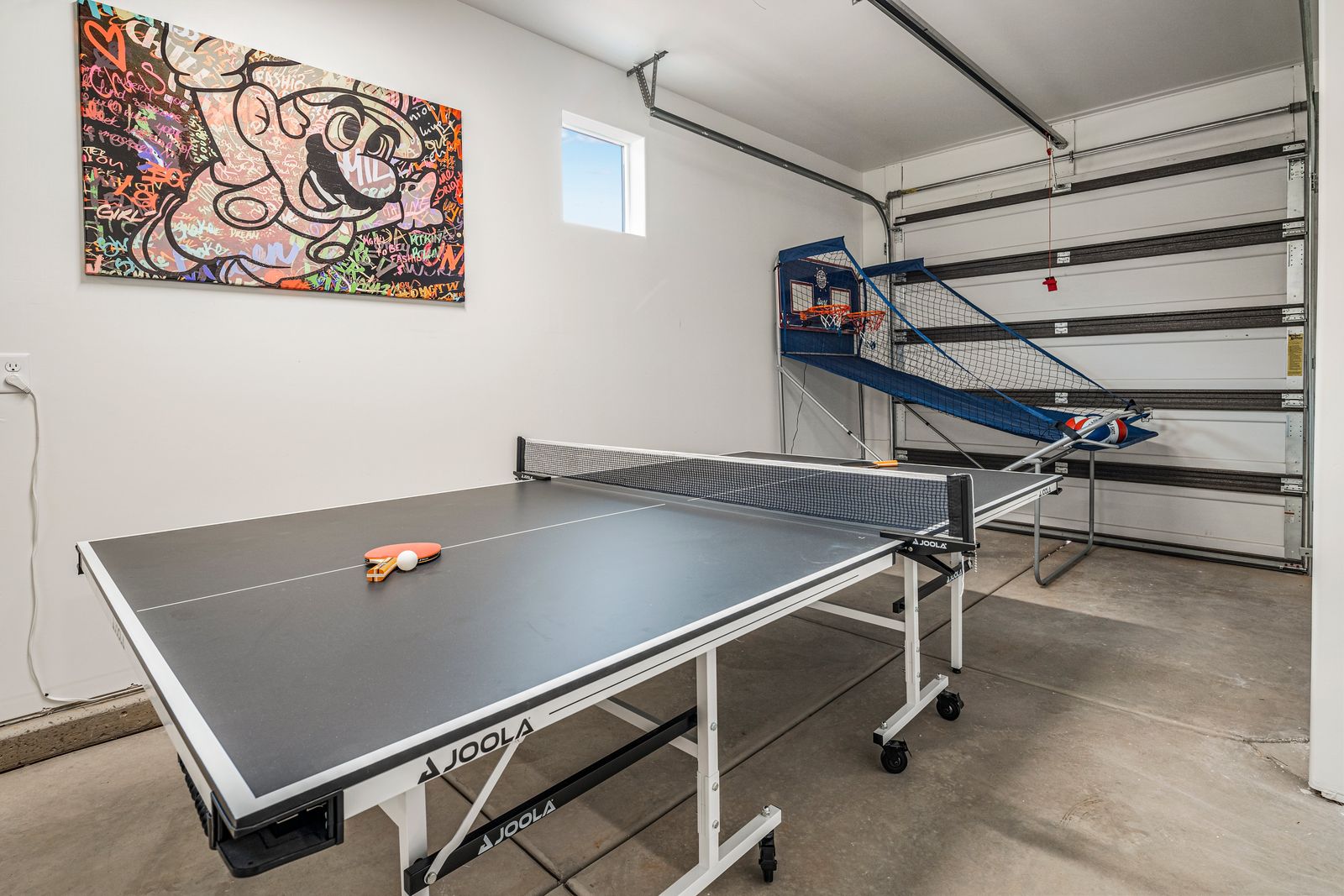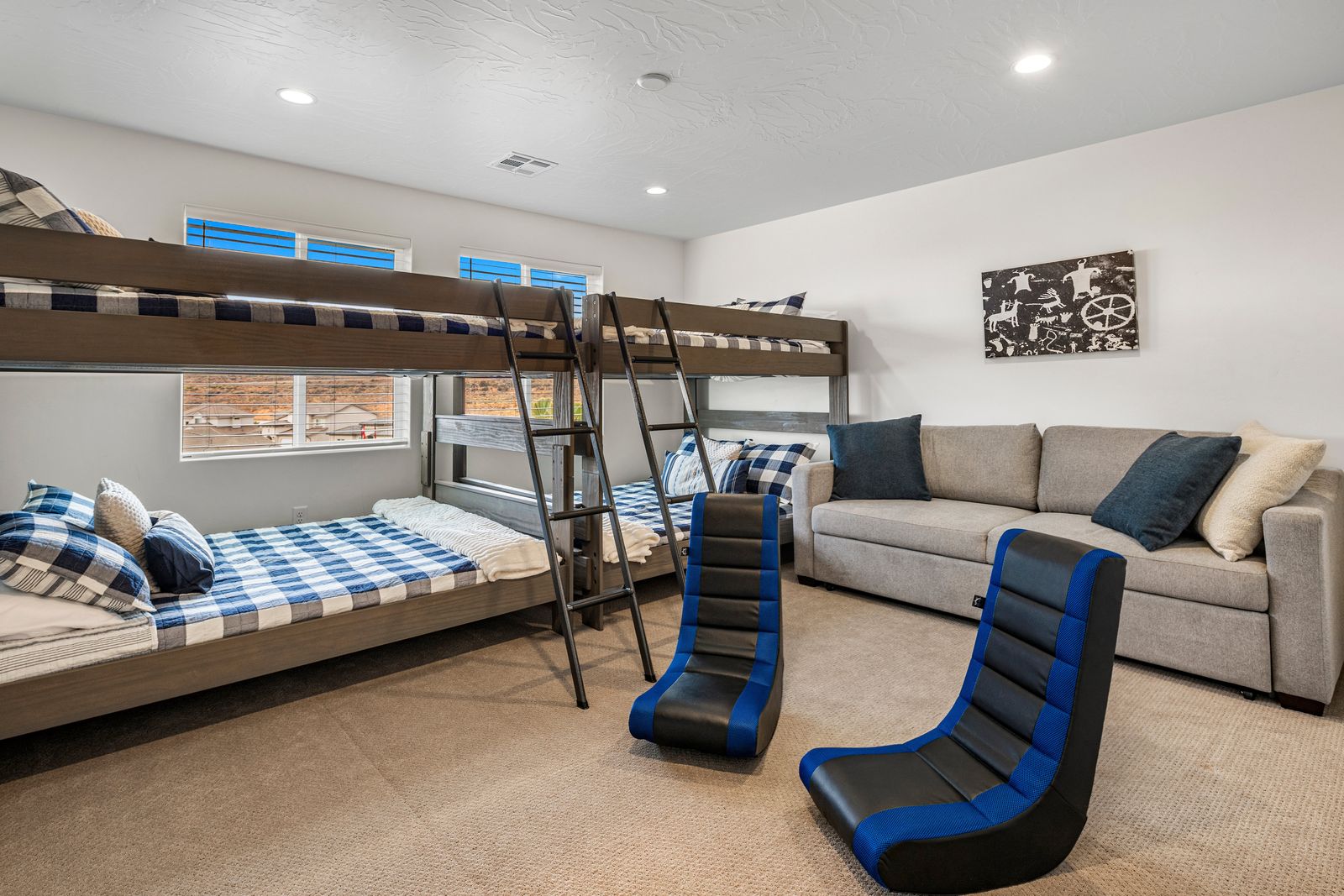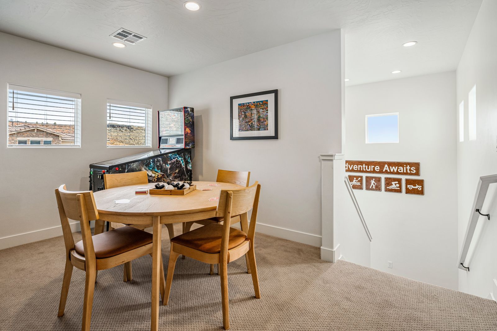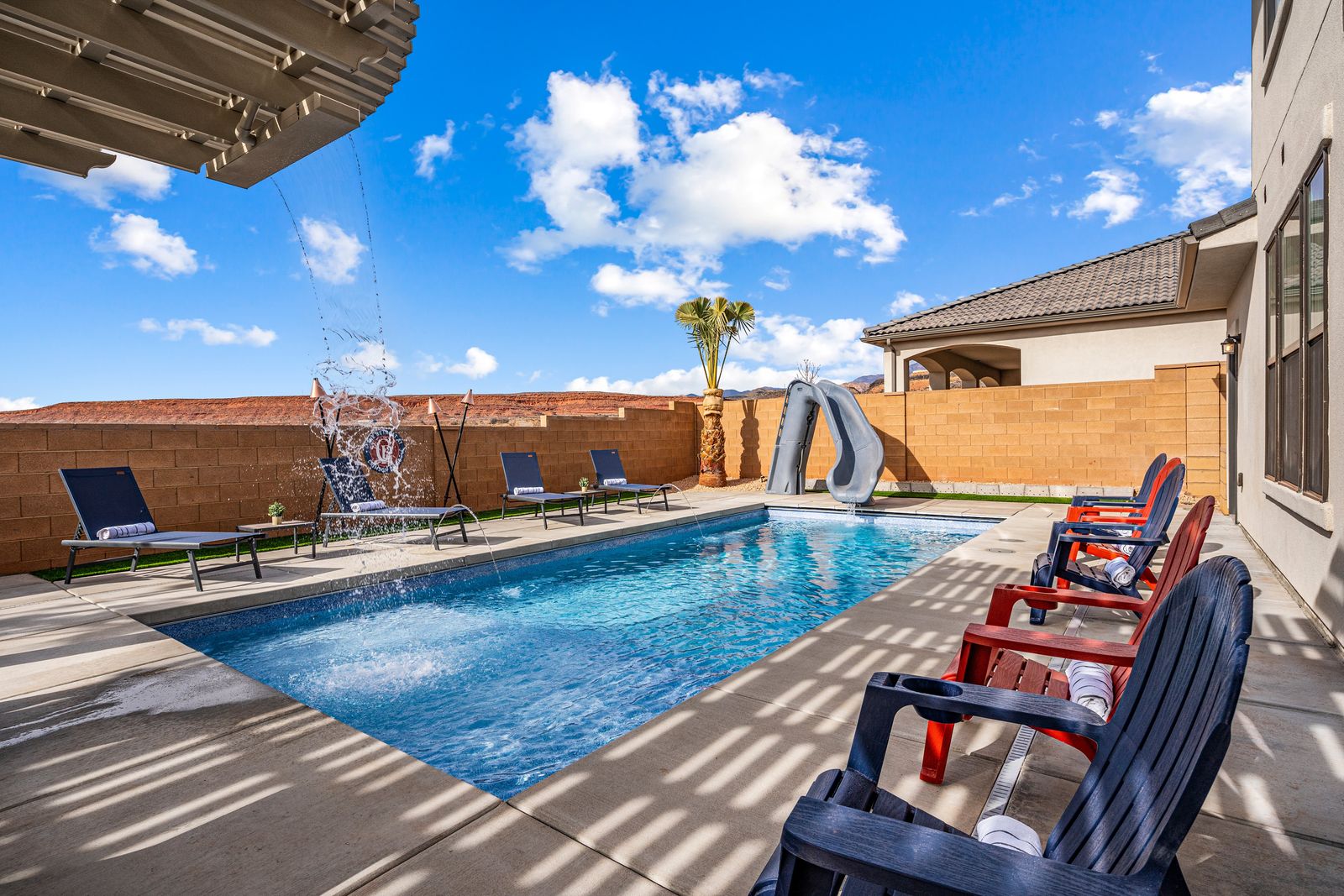 This spacious vacation retreat comfortably sleeps 16 guests, with the option to accommodate up to 20 when utilizing the two Queen sofa sleepers. Designed to cater to all types of guests, this home offers an array of luxurious amenities. The five beautifully appointed bedrooms each come with an ensuite bathroom and TV, ensuring privacy and comfort. For added fun, unwind in the cozy loft, featuring a game area complete with a pinball machine, Nintendo Switch, and board games. The great room features an 85-inch TV. Outdoors, enjoy a private backyard oasis with a 6-ft deep pool with a slide and waterfall, hot tub, fire pit, water feature, putting green, and outdoor kitchen with a pizza oven — ideal for evenings of relaxation and entertainment complete with beautiful sunset views. The Retreat at Crimson Ridge also is part of the Paseos HOA, with access to pickleball courts, and a large pool, with a lazy river and two-story slide. The home also includes a fully equipped game room with an X-box, ping pong, foosball, arcade games, and a gym, making it a perfect choice for families, large groups, or friends looking to create lasting memories.