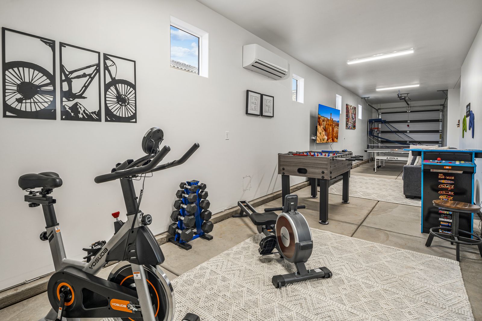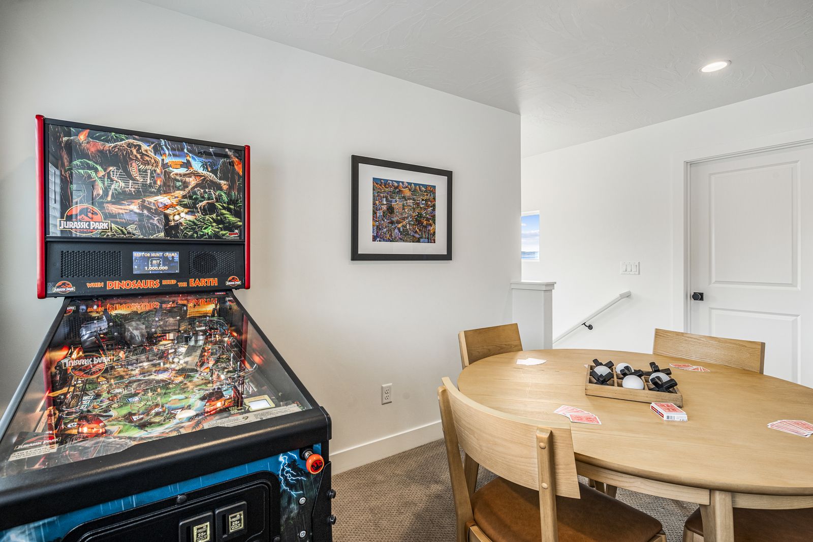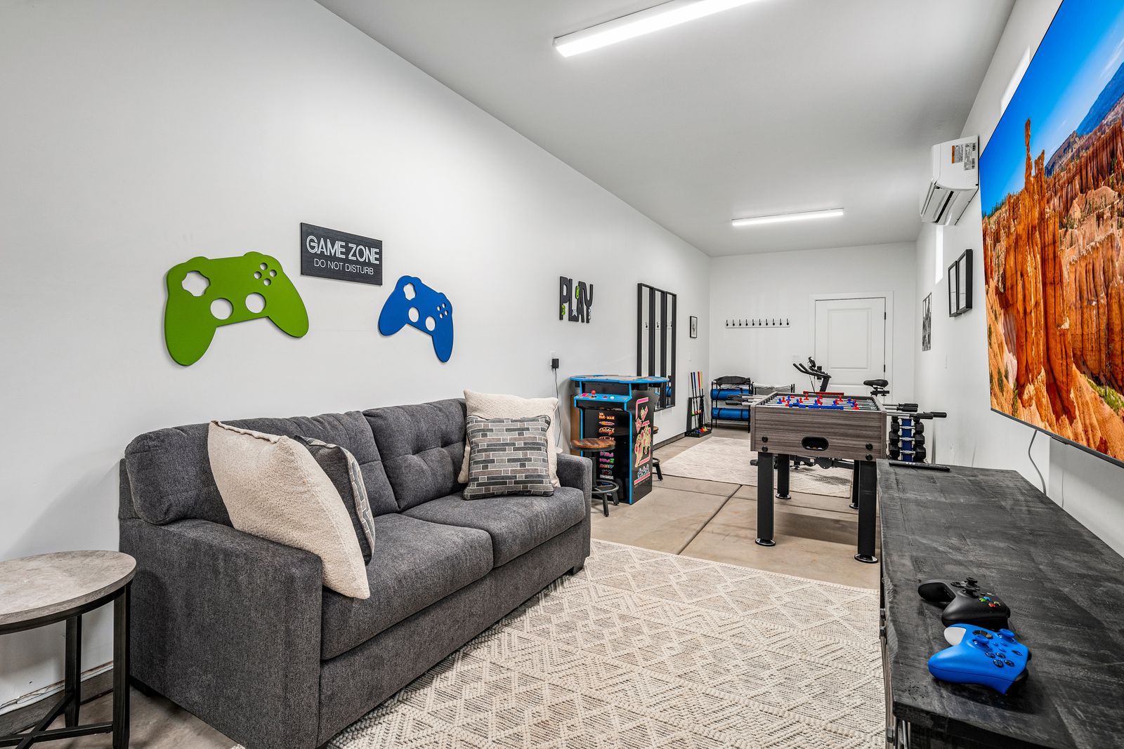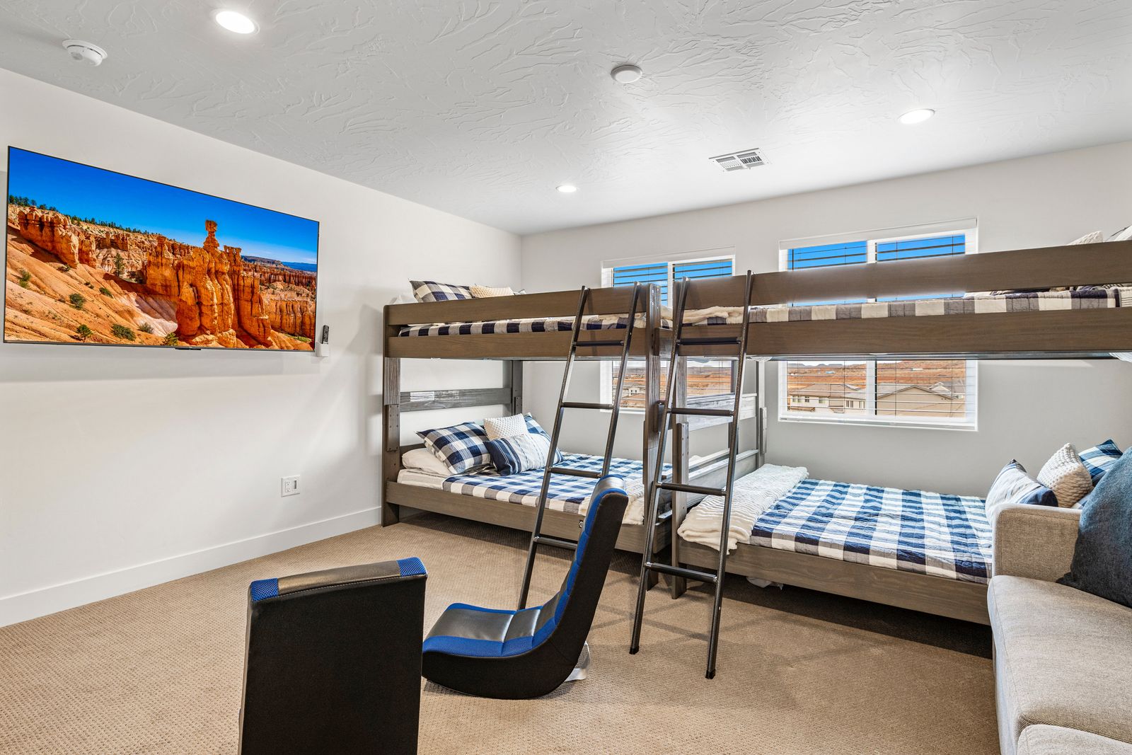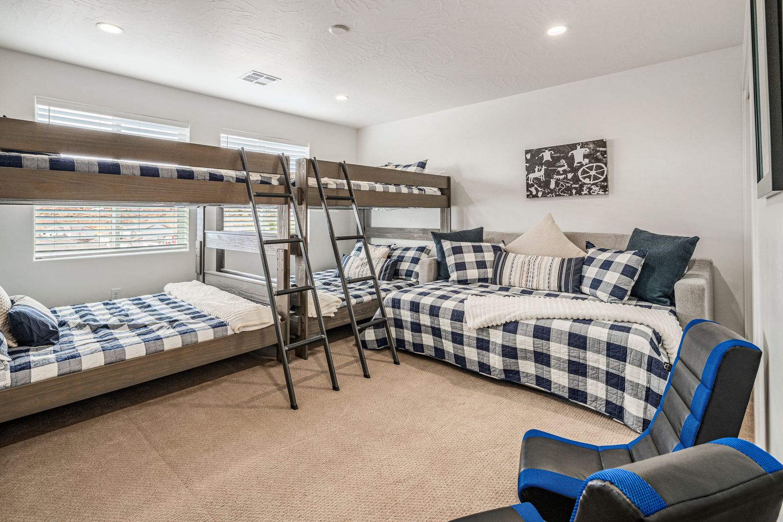 This spacious vacation retreat comfortably sleeps 16 guests, with the option to accommodate up to 20 when utilizing the two Queen sofa sleepers. Designed to cater to all types of guests, this home offers an array of luxurious amenities. The five beautifully appointed bedrooms each come with an ensuite bathroom and TV, ensuring privacy and comfort. For added fun, unwind in the cozy loft, featuring a game area complete with a pinball machine, Nintendo Switch, and board games. The great room features an 85-inch TV. Outdoors, enjoy a private backyard oasis with a 6-ft deep pool with a slide and waterfall, hot tub, fire pit, water feature, putting green, and outdoor kitchen with a pizza oven — ideal for evenings of relaxation and entertainment complete with beautiful sunset views. The Retreat at Crimson Ridge also is part of the Paseos HOA, with access to pickleball courts, and a large pool, with a lazy river and two-story slide. The home also includes a fully equipped game room with an X-box, ping pong, foosball, arcade games, and a gym, making it a perfect choice for families, large groups, or friends looking to create lasting memories.