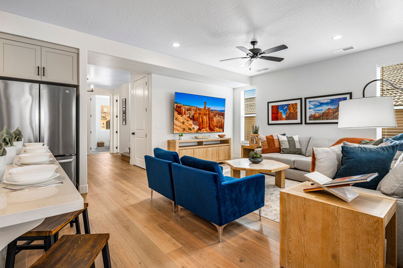 Nestled amidst breathtaking mountain views of Southern Utah, The Retreat at Crimson Ridge offers a tranquil escape just 45 minutes from the iconic Zion National Park. Whether you're an adventurer looking to explore Zion's famous trails, the biking trails of Red Cliff Desert Reserve, golfing St. George’s iconic courses, or paddleboarding on Sand Hollow, or someone simply seeking a peaceful retreat surrounded by nature, this home is perfectly situated for both. The backyard provides stunning vistas, and the serene environment makes it an ideal base for outdoor activities or a relaxing getaway.