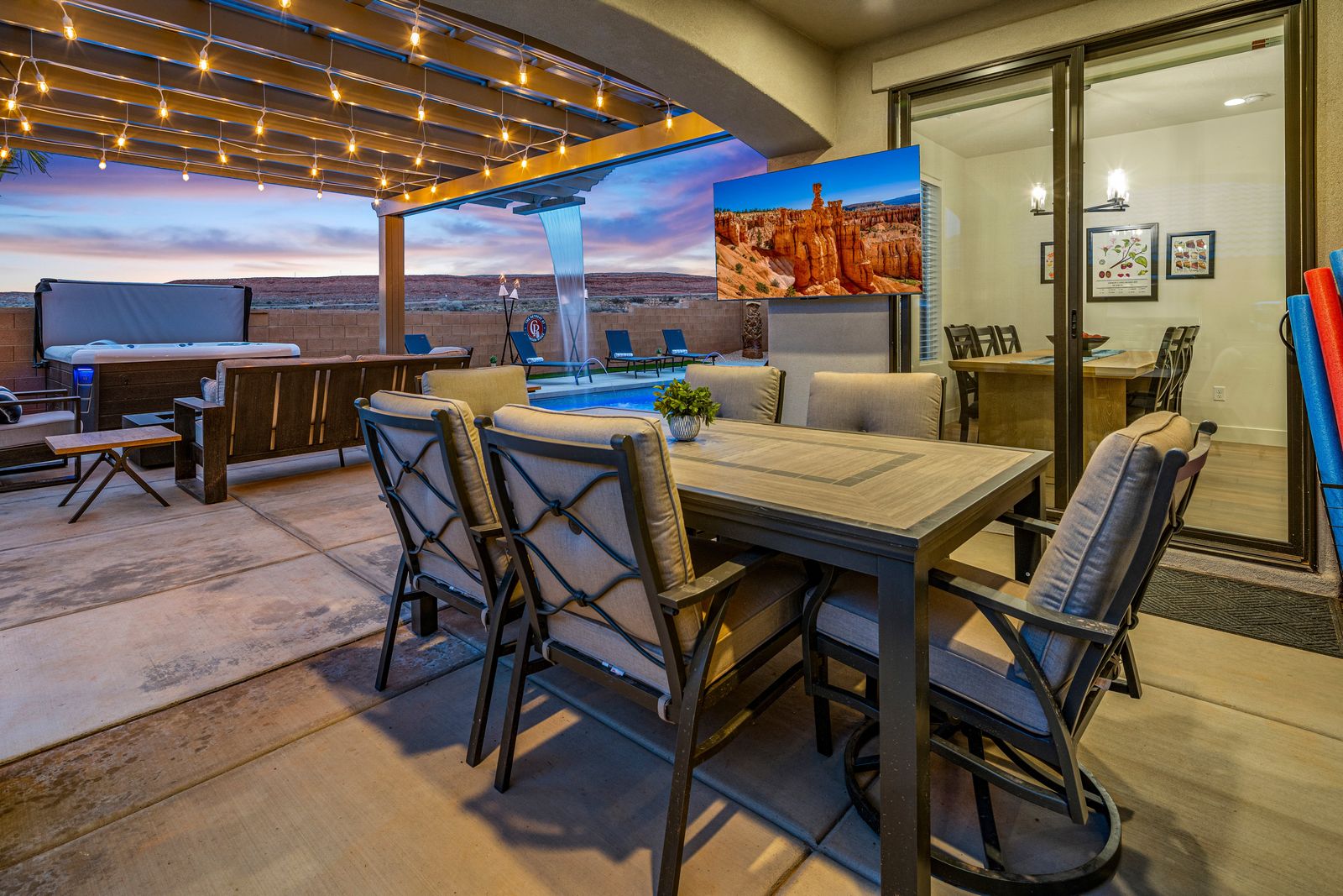 Private Amenities:- Private backyard with a 6-ft pool, slide, hot tub, fire pit, water feature, outdoor seating, lounge chairs, Outdoor Tv, and putting green