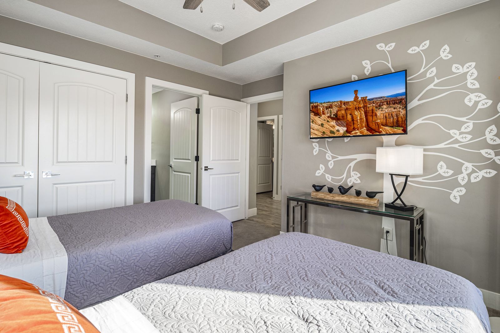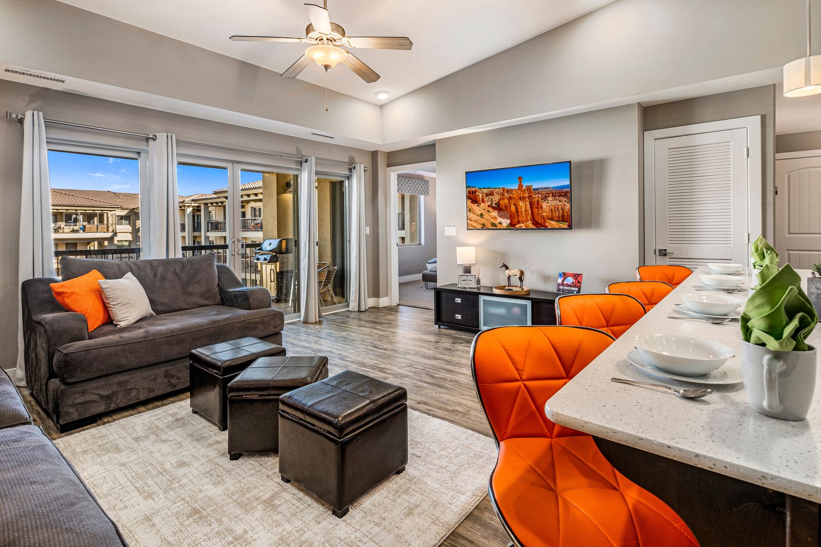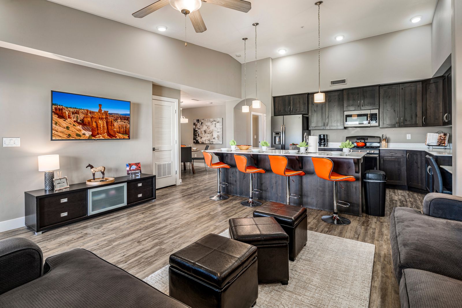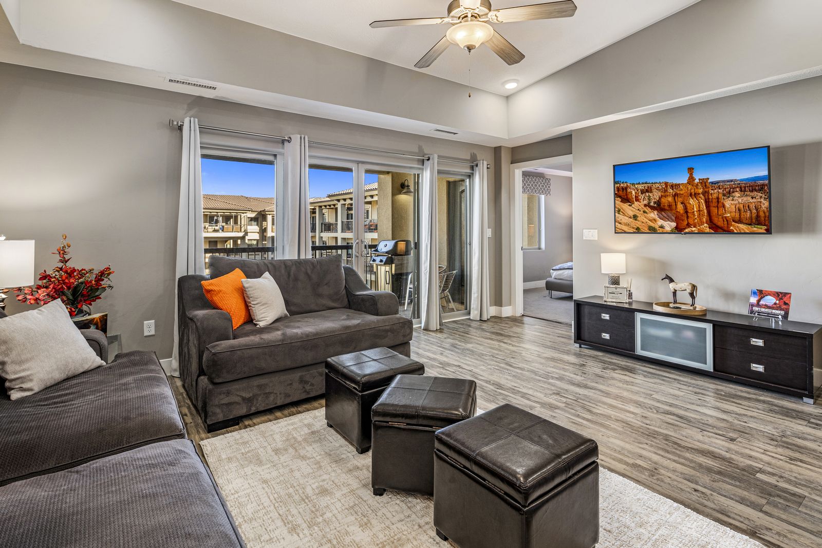 Step into a chic, top-floor, three-bedroom condo in the beautiful Estancia Resort—your perfect home base for adventure and relaxation! This newer complex is a paradise for outdoor enthusiasts, with trails right outside your door for biking, hiking, and ATV rides. Plus, you're just a stone's throw away from world-class golfing, luxurious spas, and the natural wonders of Zion National Park, Snow Canyon State Park, and Sand Hollow Lake.