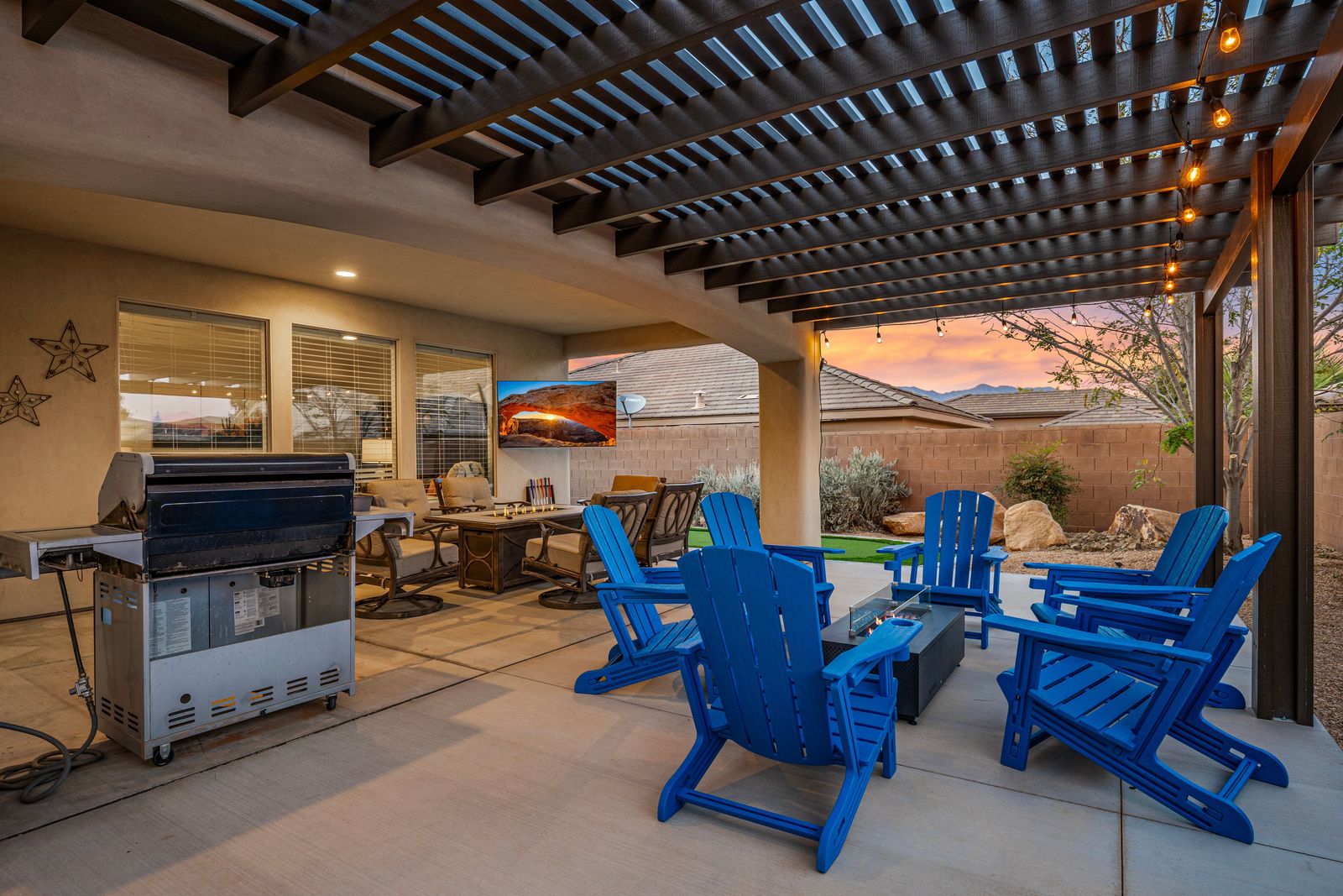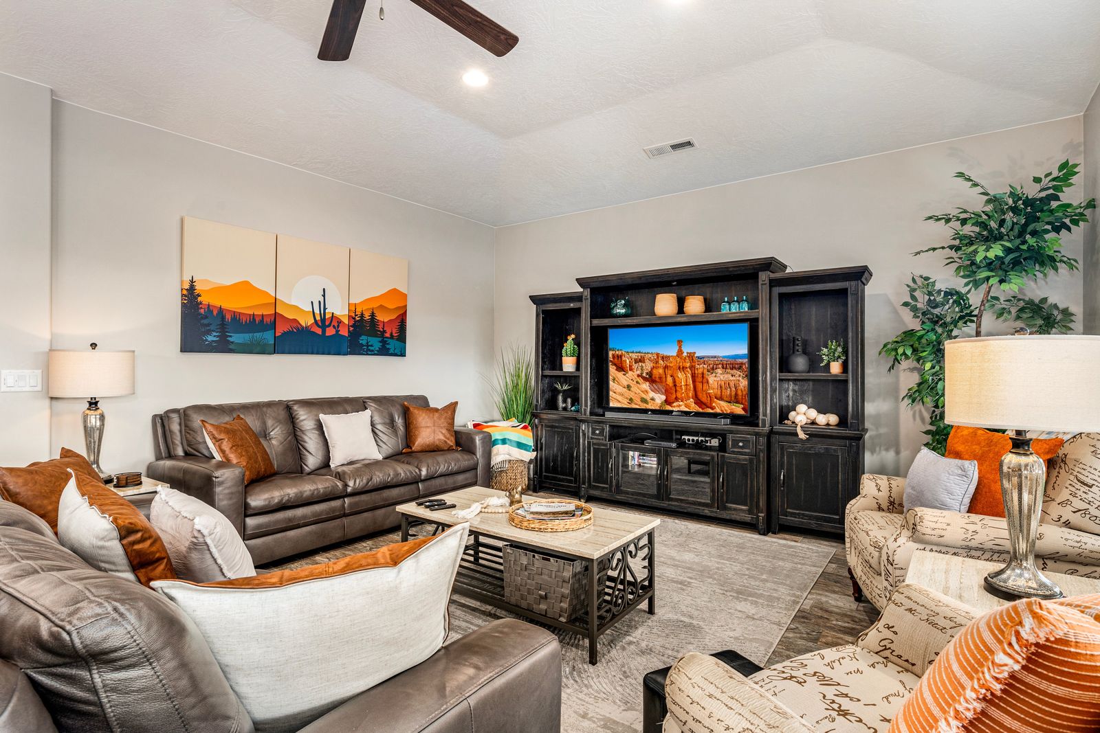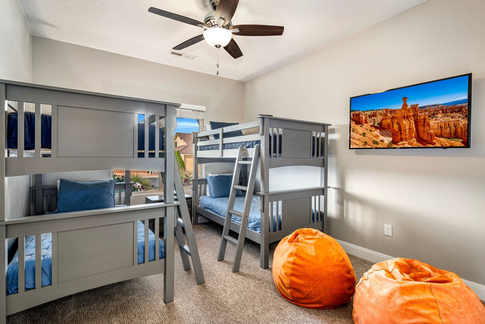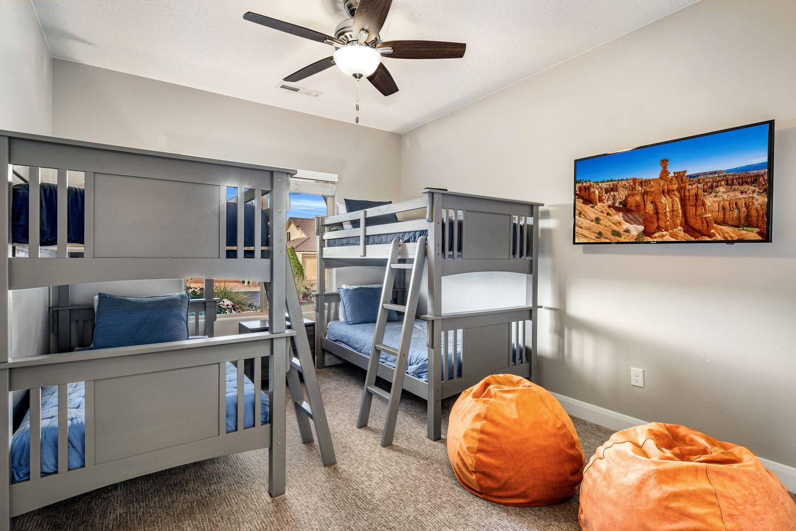 At our exquisite 4-bedroom, 2.5-bath vacation home, comfort and convenience awaits. The master bedroom offers a king-sized bed, complete with a dedicated work area and a smart TV for your entertainment needs. Enjoy the luxurious soaking tub or rejuvenate in the separate shower, creating a serene oasis within your own space. Both queen bedrooms provide a cozy retreat, each featuring its own smart TV, allowing you to unwind and relax to your heart's content. One of the queen rooms conveniently connects to a half bathroom, ensuring added privacy and convenience. For the little ones or the young at heart, our bunk room boasts two twin over twin bunk beds, perfect for creating lasting memories and a sense of adventure. Gather in the inviting living room, where a smart TV awaits to entertain you with movies and shows. Prepare culinary delights in our fully stocked kitchen, equipped with everything you need to unleash your inner chef. Step outside and unwind in our outdoor seating area, where you can enjoy the fresh air and relax in comfort. Whether it's morning coffee or an evening barbecue, our outdoor space provides the ideal setting to soak up the surroundings and create lasting memories.