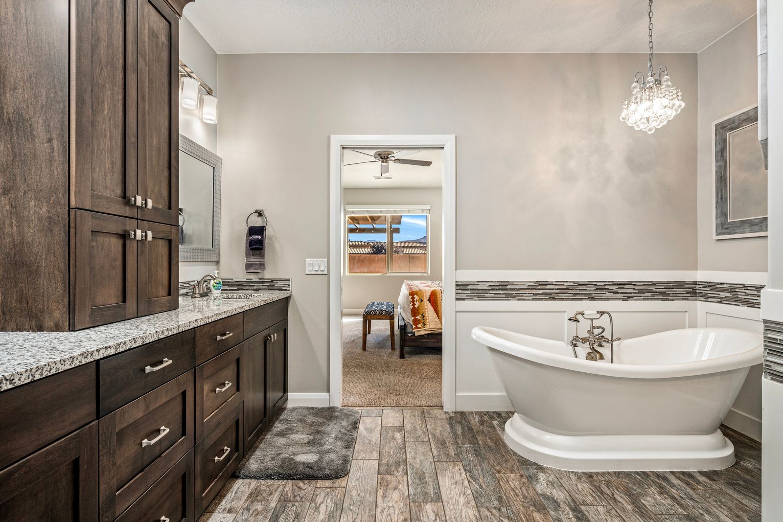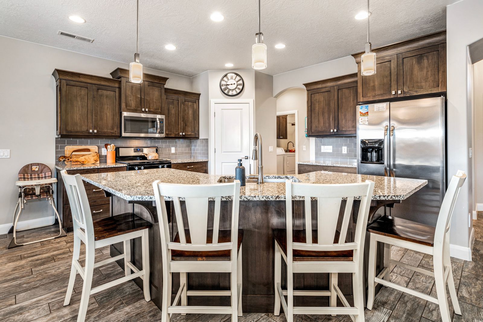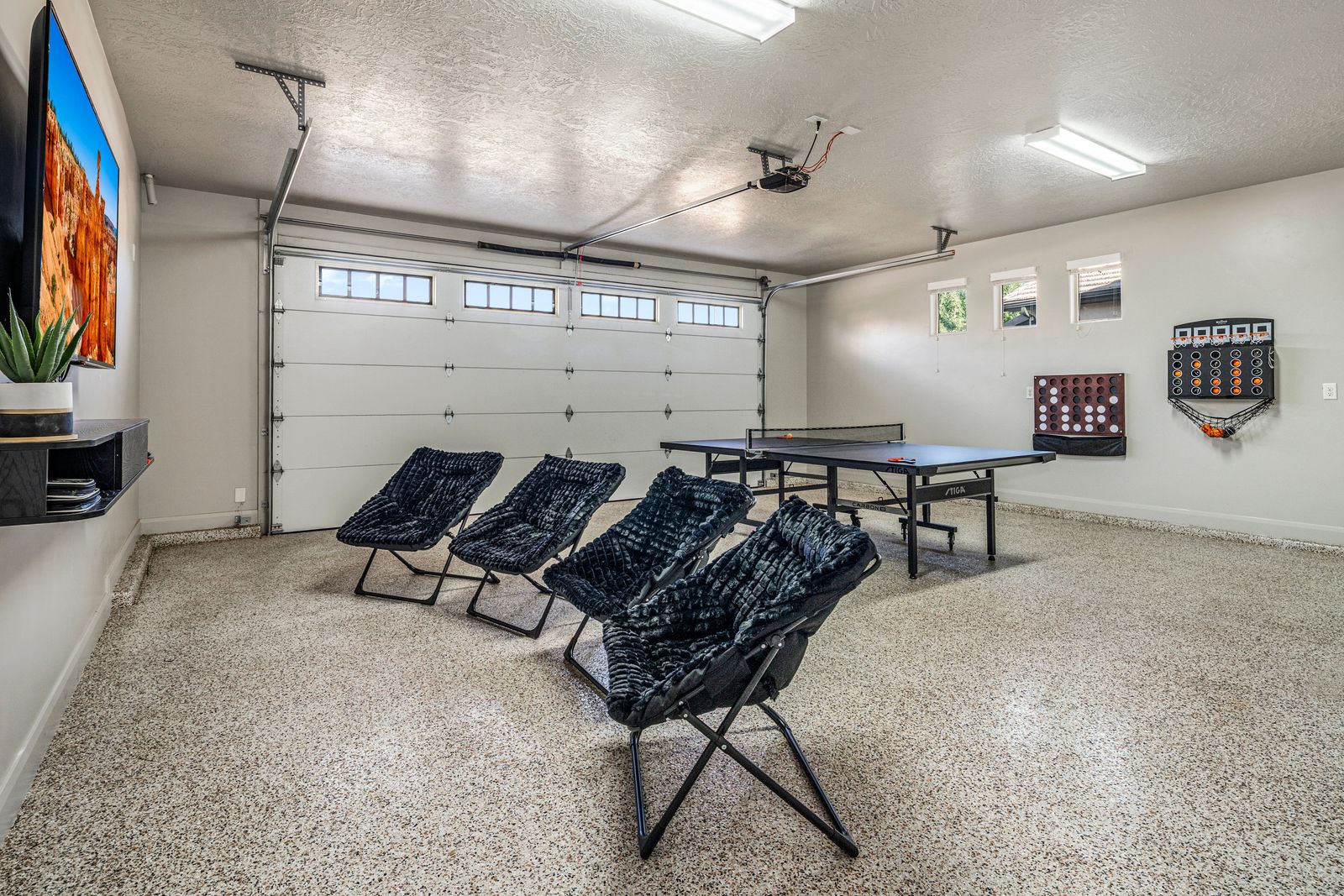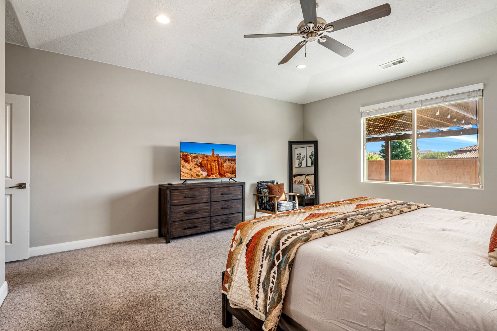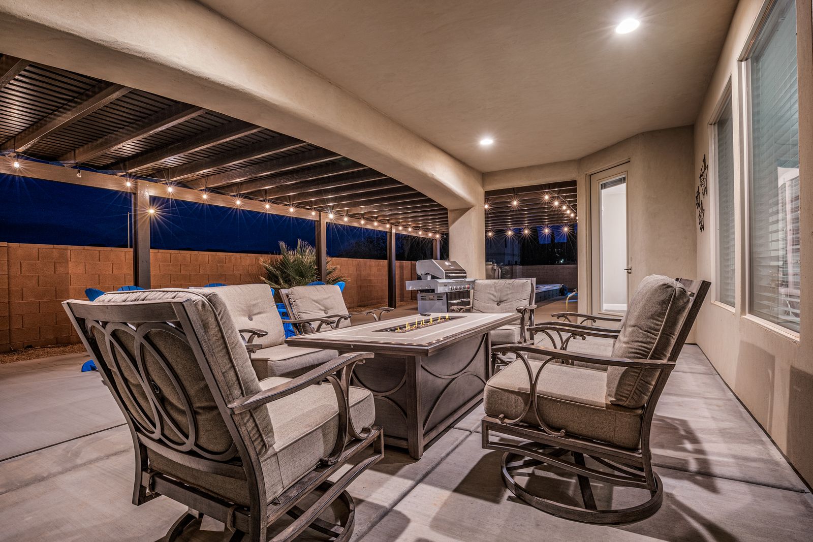 At our exquisite 4-bedroom, 2.5-bath vacation home, comfort and convenience awaits. The master bedroom offers a king-sized bed, complete with a dedicated work area and a smart TV for your entertainment needs. Enjoy the luxurious soaking tub or rejuvenate in the separate shower, creating a serene oasis within your own space. Both queen bedrooms provide a cozy retreat, each featuring its own smart TV, allowing you to unwind and relax to your heart's content. One of the queen rooms conveniently connects to a half bathroom, ensuring added privacy and convenience. For the little ones or the young at heart, our bunk room boasts two twin over twin bunk beds, perfect for creating lasting memories and a sense of adventure. Gather in the inviting living room, where a smart TV awaits to entertain you with movies and shows. Prepare culinary delights in our fully stocked kitchen, equipped with everything you need to unleash your inner chef. Step outside and unwind in our outdoor seating area, where you can enjoy the fresh air and relax in comfort. Whether it's morning coffee or an evening barbecue, our outdoor space provides the ideal setting to soak up the surroundings and create lasting memories.