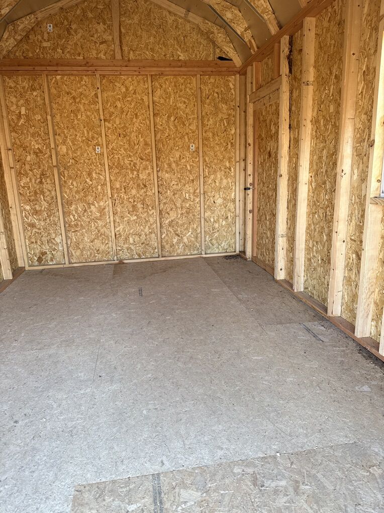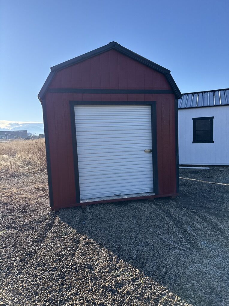 10x14 barn with high wall 8’ Rollup door 6’wide Can deliver Can add lift, shelves, solar power or other options if you would like.