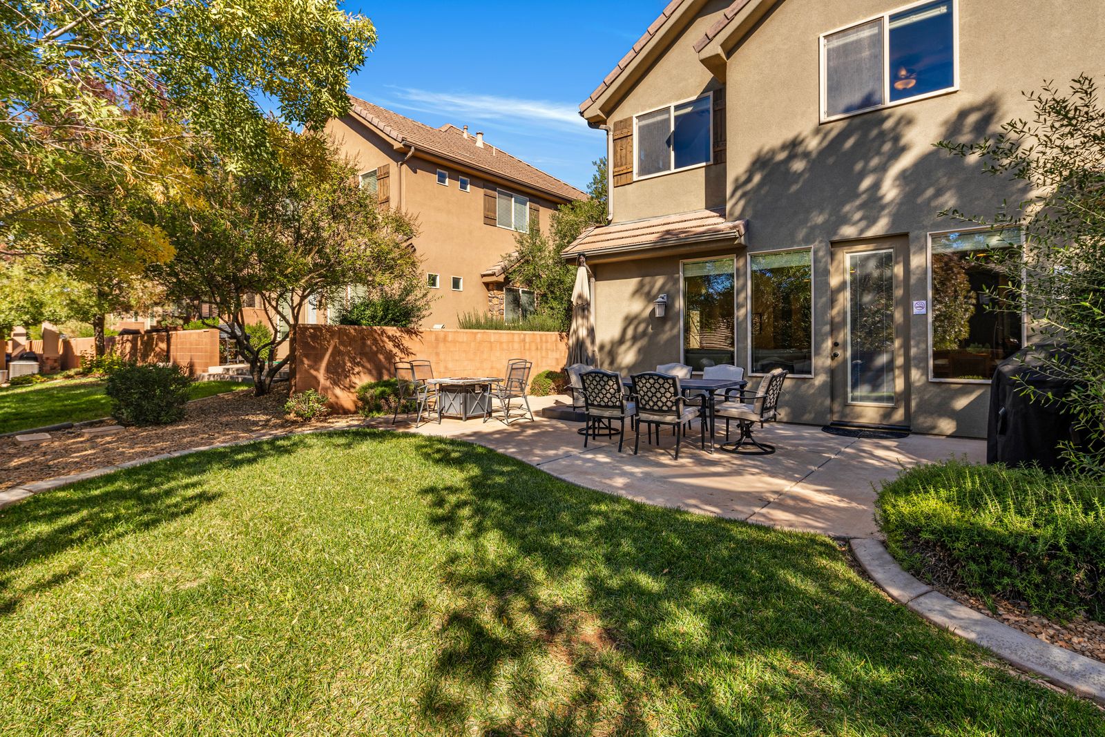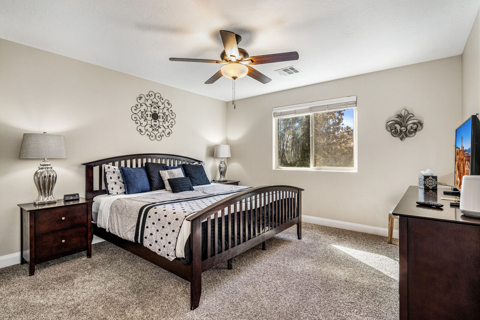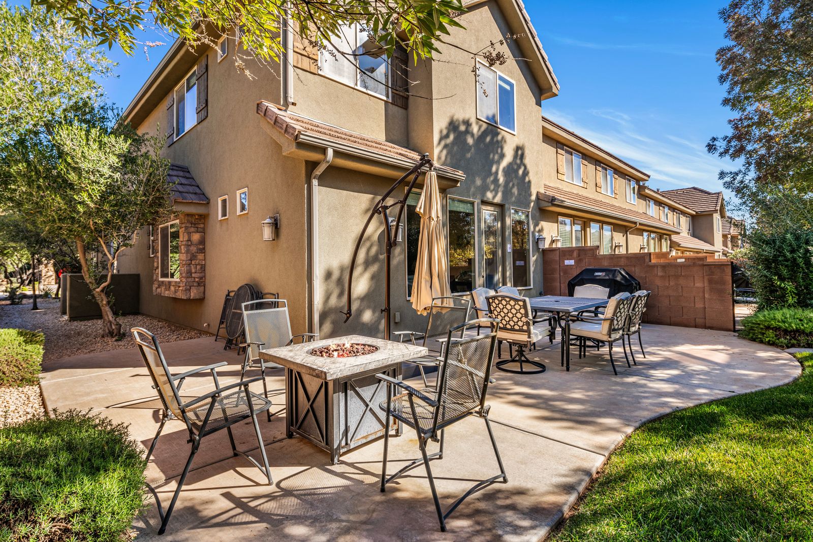 You’ll love the open layout featuring two master suites, each with a plush king bed and flat-screen TV. The third bedroom includes a twin-over-full bunk with a twin trundle, perfect for kids or extra guests. The upstairs loft offers even more room to unwind, with a cozy queen-size leather sofa sleeper and two additional fold-out twin mattresses for flexible sleeping options. The fully stocked kitchen has everything you need to whip up your favorite meals, complete with granite countertops, modern appliances, and seating for up to 10 guests between the dining table and island. After dinner, gather in the inviting living room or loft for movie nights, board games, or puzzles, we’ve provided a few of our favorites! Step out into your semi-private backyard, a rare treat in St. George! With a grassy area, gas BBQ, outdoor dining table, comfy seating, and a cozy gas fire table, it’s the perfect space to dine al fresco or relax under the stars. We can’t wait for you to experience Coral Ridge, your perfect home base for sunshine, adventure, and relaxation in beautiful St. George!