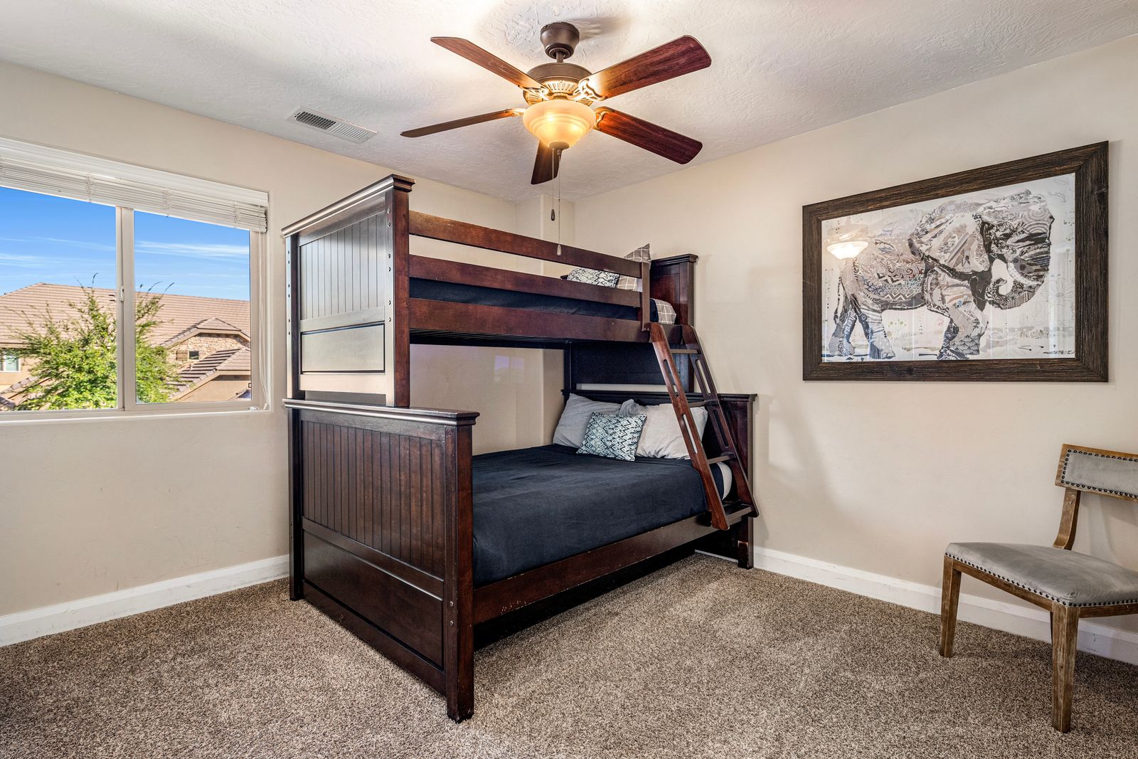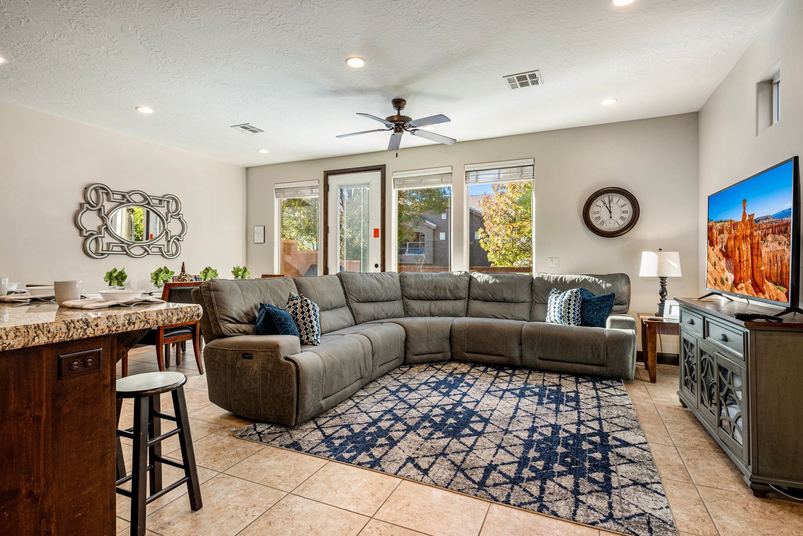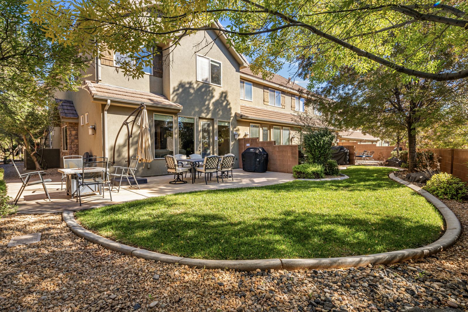 You’ll love the open layout featuring two master suites, each with a plush king bed and flat-screen TV. The third bedroom includes a twin-over-full bunk with a twin trundle, perfect for kids or extra guests. The upstairs loft offers even more room to unwind, with a cozy queen-size leather sofa sleeper and two additional fold-out twin mattresses for flexible sleeping options. The fully stocked kitchen has everything you need to whip up your favorite meals, complete with granite countertops, modern appliances, and seating for up to 10 guests between the dining table and island. After dinner, gather in the inviting living room or loft for movie nights, board games, or puzzles, we’ve provided a few of our favorites! Step out into your semi-private backyard, a rare treat in St. George! With a grassy area, gas BBQ, outdoor dining table, comfy seating, and a cozy gas fire table, it’s the perfect space to dine al fresco or relax under the stars. We can’t wait for you to experience Coral Ridge, your perfect home base for sunshine, adventure, and relaxation in beautiful St. George!