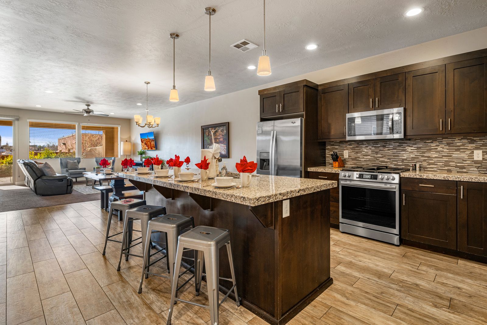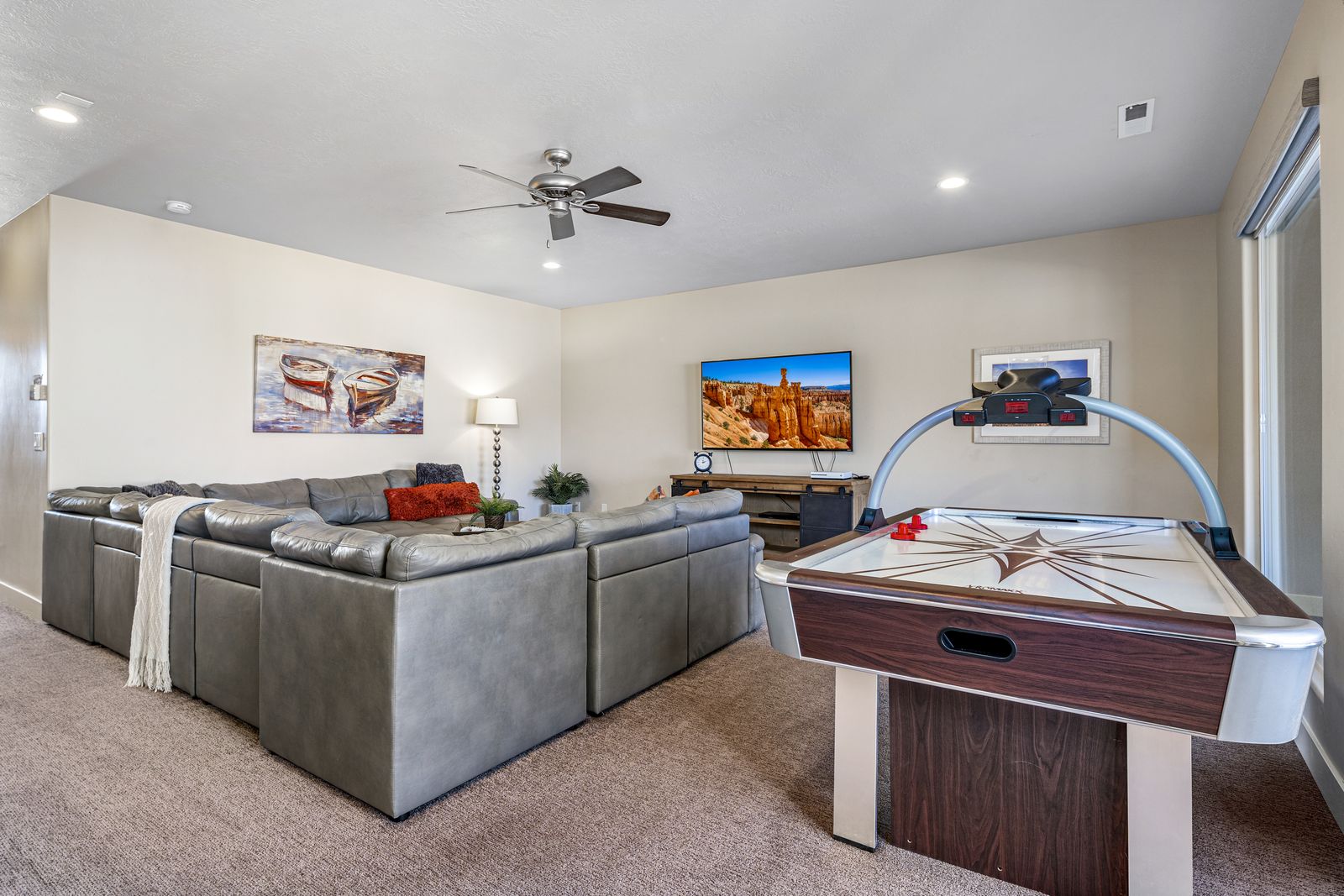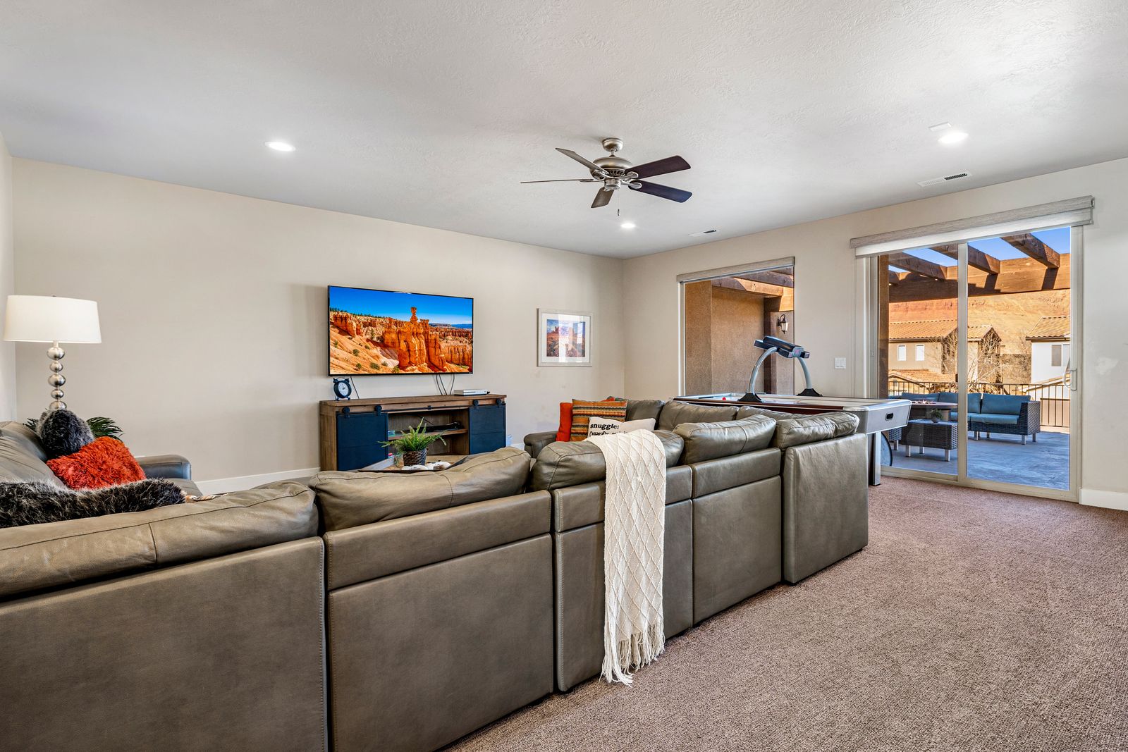 Inside, Sunset Haven combines comfort and entertainment, offering something for everyone. The home features spacious living areas and a fully-equipped kitchen, perfect for creating meals together. For those looking to unwind indoors, enjoy hours of fun with the provided Xbox 360, ping pong table, and air hockey table – ideal for family game nights or friendly competitions. The extended back patio is perfect for outdoor dining, with a dedicated space for enjoying meals al fresco, along with a gas BBQ for grilling up your favorite dishes. If you’re an avid cyclist, you’ll love the nearby bike trails, which provide some of the best biking in the region, with stunning views around every turn. After a day of exploring, cool off with a refreshing swim in the nearby community pool, or relax in your own private backyard oasis. Whether hosting a large family gathering, a reunion, or just a special retreat with friends, Sunset Haven offers an abundance of space and amenities to ensure a memorable stay. Sunset Haven is the perfect blend of relaxation and adventure, offering stunning views, incredible outdoor activities, and all the amenities you need to feel right at home in the heart of Southern Utah.