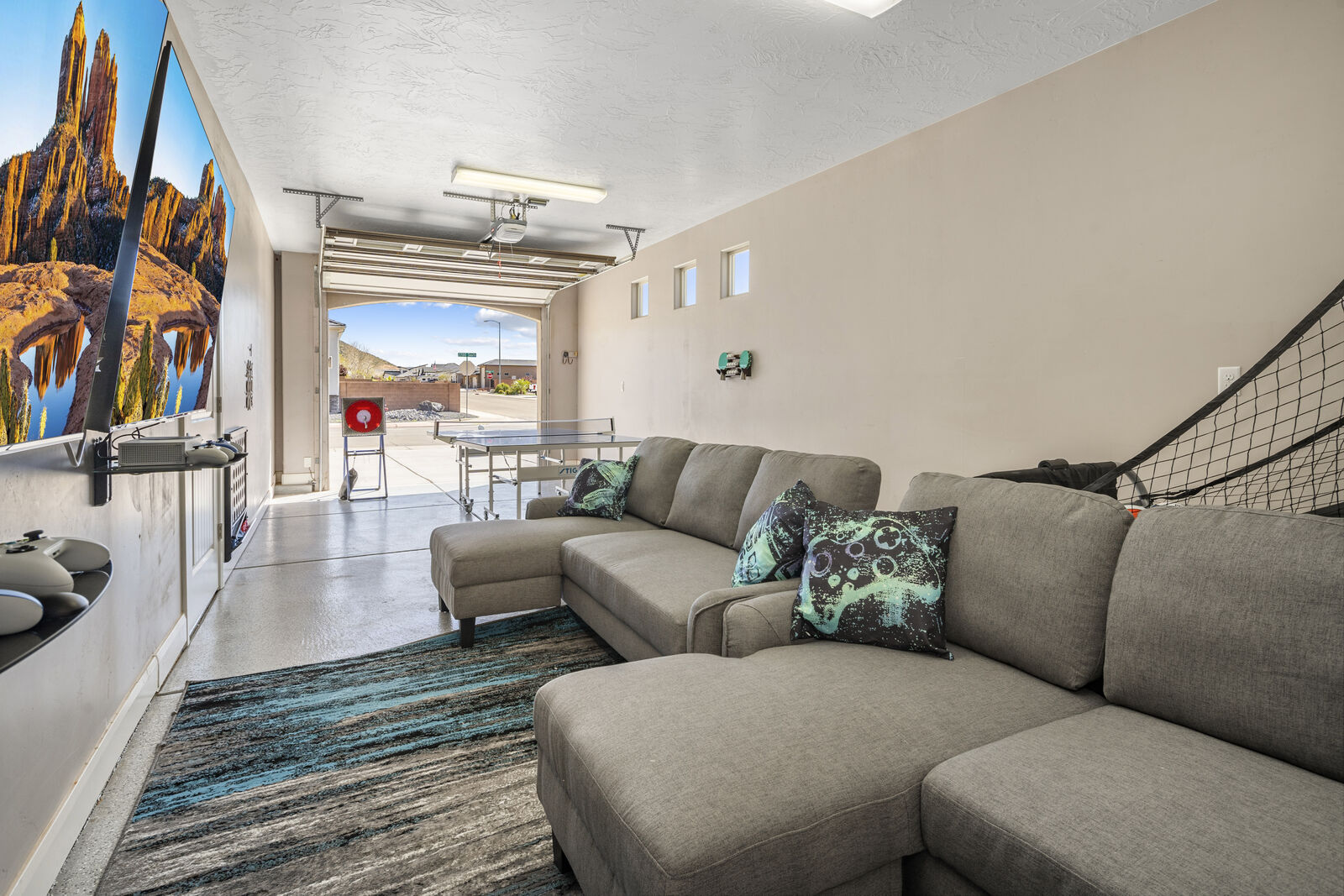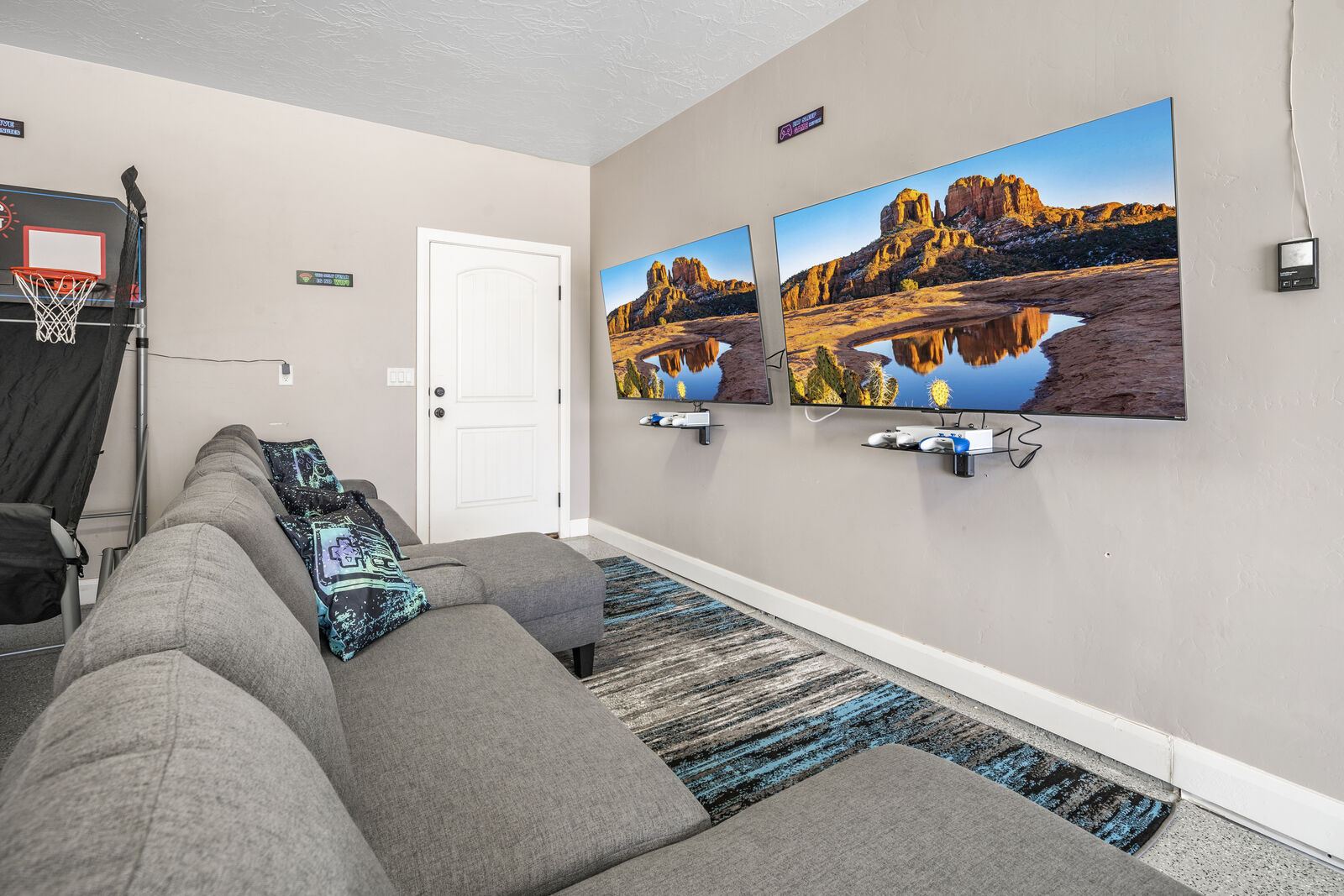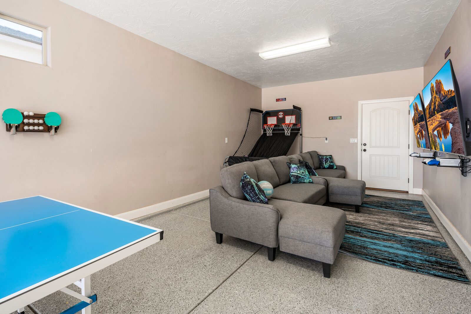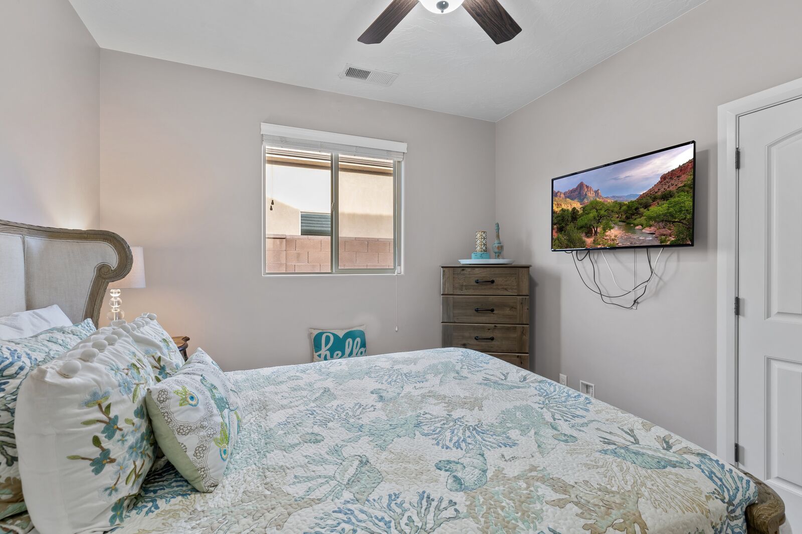 Splash is a beautiful 4 bedroom / 2.5 bath home that comfortably accommodates 10 guests. Wake up with a hot cup of coffee on the patio watching the sunrise over your private pool. Head out to Sand Hollow Reservoir for a day full of adventure; cliff jumping, paddle boarding, exploring the sand dunes, or renting a boat for the day are just a few examples of all the fun to be had! For a more relaxing day, grab a pool floatie and head out back to your private pool! The kids will love being able to splash around in the splash pad instead of fully submerged. With many lounge chairs, catching rays is enjoyable in or out of the water! The fully equipped kitchen, barbeque, indoor and outdoor seating make dinner parties for friends and family a breeze. Grab a cold drink and relax your tired muscles in your private hot tub as the sunset paints the sky an array of colors. Roast a few marshmallows around the fire out back under the starry night sky for a sweet treat! Wind down with a bowl of popcorn and cuddles on the couch, with a Smart TV and Dish, picking a movie everyone will love is simple. Whether you are adventuring at the Reservoir or relaxing pool side; timeless memories will be made at Splash!