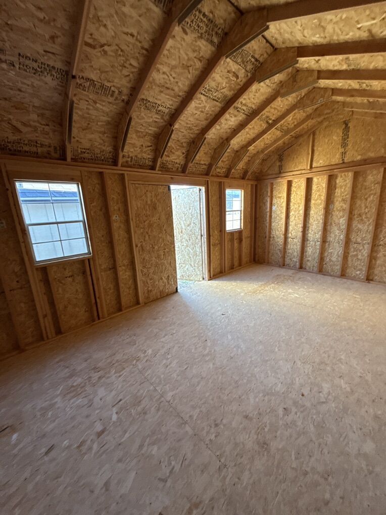 198 sqft side entrance barn Metal roof, and on skids can deliver Combination lock