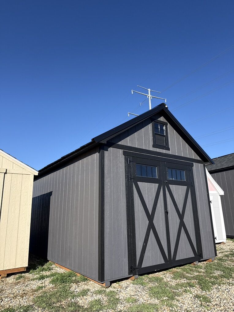 New, dark farmhouse style with steeper roof and six windows On skids and can deliver  Combination lock Ask about free lighting