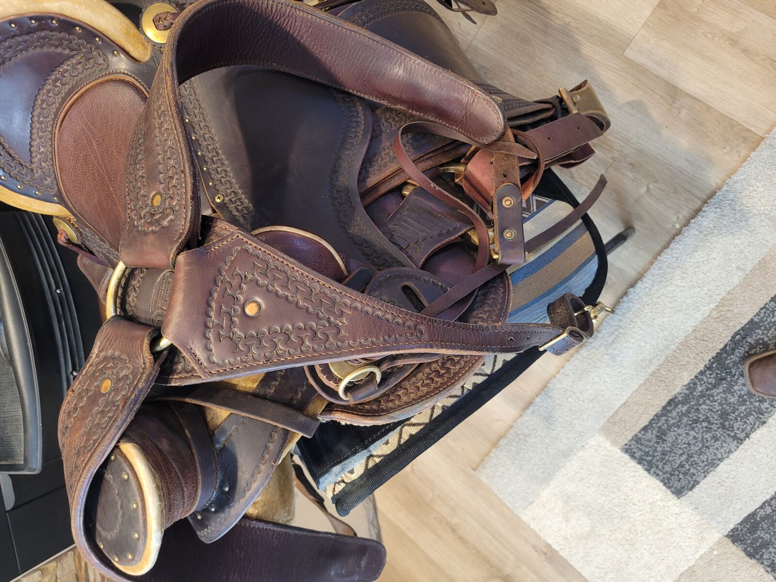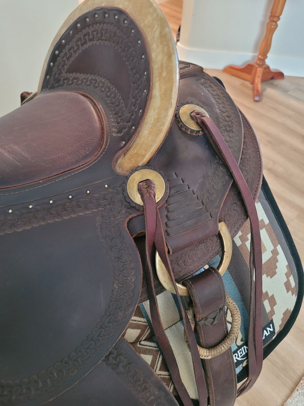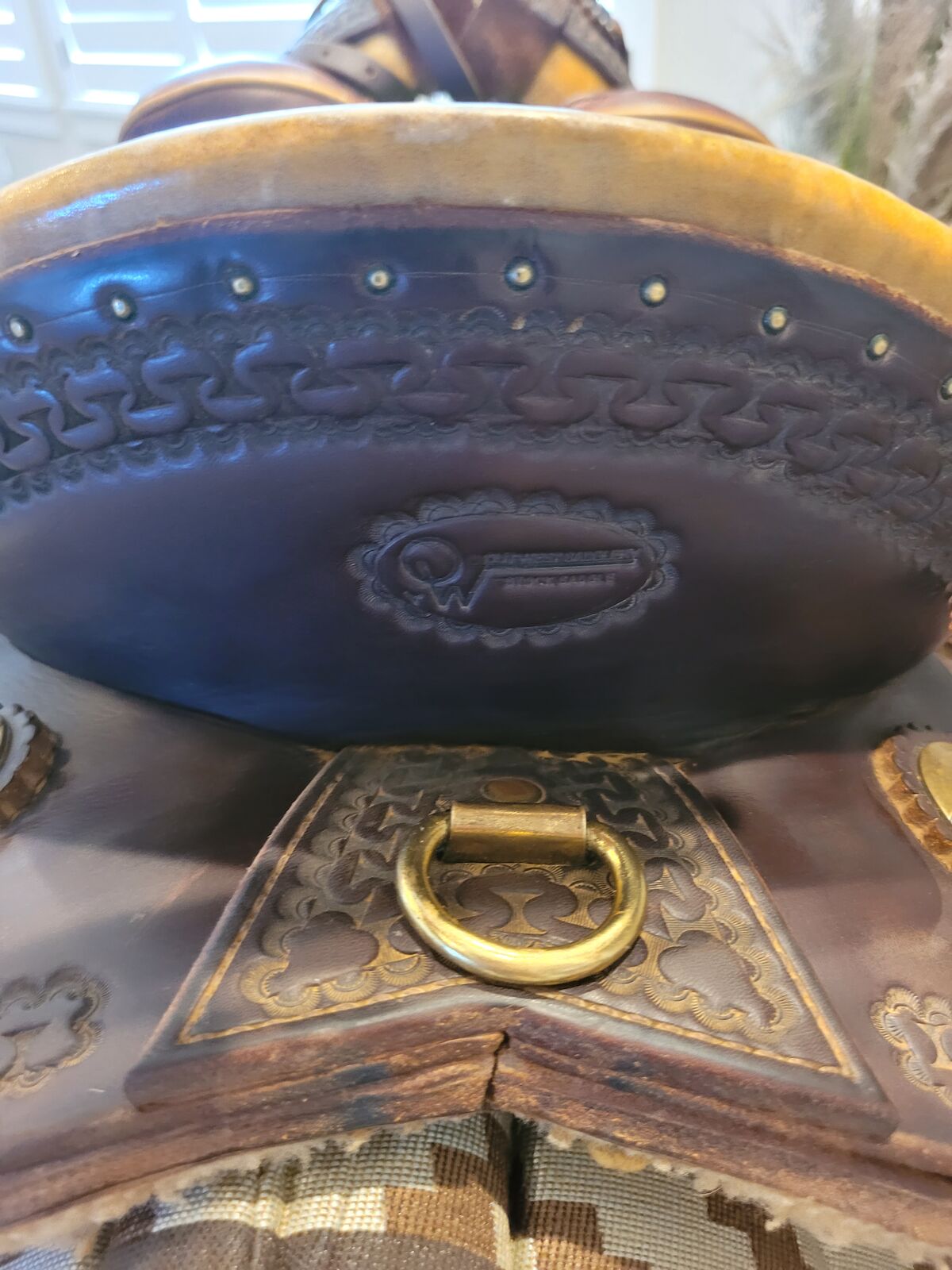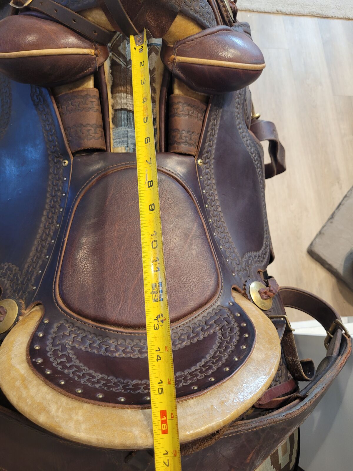 16" Seat, 20" Fenders, Wide Bar Angle 14 1/4" (wider than many western saddles), 8" H x 6 3/4" W Gullet. Dark Oiled Antique with Brass Hardware. conchos, horn wrap & Rawhide Braided/Covered Hobble Ring.