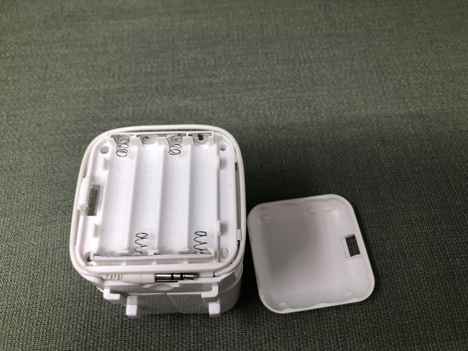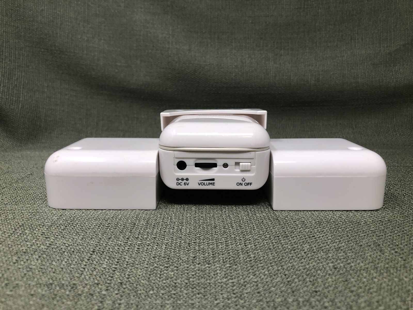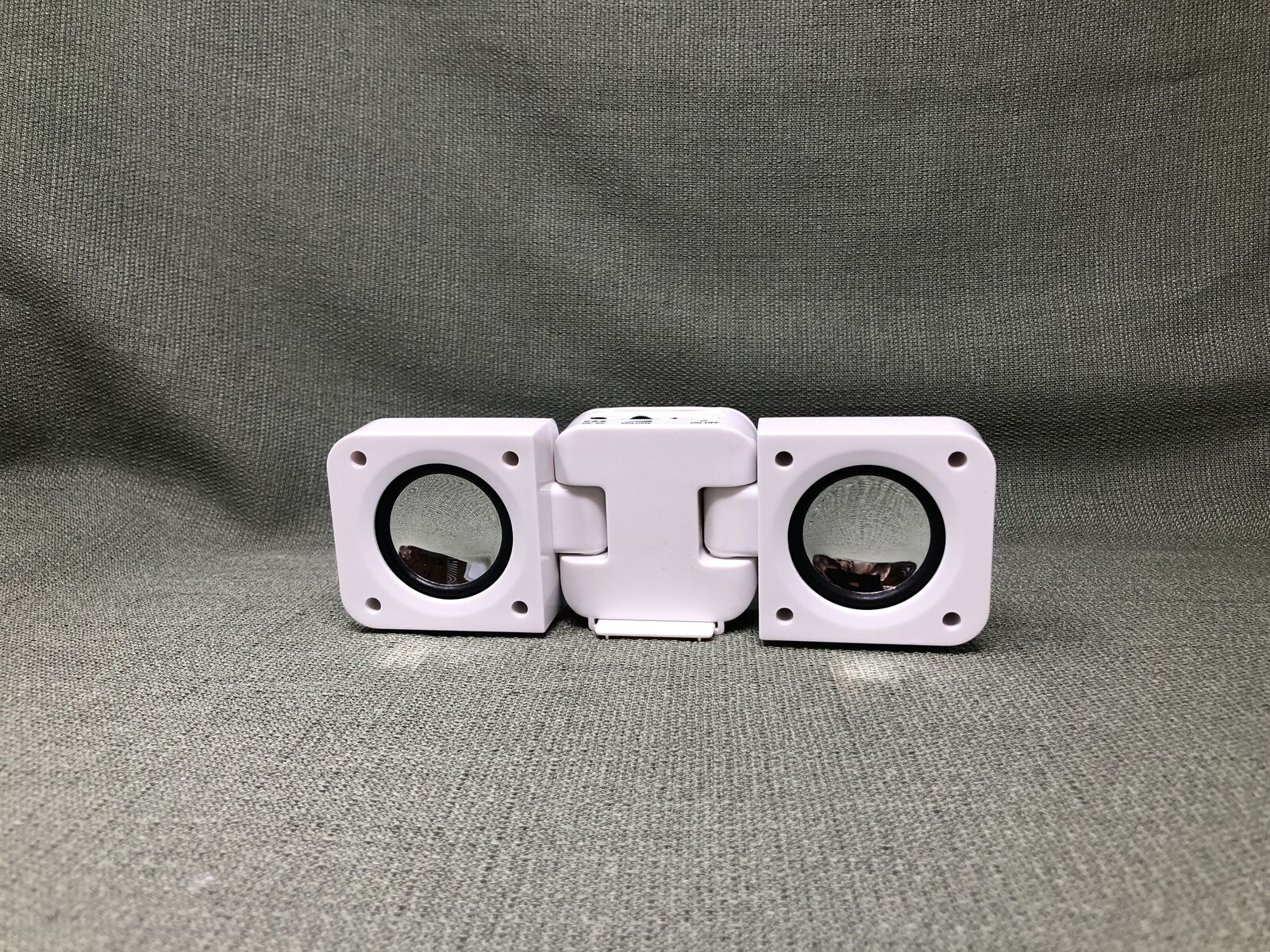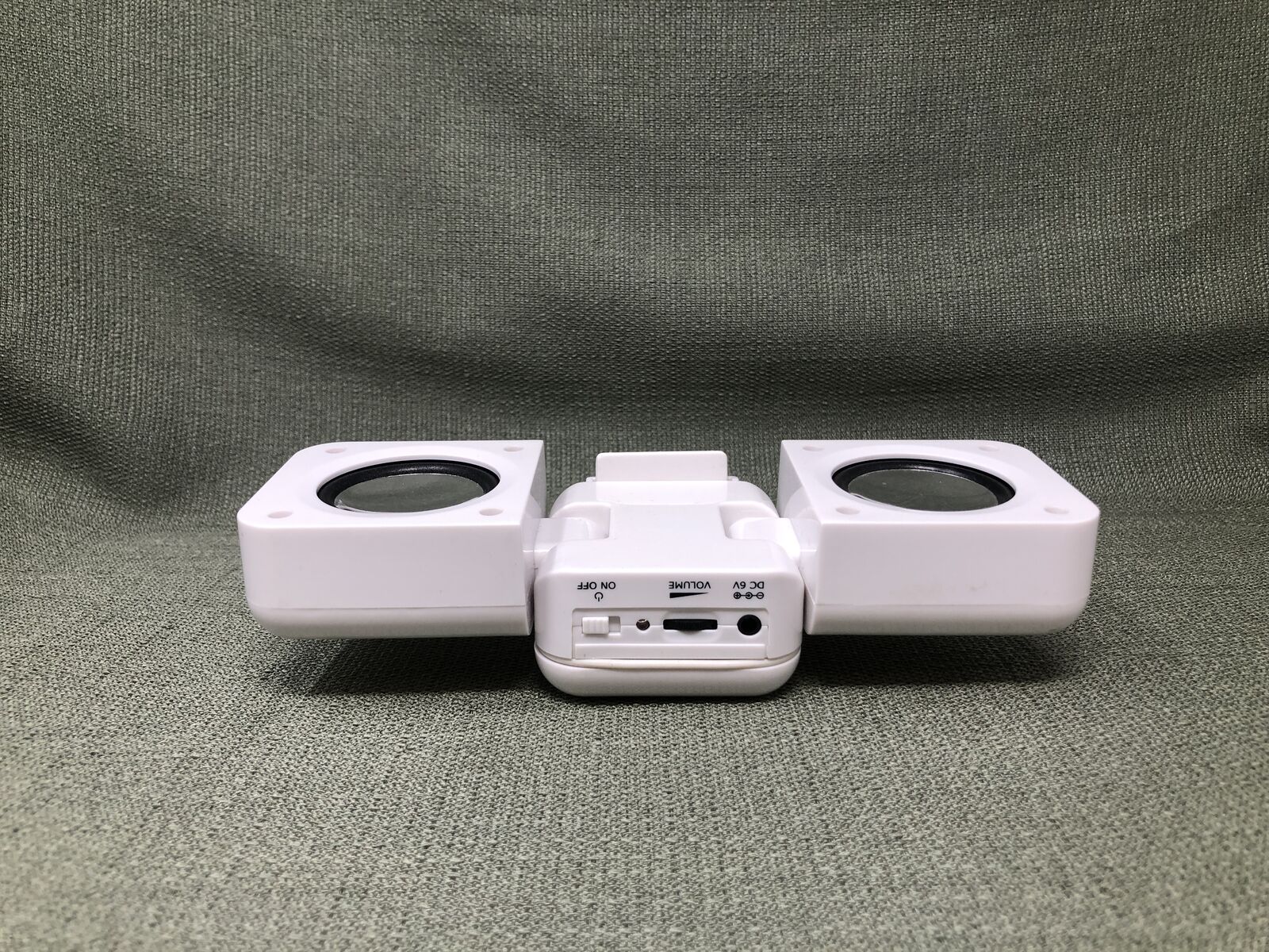 VenmoCompact white portable speaker with simple plug-in and battery-powered operation. Features an on/off switch, volume control, and DC 5V charging port. Lightweight and easy to move from room to room, making it great for home, office, dorm, or travel use. Minimalist design blends easily with any space.