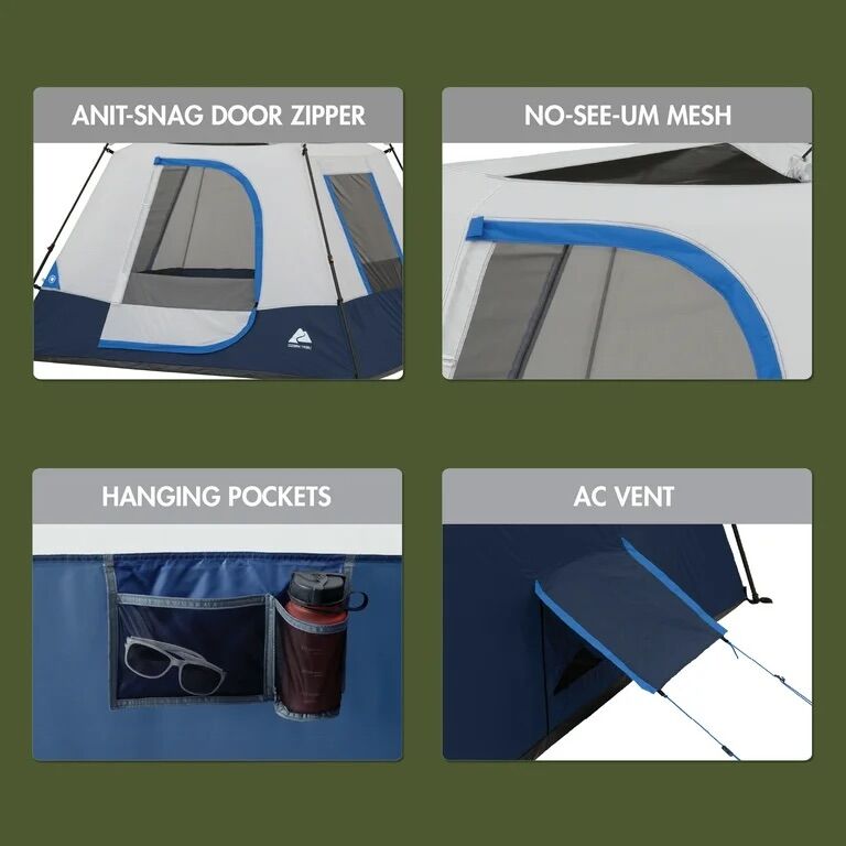 Features: • Quick 60-second setup with pre-attached poles • Built-in LED lighted hub (low / medium / high settings) • Spacious interior – fits 1 queen air mattress or 4 sleeping bags • Excellent ventilation – 3 mesh windows, adjustable AC vent, and electrical port • Weather-resistant – 1,200 mm PU coating with removable rainfly • Storage pocket for small items • Carry bag included for easy transport