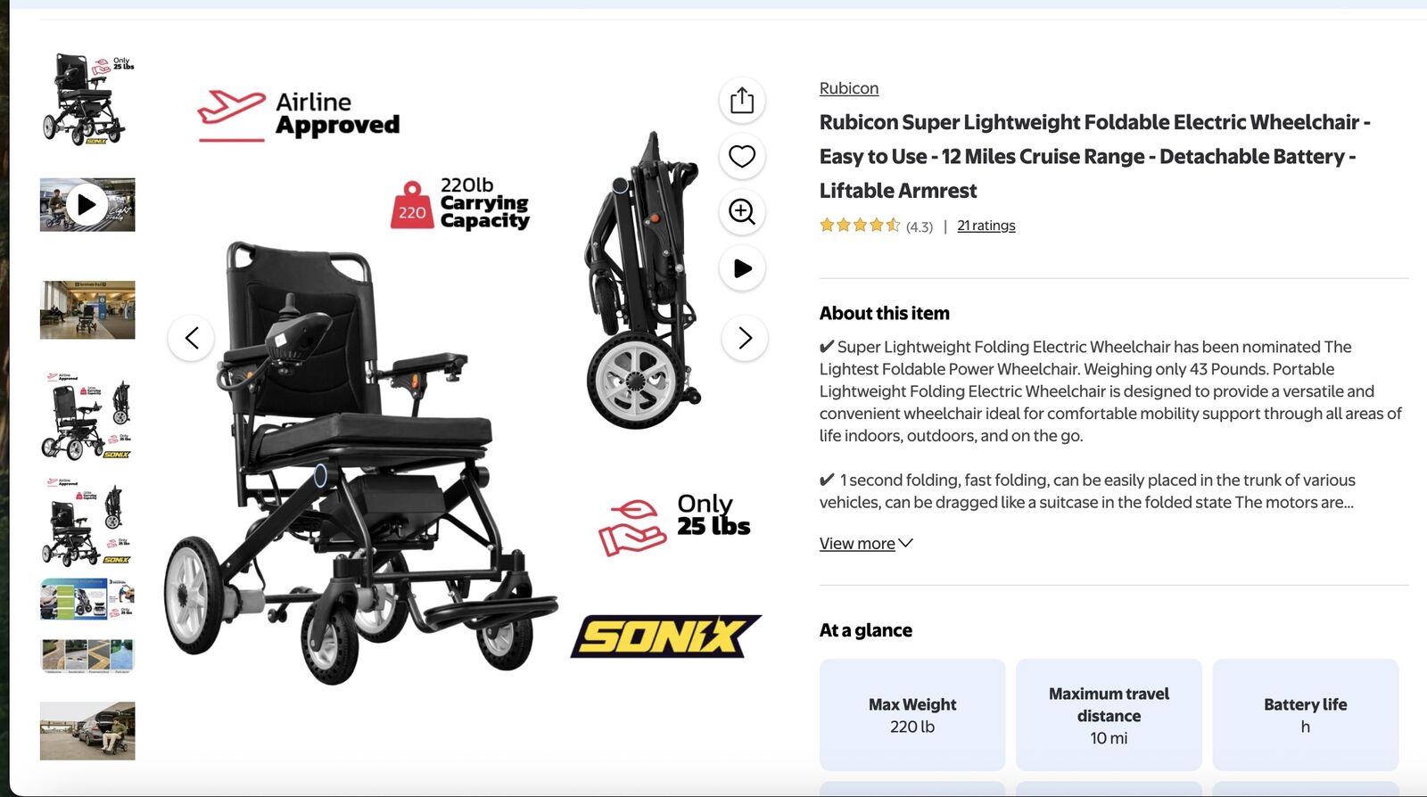 ApplePayRubicon Super Lightweight Foldable Electric Wheelchair 12 Miles Cruis Range Detachable Battery- Liftable Armrest. Weighing only 43 Pounds 1 second folding, fast folding, can be easily placed in the trunk of carious vehicles can be dragged like a suitcase in the floded state. max Weight 220 lbs / Maximum travel distance 10 miles / Seat width 18in / Weight 25lbs / Power type Battery / Max Speed 4mph / Rear-Wheel Drive.