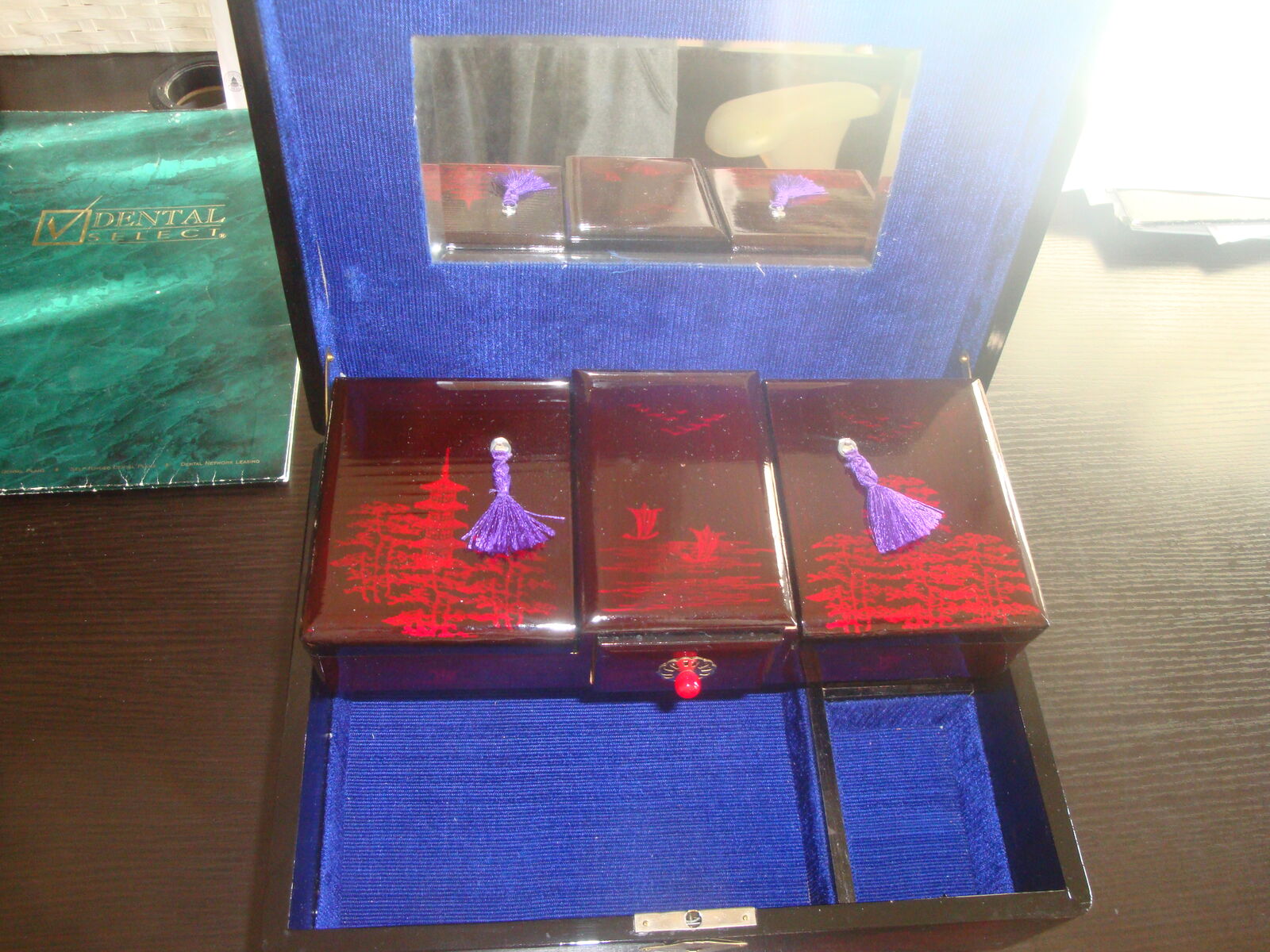 this is a beautiful aisian style jewelry box that also plays music. is over 90 years old and in perfect condition. velvet compartments keeps jewels clean and scratch free. holds lots. $23 or best offer. Susan 801-875-2200