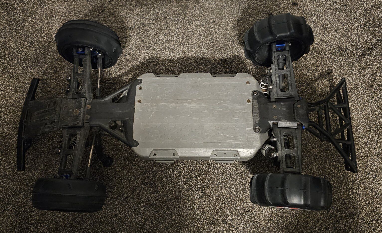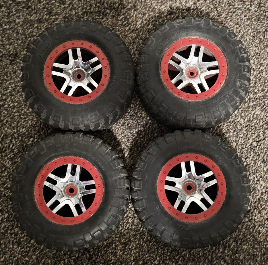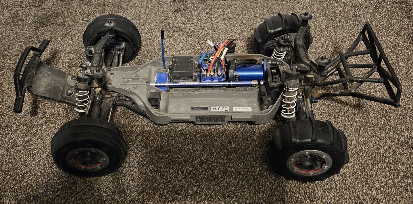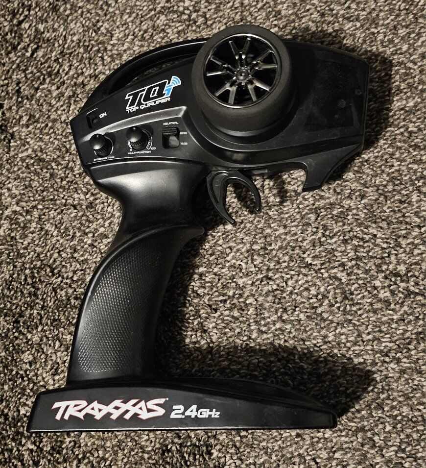 Traxxus Slash 4x4 in good condition, includes battery (no charger), paddle tires, original tires, and remote control.