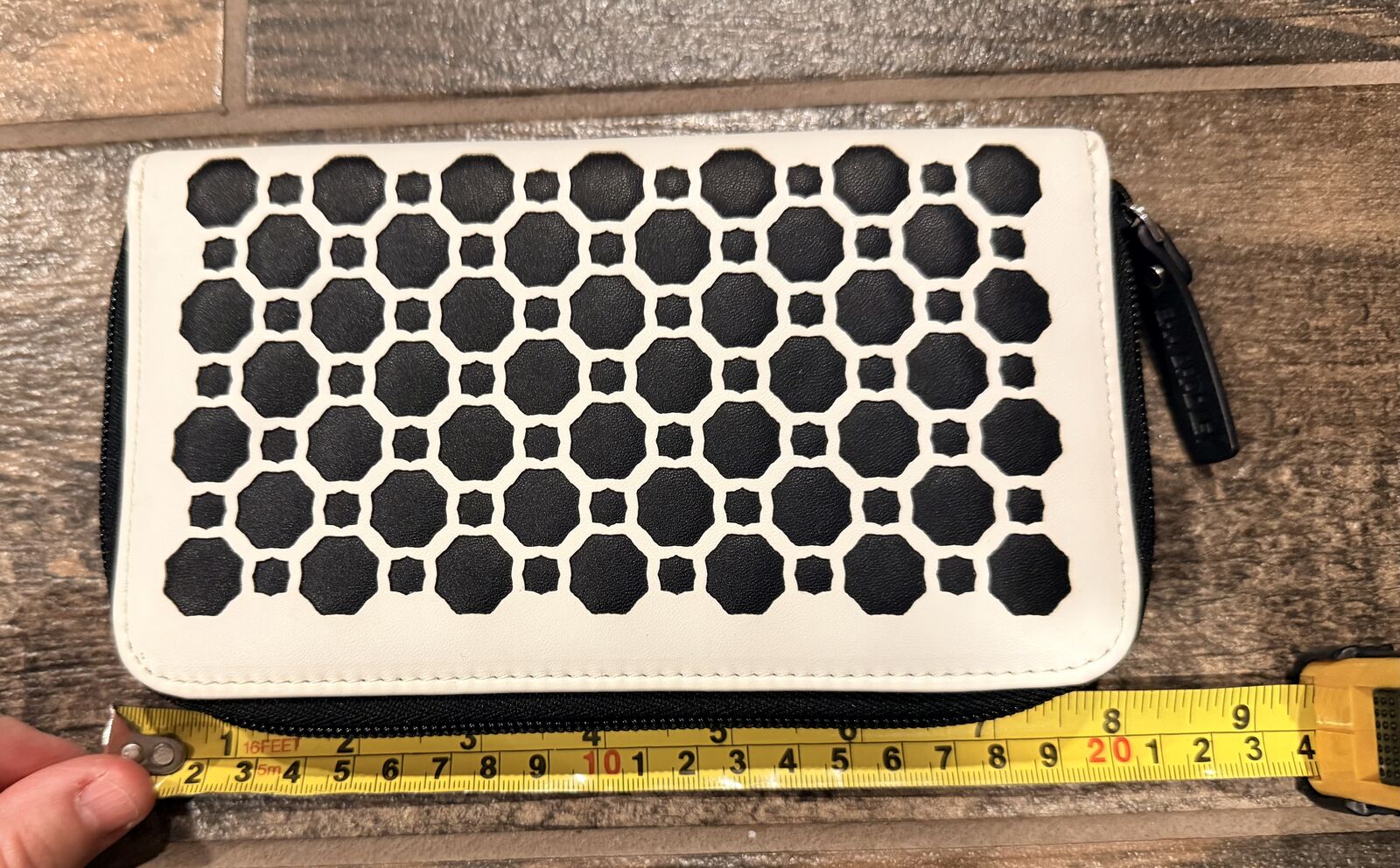 VenmoThis is a brand new Vera Bradley Laser-Cut Accordion Wallet in the Midnight Geometric pattern. It has a lot of places for cards. It zips up so it keeps everything securely inside. It is a fun pattern and color for wallet that goes with everything.