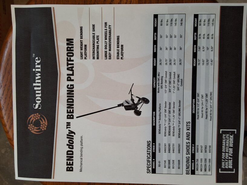 Southwire MBCCH-1000 and the BENDdolly platform. This bender is sized for 3/4" and 1" EMT. This manual bending platform bender is the BD1000E unit which includes the Bending Platform and the head kit (MBCCH-1000). This bender was purchased new and used on one job for a couple of weeks. I then was hired on an industrial job and didn't need it. I paid $1500 for this bender.
