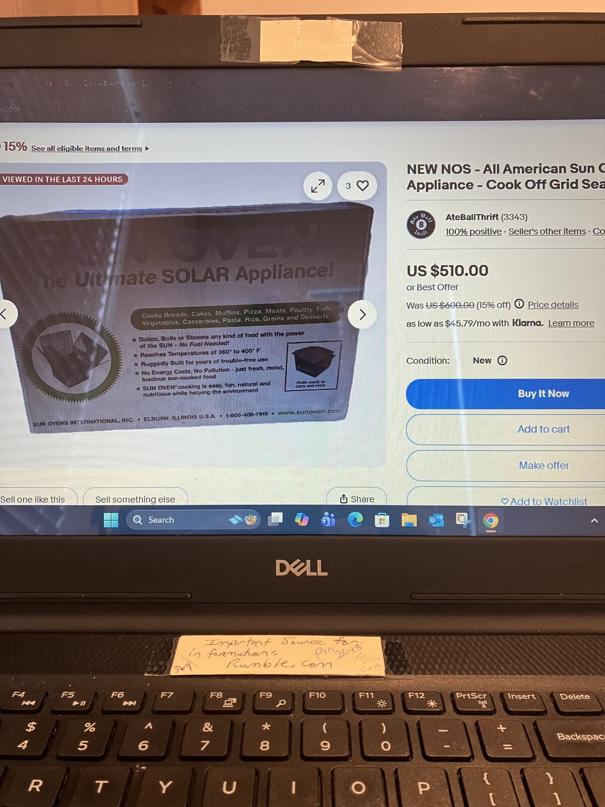 VenmoSUN OVEN. NEVER USED AND IN ITS ORIGINAL BOX. A SUN OVEN LETS YOU PREPARE MEALS ANYWHERE USING ONLY SUNLIGHT (SUMMER AND CLEAR DAYS IN WINTER). NO FLAMES, FUEL OR EMISSIONS, MAKING IT A SAFE, SUSTAINABLE, AND COST FREE WAY TO COOK. THIS SUN OVEN REACHES TEMPERATURES OF UP TO 400F, AND IT HAS A LARGE CHAMBER AND CAN COOK BREAD, CASSEROLES, TURKEY, CHICKEN ETC. MAKING IT PERFECT FOR HOME USE, CAMPING, HUNTING TRIPS OR EMERGENCY PREPAREDNESS. IT HAS COLLAPSIBLE REFLECTORS AND IS SELF CONTAINED FOR TRANSPORT AND SETUP. THESE SUN OVENS HAVE A RETAIL VALUE OF ANYWHERE FROM $449.00 TO $600.00 DEPENDING ON THE SELLER. I AM SELLING THIS SUN OVEN FOR ONLY $300.00....FIRM.