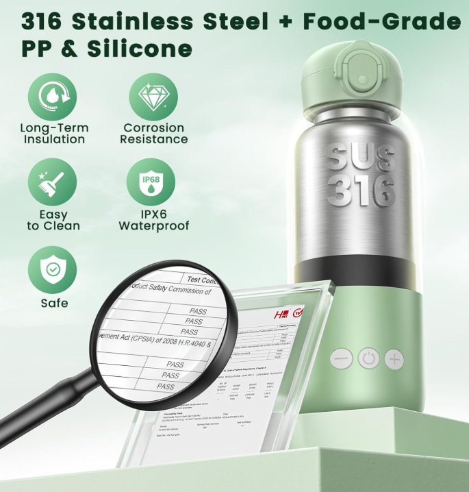 Zelle11400mAh Rechargeable Battery & Cordless ConvenienceEnjoy 12–15 warmings on a single charge for all-day readiness.USB-C fast charging powers up in just 2–3 hours, eliminating the need to find outlets. This Travel bottle warmer is ideal for travel, outdoor activities, and night feedings