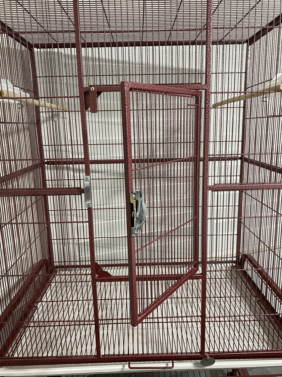PayPalLike-new condition except for a hairline crack in the plastic tray. Currently selling on Chewy.com for $200. Actual living space for the bird is 32" x 21" x 34" high. Total height is 62" but the cage can be separated from the rolling cart. The bottom grill and plastic tray are removable for easy cleaning. Includes 2 perches and 2 feeding dishes. A&E Cage Company calls this color burgundy, but it's more like red-burgundy with a distressed finish.