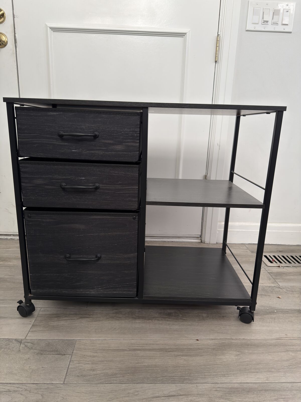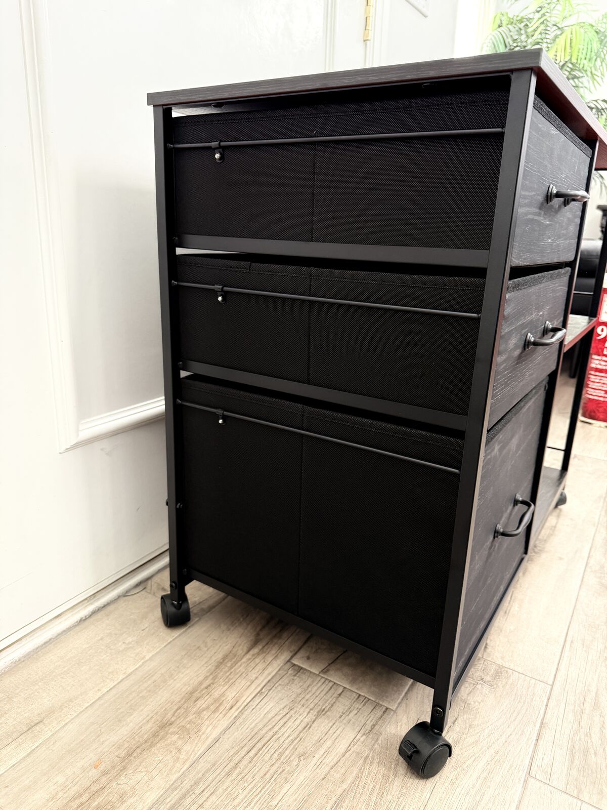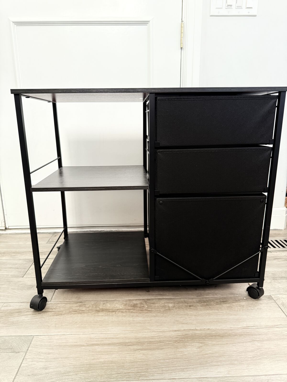 3 fabric drawers; bottom drawer is a filing cabinet.