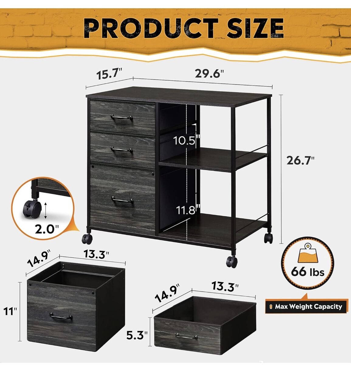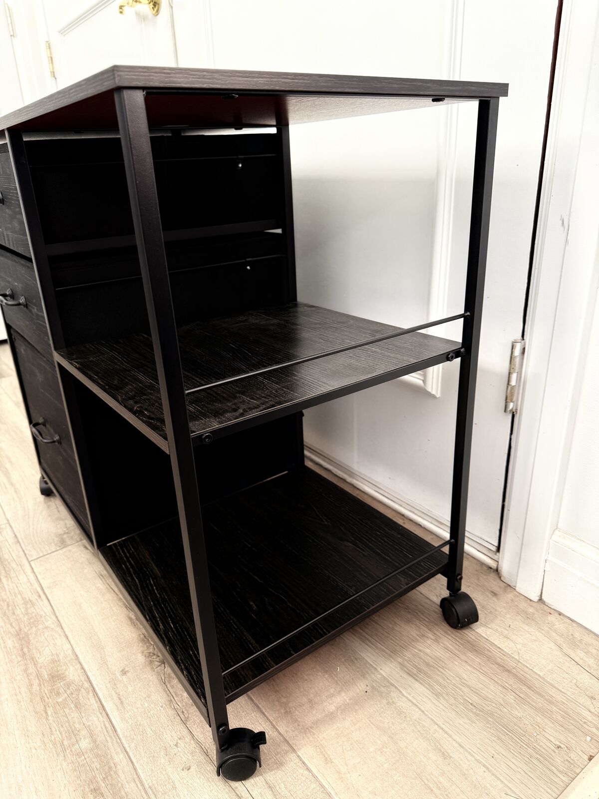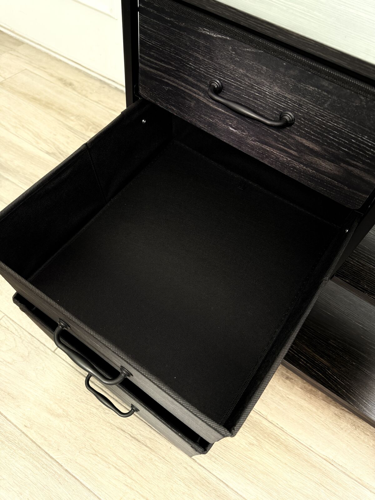 3 fabric drawers; bottom drawer is a filing cabinet.
