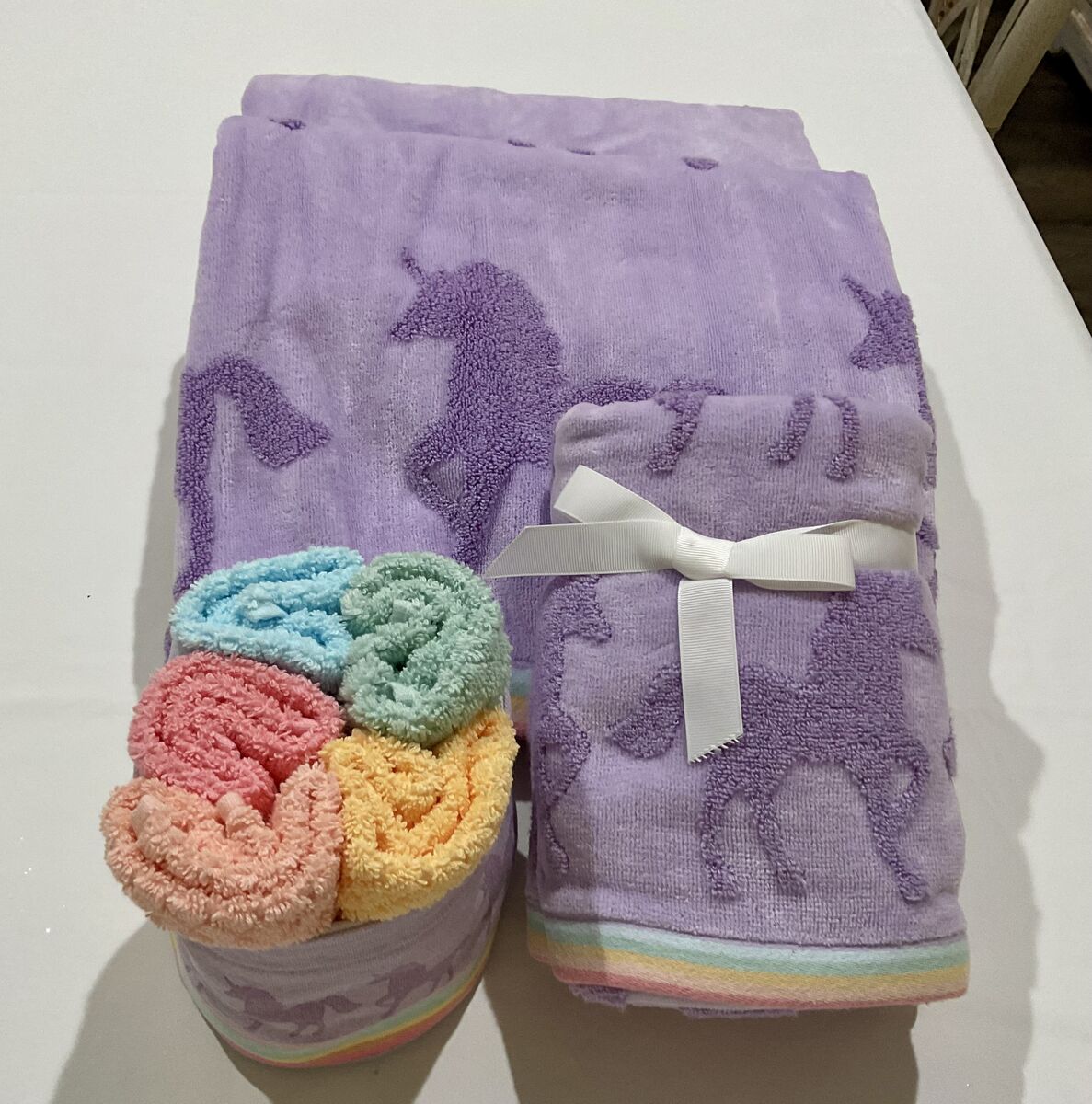 I purchased this set 2 bath towels 2 hand towels and 5 washrags with the holder for a gift and the girl already had a similar set and I forgot to return them. Ready for your horse or unicorn lover,