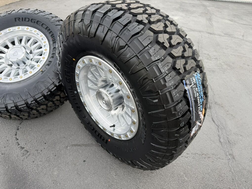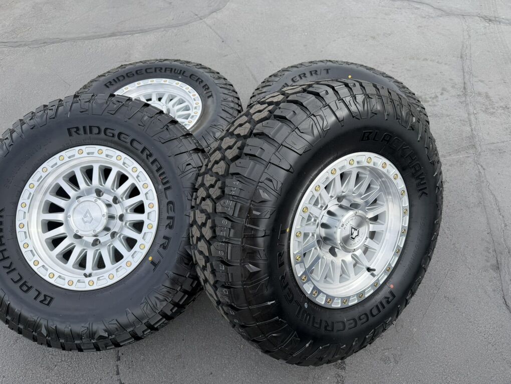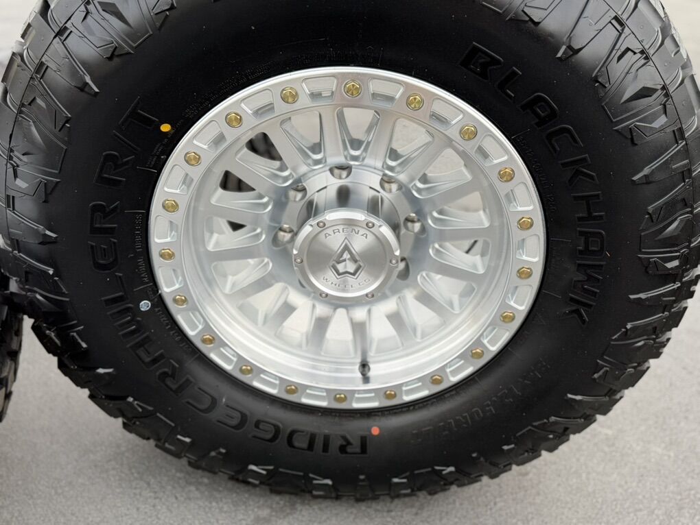 Brand new package! Silver Arena Trophy 17x9 00et offset wheels mounted and balanced on 35x12.50r17 Blackhawk RT Load E 10 ply. 8x170 bolt pattern these fit 1998 and newer Ford F-250 F-350 Superduty Powerstroke and Excursion. Huge savings!