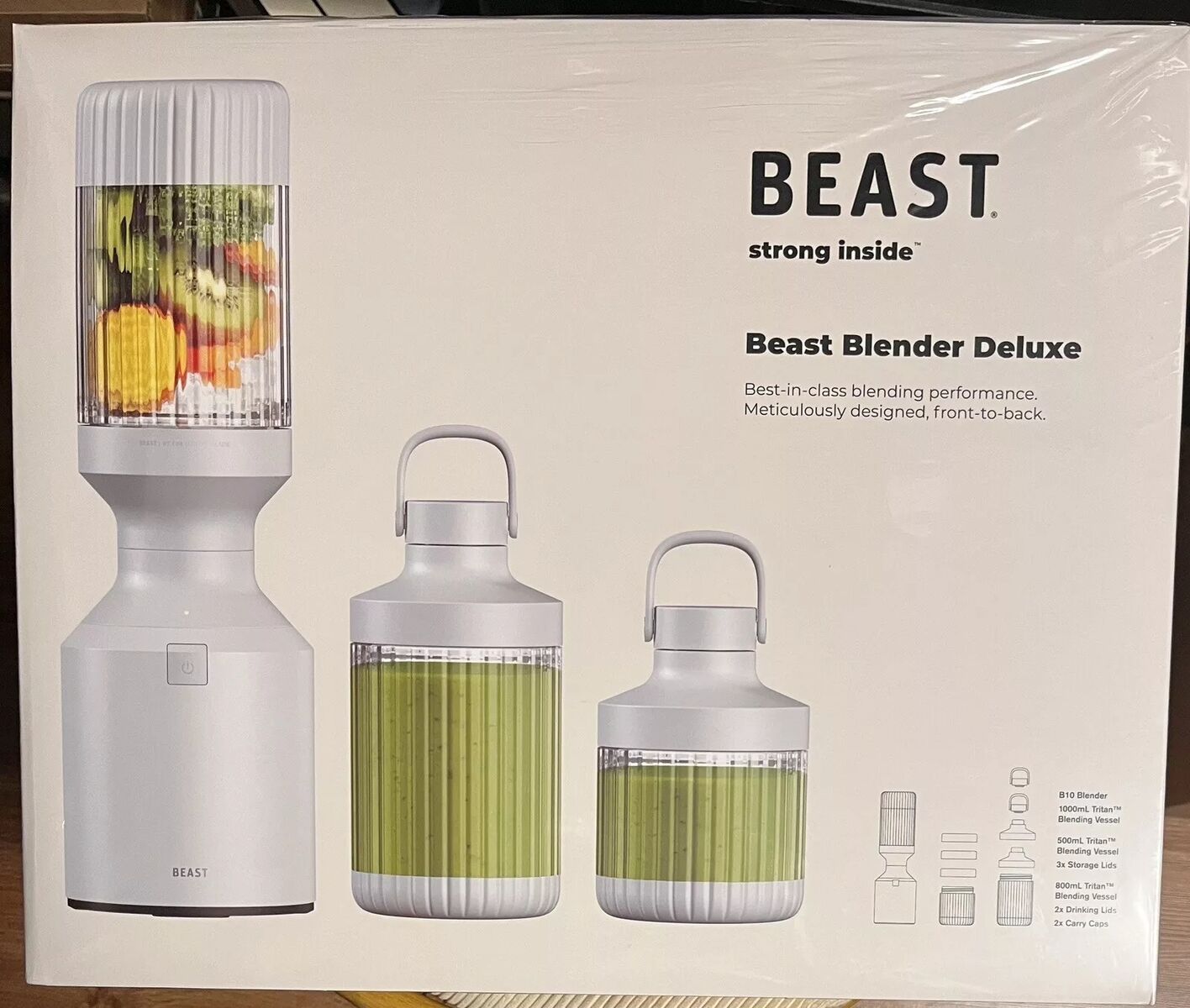Introducing the Beast Blender Deluxe, the ultimate kitchen tool for all your blending needs. This powerful blender features a 1000 watt motor that can handle even the toughest ingredients, and its 12-rib blending vessels are designed to maximize internal turbulence for smooth blends every time. With perfectly programmed settings for a 1-minute blending cycle or pulse option, the Beast Blender Deluxe is perfect for making smoothies, shakes, soups, and more. The blender also comes with three vessels, three storage lids, two drinking lids, and two carry caps, making it easy to store and transport. Plus, its sleek and modern design adds a touch of elegance to any kitchen counter.********