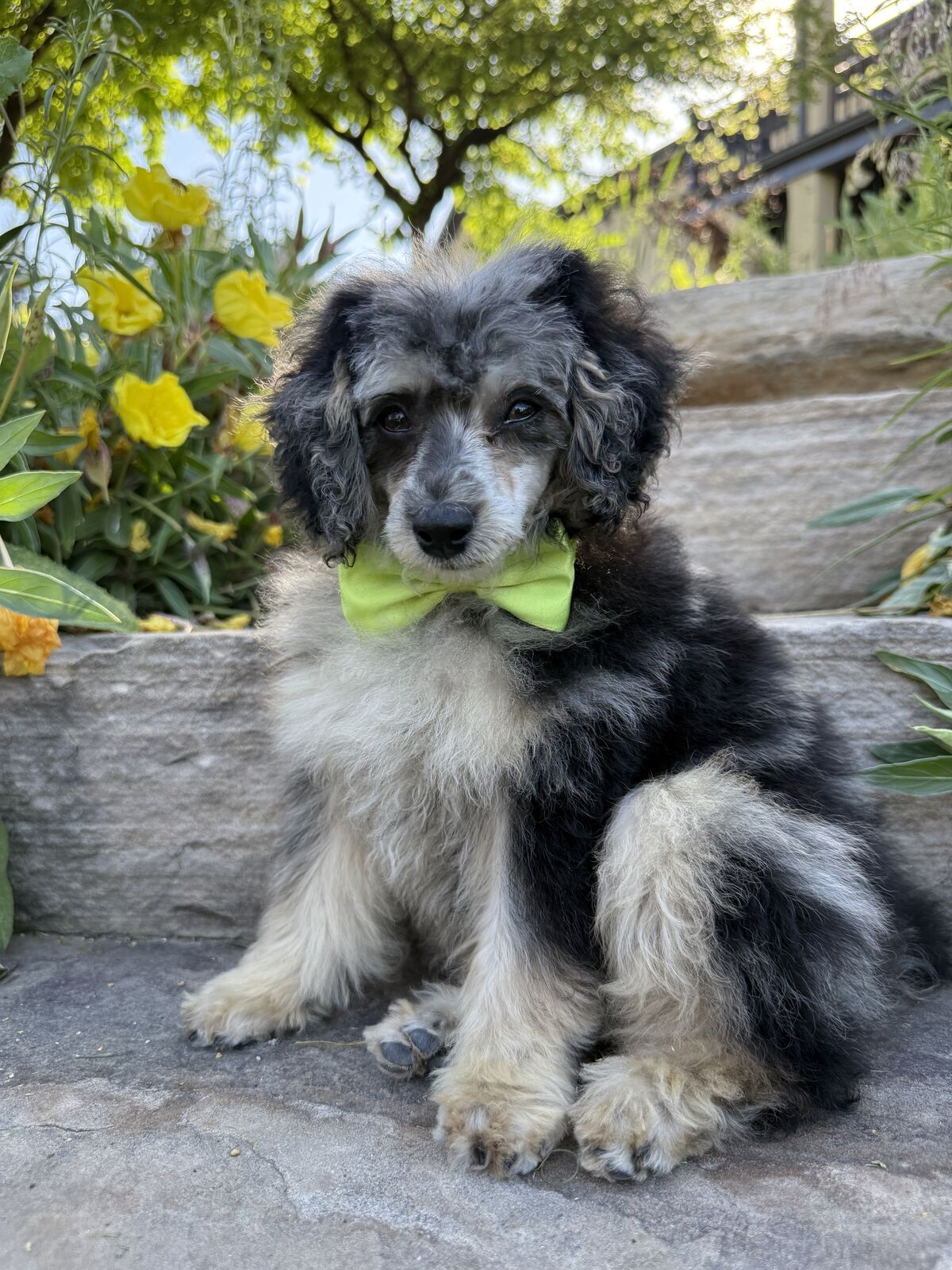 Color: Blue Merle Phantom with Tan Points Health: Embark Clear Exceptional Genetic Profile Ee – carries cream, FF (Fully Furnished) – guarantees doodle-friendly coats atat (Phantom) – rich, uniform point expression, KyKy – allows agouti expression, Ssp – parti carrier Bb – chocolate carrier, M*m – merle with potential for blue eyes, Coat Type: CT – soft, wavy, plush texture ideal for F1b and multigen doodles