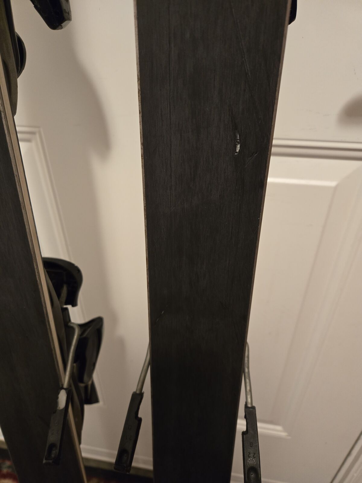 Good overall condition, super smooth bottoms, minor scratches, only one small ding as shown in the last picture. Edges are sharp and straight. Minimal cosmetic wear. Salomon S810ti bindings