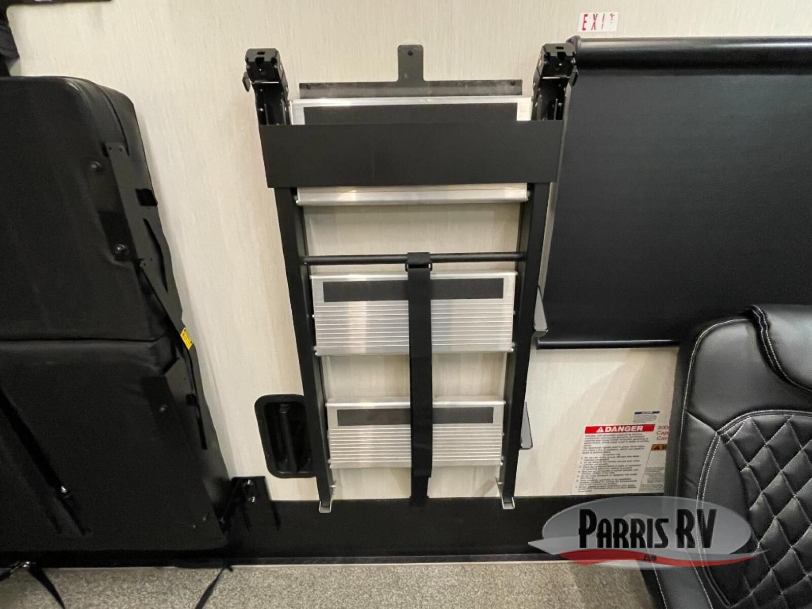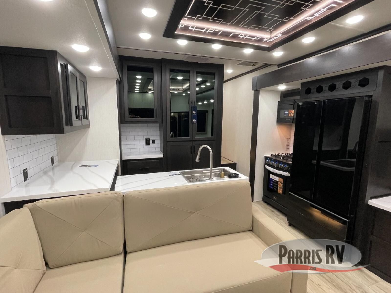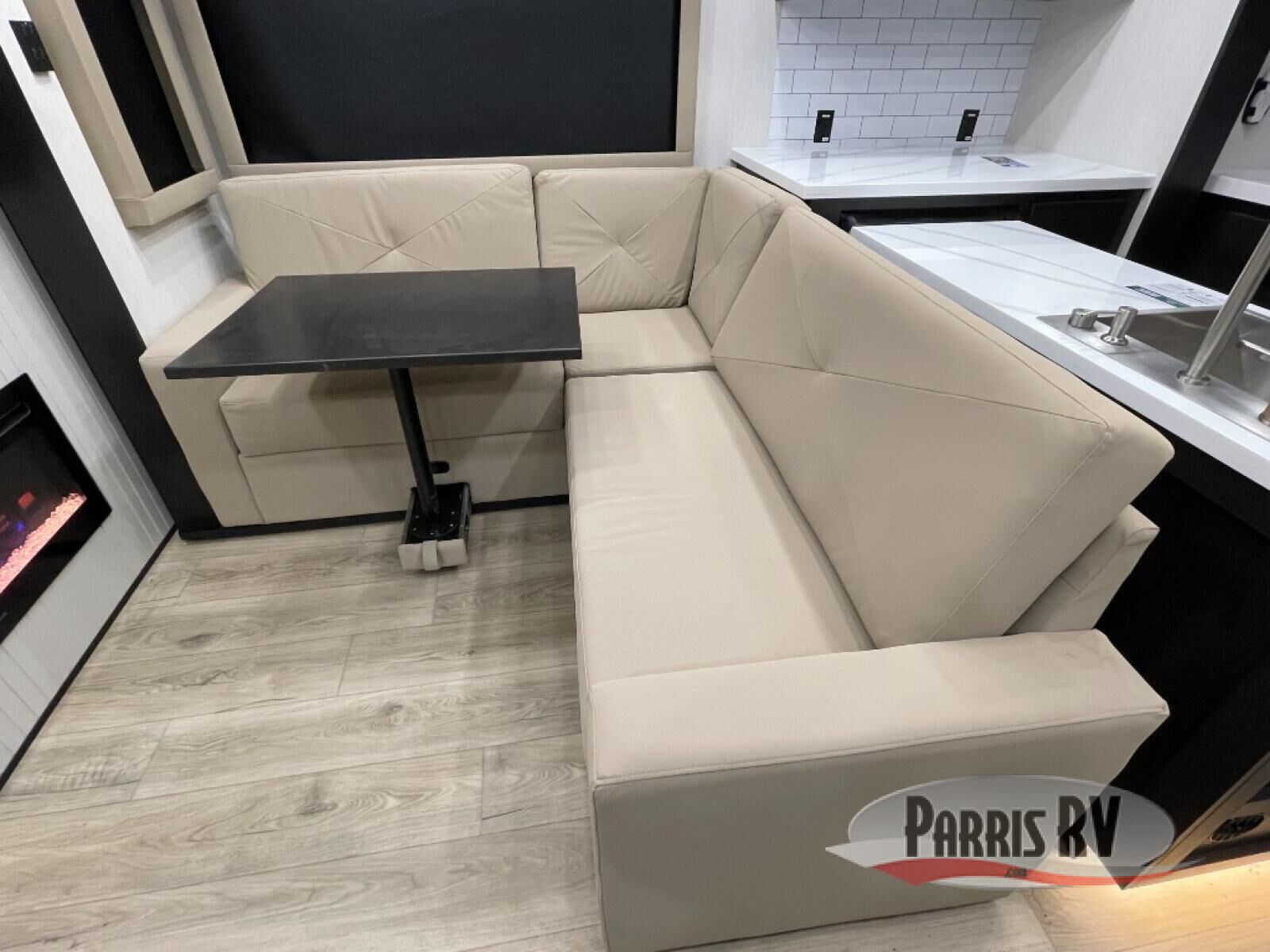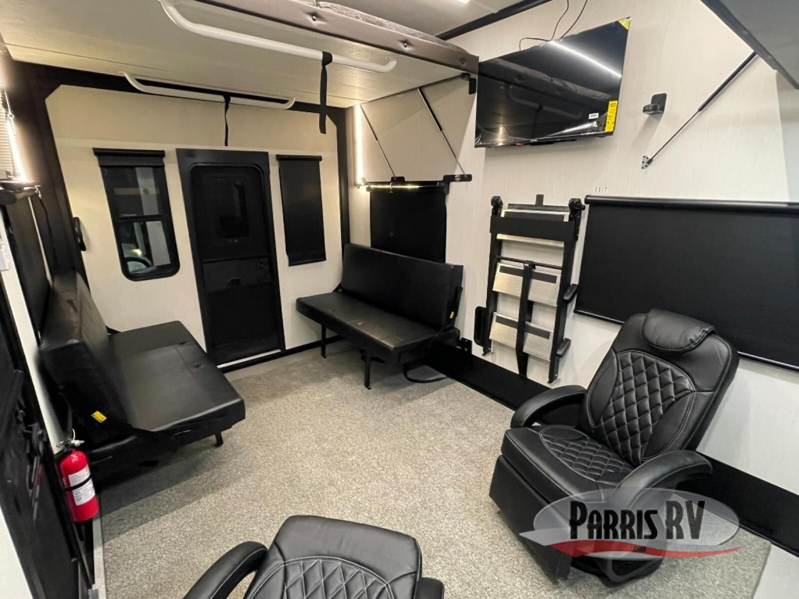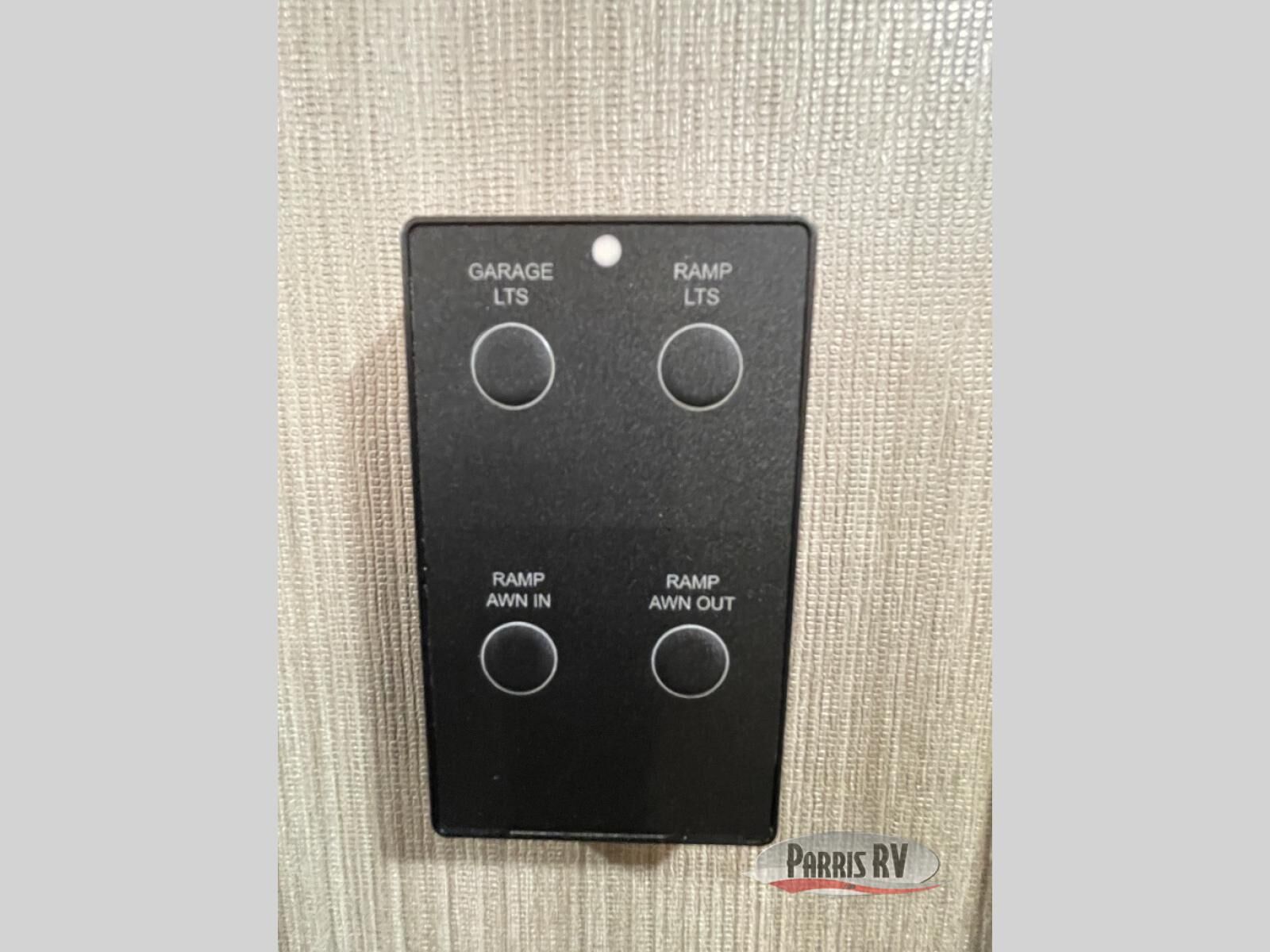 Make each adventure count in this spacious toy hauler for eight! Once you've unloaded the toys from the 13' separate garage, you can utilize the two flip-up sofas with a queen bed above. There is also a half bath here and a ladder leading to the loft! The main living area includes an L-shaped sofa across from the LED flatscreen TV and fireplace, allowing you to have movie nights, and the full kitchen includes ample counter space to set out snacks. A residential style four-burner range and residential size microwave will let you make meals for your crew every day, and there is a pantry plus 12V refrigerator for food storage. You're sure to appreciate the dual bath sinks in the full bath, and you'll feel right at home in the front private bedroom with a king bed slide, dresser, and front wardrobe.