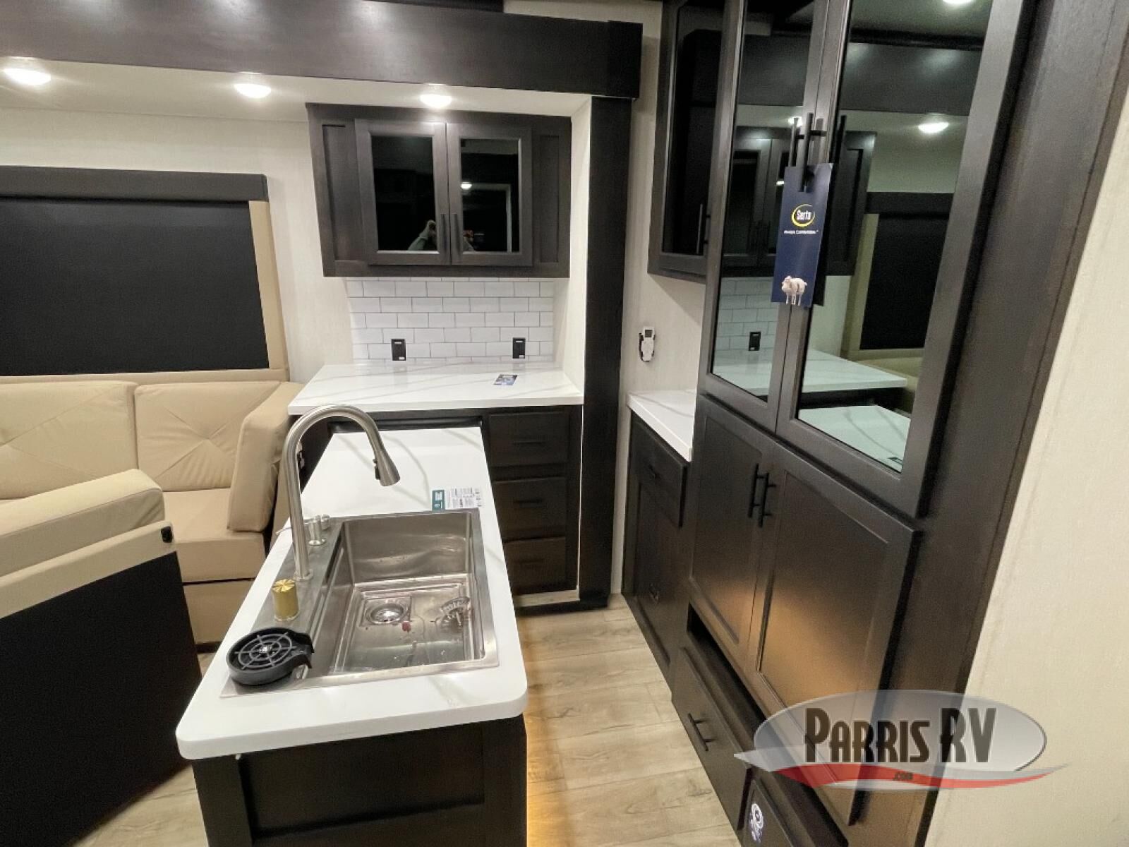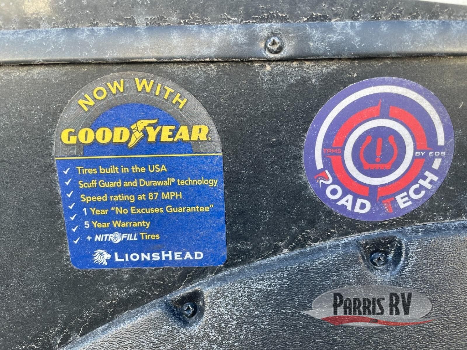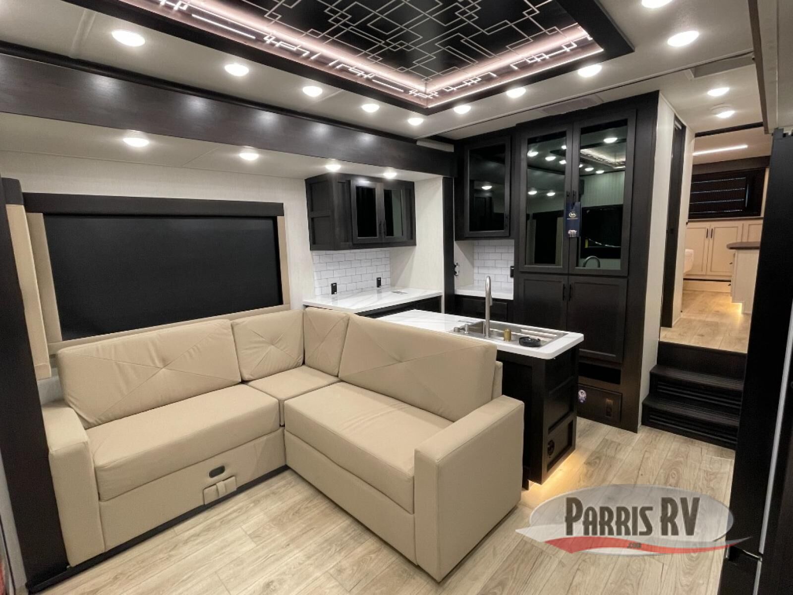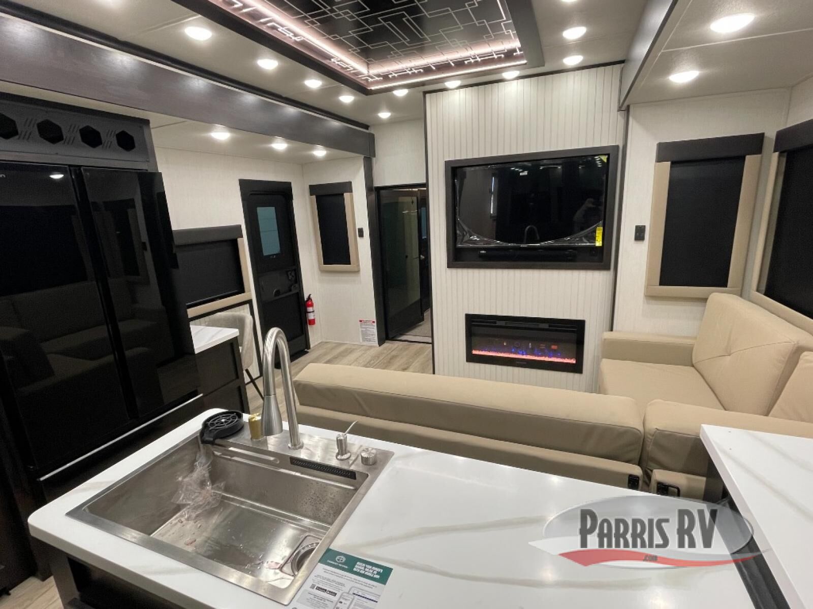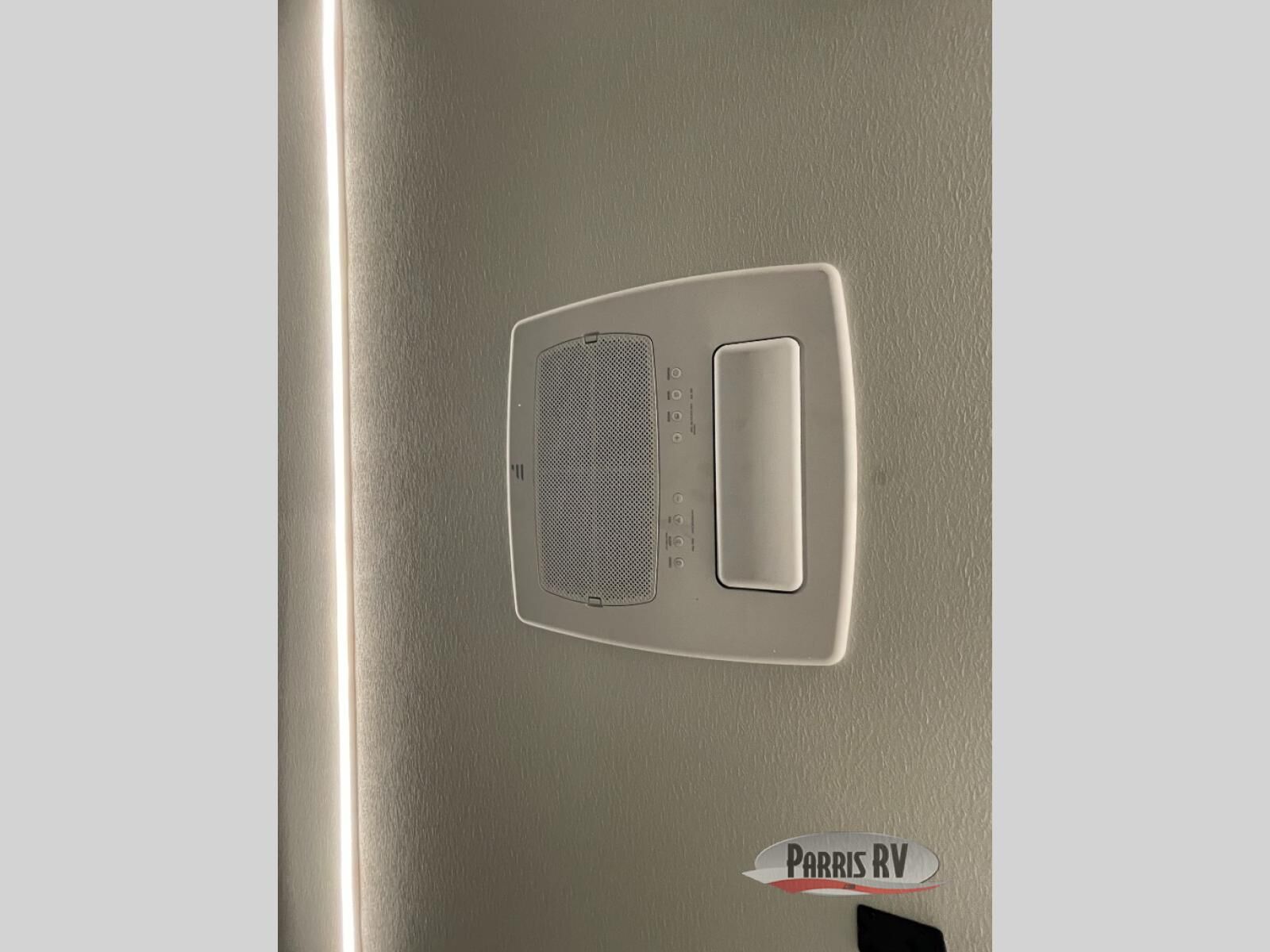 Make each adventure count in this spacious toy hauler for eight! Once you've unloaded the toys from the 13' separate garage, you can utilize the two flip-up sofas with a queen bed above. There is also a half bath here and a ladder leading to the loft! The main living area includes an L-shaped sofa across from the LED flatscreen TV and fireplace, allowing you to have movie nights, and the full kitchen includes ample counter space to set out snacks. A residential style four-burner range and residential size microwave will let you make meals for your crew every day, and there is a pantry plus 12V refrigerator for food storage. You're sure to appreciate the dual bath sinks in the full bath, and you'll feel right at home in the front private bedroom with a king bed slide, dresser, and front wardrobe.