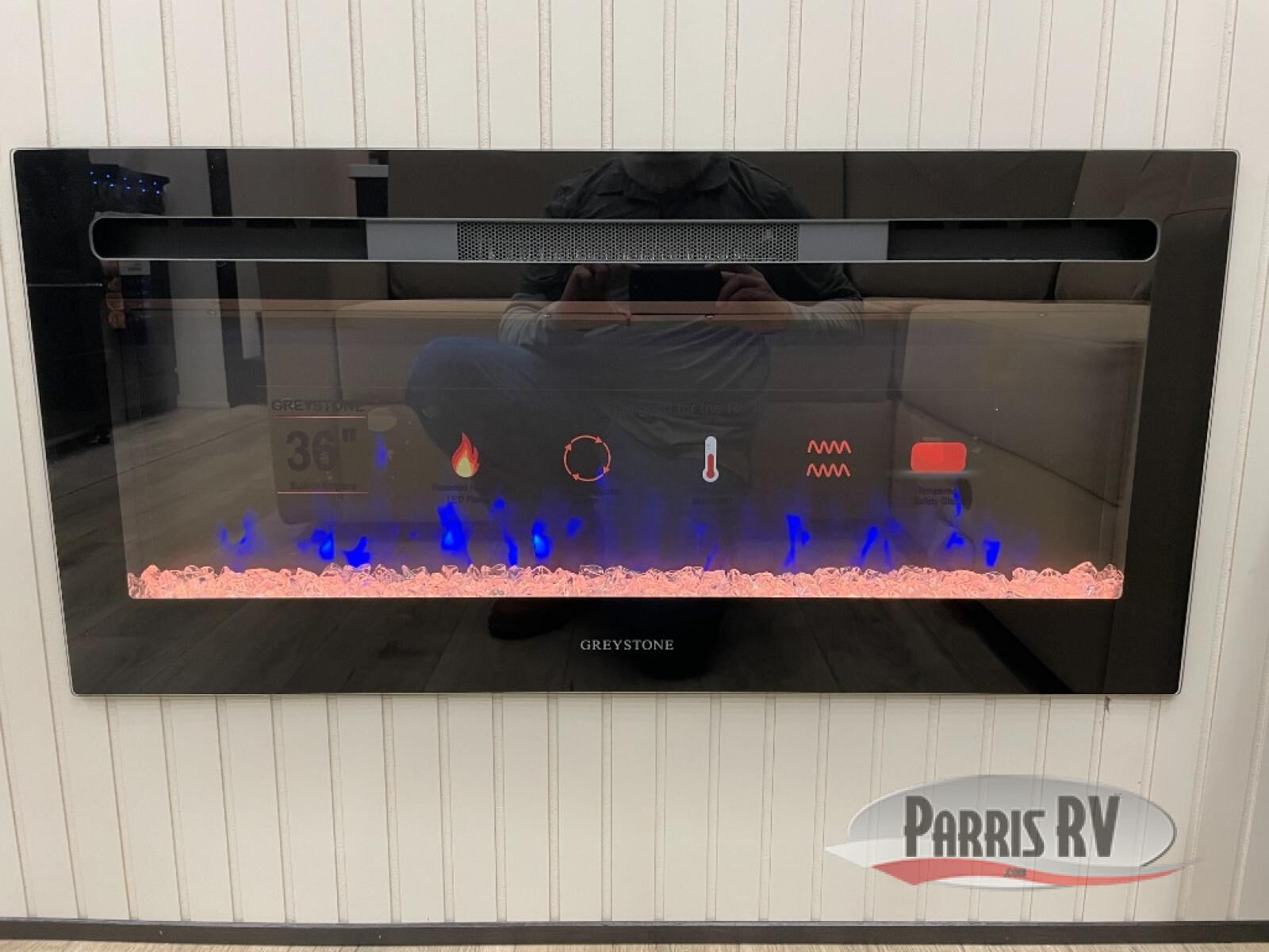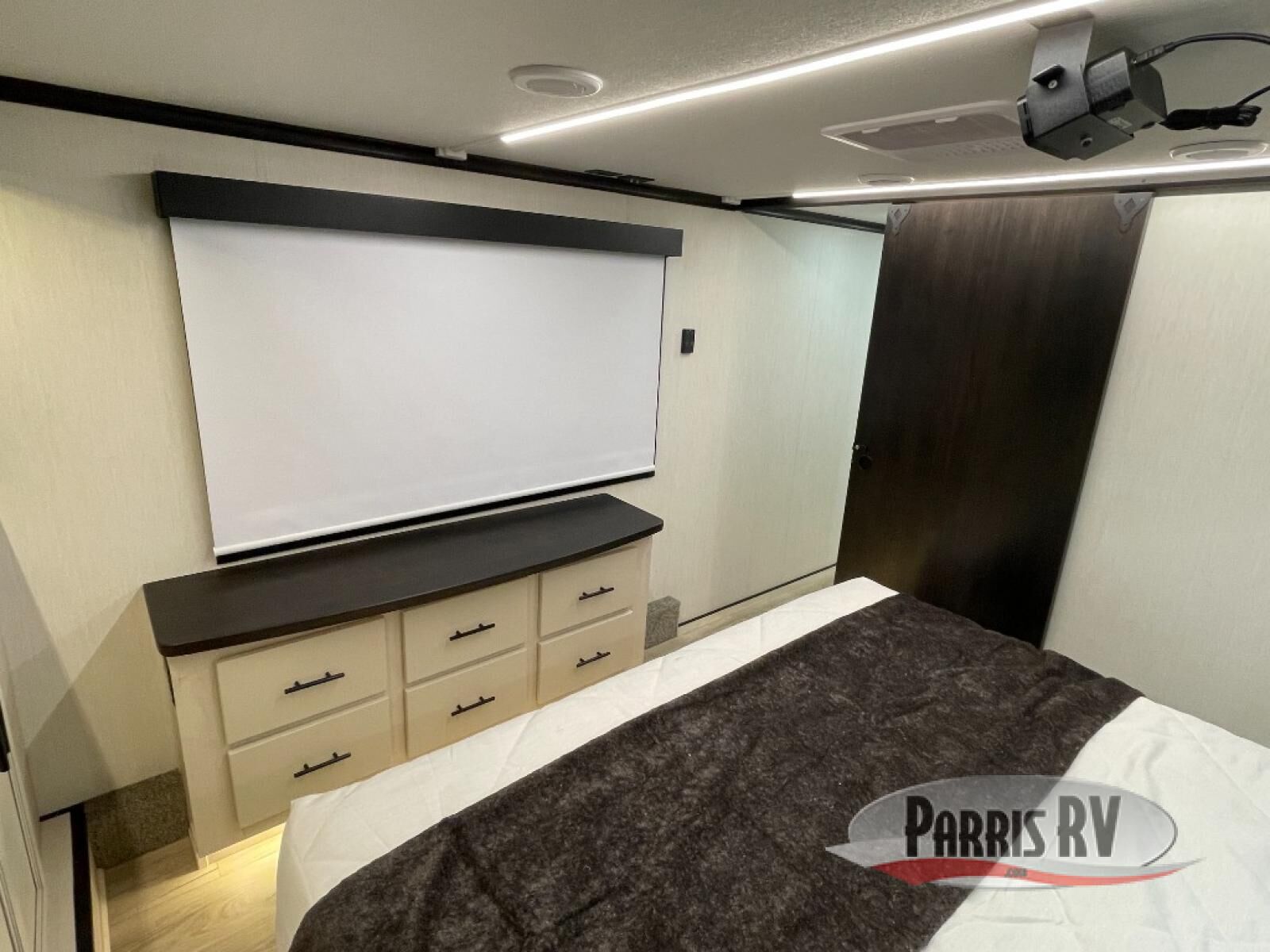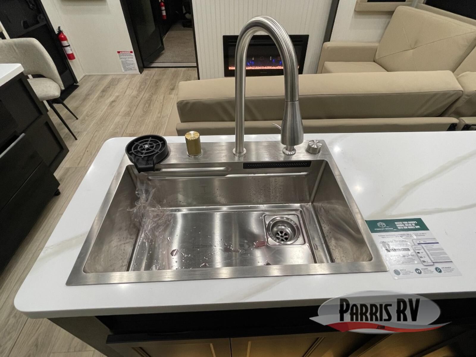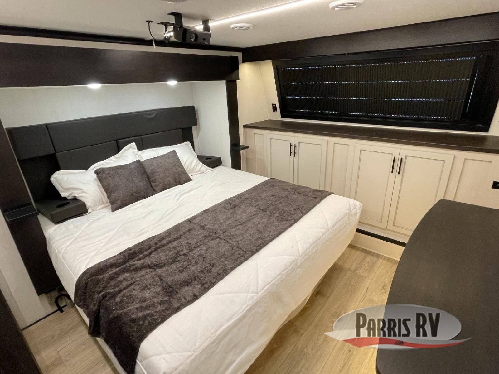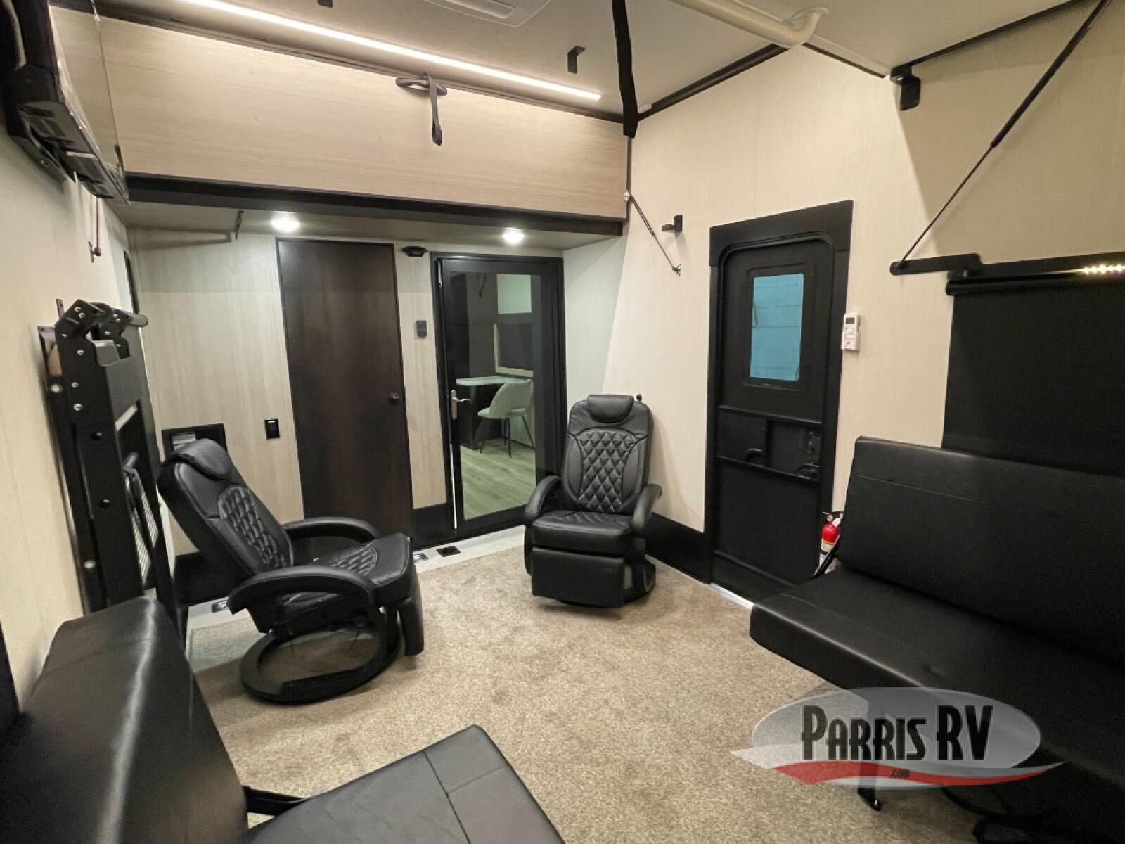 Make each adventure count in this spacious toy hauler for eight! Once you've unloaded the toys from the 13' separate garage, you can utilize the two flip-up sofas with a queen bed above. There is also a half bath here and a ladder leading to the loft! The main living area includes an L-shaped sofa across from the LED flatscreen TV and fireplace, allowing you to have movie nights, and the full kitchen includes ample counter space to set out snacks. A residential style four-burner range and residential size microwave will let you make meals for your crew every day, and there is a pantry plus 12V refrigerator for food storage. You're sure to appreciate the dual bath sinks in the full bath, and you'll feel right at home in the front private bedroom with a king bed slide, dresser, and front wardrobe.