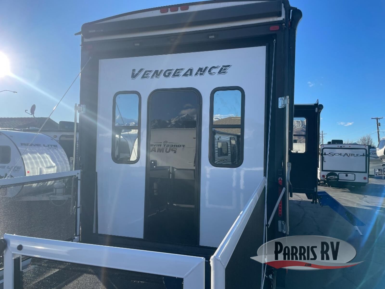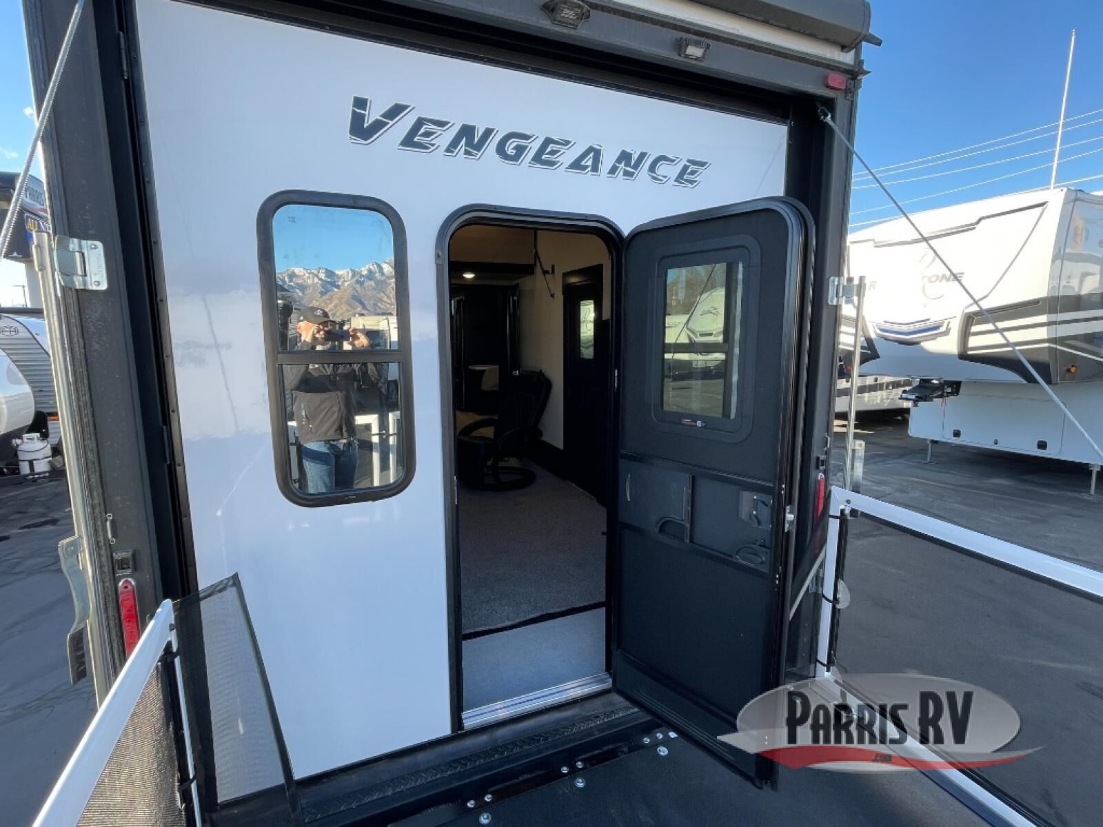 With any Cherokee Vengeance toy hauler fifth wheel by Forest River, you will find functionality and refined comfort at every turn! Each model features an 8' 6" wide body construction, high-gloss gelcoat fiberglass, and NTXT composite substrate for added durability. The MORryde 3000 suspension will make towing easier than ever, and there are additional MORryde features such as a hitch, extended handrail at the garage and entry door, and a MORryde pull-out tray in the exterior compartment. The 5,000 lb. tie-downs will help keep your gear secure, and the 30-gallon fuel station will keep your toys ready to go. Each toy hauler also includes luxury solid surface countertops throughout, luxury upgraded furniture, dual roller day/night shades in the living room, a glass shower enclosure, and LED lighting throughout to name just a few luxury features!