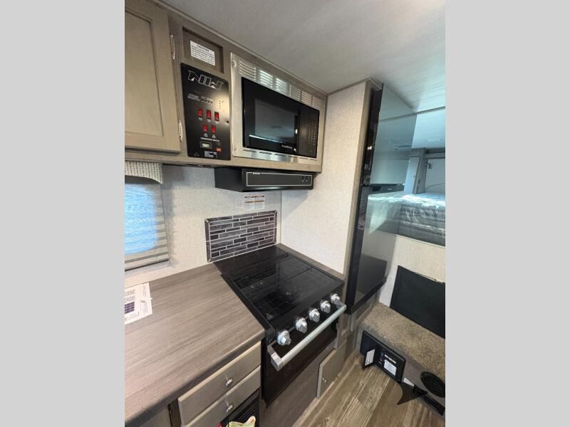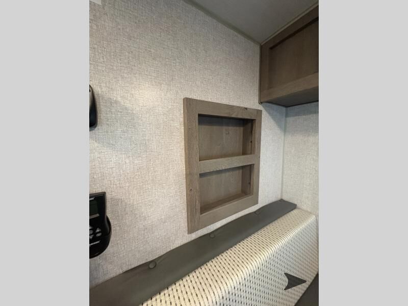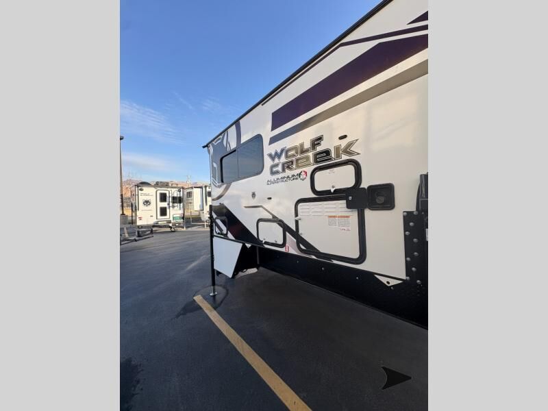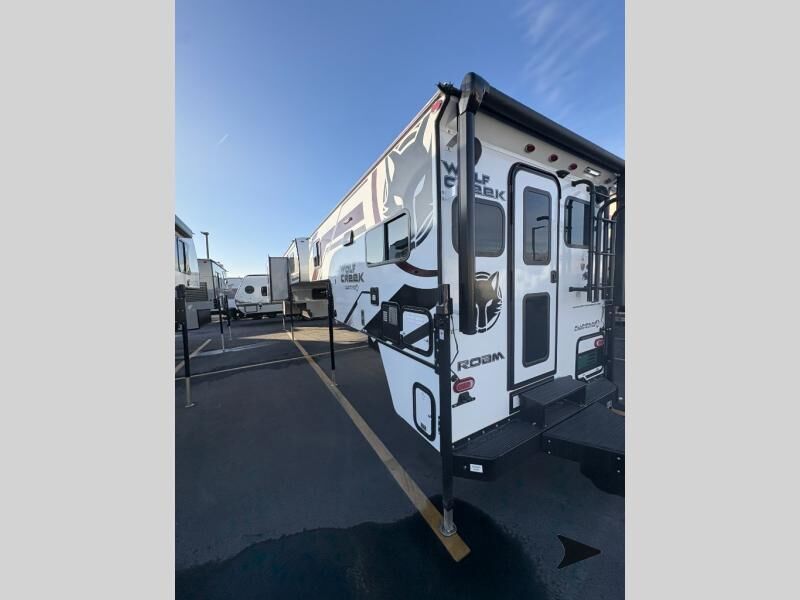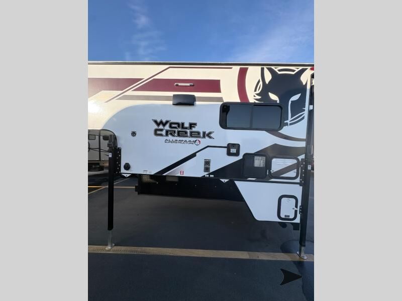 Northwood Wolf Creek truck camper 890 highlights: Stainless Steel Sink Front 58" x 80" Bed 8 Cu. Ft. 12V Refrigerator 7' 4" Rear Electric Awning Three Burner Cooktop Make your weekend excursions easier than ever in this cozy truck camper for three to four. Since there is a 58" x 80" queen bed up front, you won't have to sleep on the floor, and your guests can sleep on the booth dinette that converts to a 40" x 72" sleeping area. Get cleaned up each day in the convenient wet baththat includes a medicine cabinet and an exhaust fan to keep everything fresh. There is a three burner cooktop and residential-stylemicrowave with an air fryerto prepare meals each day, plus an 8 cu. ft. 12V refrigerator for perishables. This model also includesthree wardrobesaround the bed for more storage place plus a TV location if you want to add the optional 24" 12V LED TV! With any Wolf Creek truck camper by Northwood you can camp year around thanks to the high density block foam insulation, thermal pane windows, and the multi-layered substrate walls. The durable fully welded, thick-wall aluminum frame construction will add durability, and the Corona treated fiberglass will help combat leaks so you can enjoy your camper for years to come. Each model includes fabric night shade window treatments, custom one-piece formed countertops and dinette table, hardwood cabinet doors, and many more comforts. You will love the high value features included within the Wolf Pack, such as a Fox Landing ready rear bumper, a premium vent, electric jacks, and outside speakers.