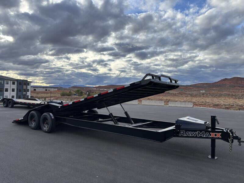 2-8,000 lbs Torsion Axles 4-14 Ply ST235/85R16 Tires 2-5/16" Ball Adjustable Coupler 8" x 13 lbs I-Beam Frame 3" Channel/16" OC Full Power Tilt Deck Dual 3 20 Cylinders Tilt Angle: 13 Degrees Flooring: 2" Treated Lumber Deck 1 Side Wind Drop Leg Drop- 10,000 lbs Integrated Tool Box In Tongue 6" Outer Deck Frame Rub Rail: 2" x 3/8" Flat Bar 3-7/8" x 1-13/16" (ID) Stake Pockets Chain Spool: 1 5/8" OD 4- Weld On D-Rings 3/16" Thread Plate (Drive-Over) Fenders Winch Plate 3/8" G70 Safety Chains Front Rail Guard 3M DOT Compliant Reflective Tape All Weather Wiring Harness Powder Coat Paint 5 Year Dexter Axle Warranty 3 Year Structural/ 1 Year Paint 10W Solar Panel Wireless Remote on a KTI Pump Jet Black Spare- 14 Ply Tire 235/85/R16- Single Wheel