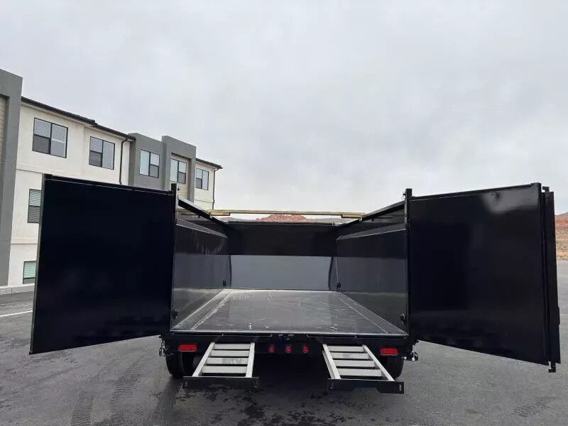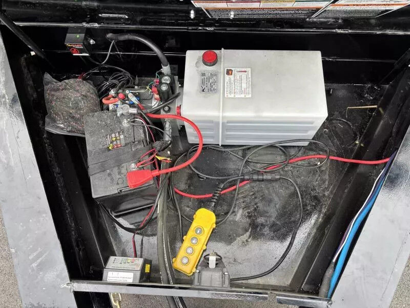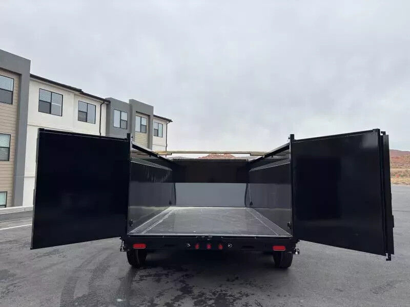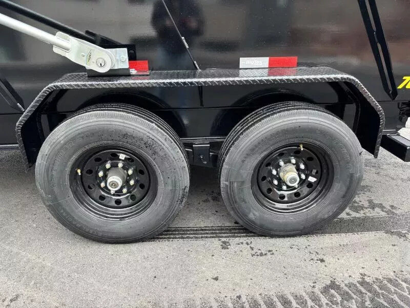 (2) 7,000# Axles w/ Quick Lubricating Hubs & Elec. Brakes 12V Deep Cycle Forward Self-Adjusting Electric Brakes on Both Axles Multi-Leaf Slipper Spring w/ Equalizer 2-5/16" Ball, Adjustable Demco EZ Latch Coupler 3/8" Grade 70 w/ Safety Latch Hook (2 ea) 8" Seamless I-Beam (13#) 3" Channel on 16" Centers 7 Gauge Smooth Steel 9" x 72" 14 Ga. Diamond Plate Double Broke Not Included Stake Pockets Along Both Sides (Quantity Varies by Length) Recessed, Grommet-Mounted L.E.D. 7-Way RV Modular Cold-Weather Wiring Harness Spare Tire Mount Professional Finish w/ Primer Standard (4) 1/2" D-Rings Inside Bed to Secure Equipment|Along Sides and Rear for Cargo Control Complete Breakaway System w/ Zip Breakaway Cable 5A 110V on Board Battery Charger Rear Combo Gate (Barn Doors & Spreader Gate) Power Up/Gravity Down Hydraulic Pump 5-stage Telescopic Cylinder 24" Or 48" Tall (10 Ga) with formed Channel Supports Rear Stabilizer Stands Convenient Side-Step to Access Top Rail Lockable Pump and Battery Box mounted in Front of Bed Fully-Formed Tarp Shroud with Tarp & Rear Tarp Rod Holders 3"x 2" Rectangular Tubing