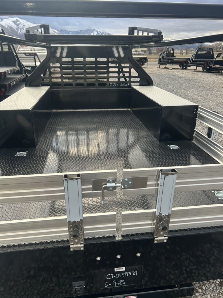 11’ Contractor Body Material rack rated for 3000 lb Front upper tool boxes 18” Fold down sides 4 recessed d-rings 24K receiver hitch LED lights