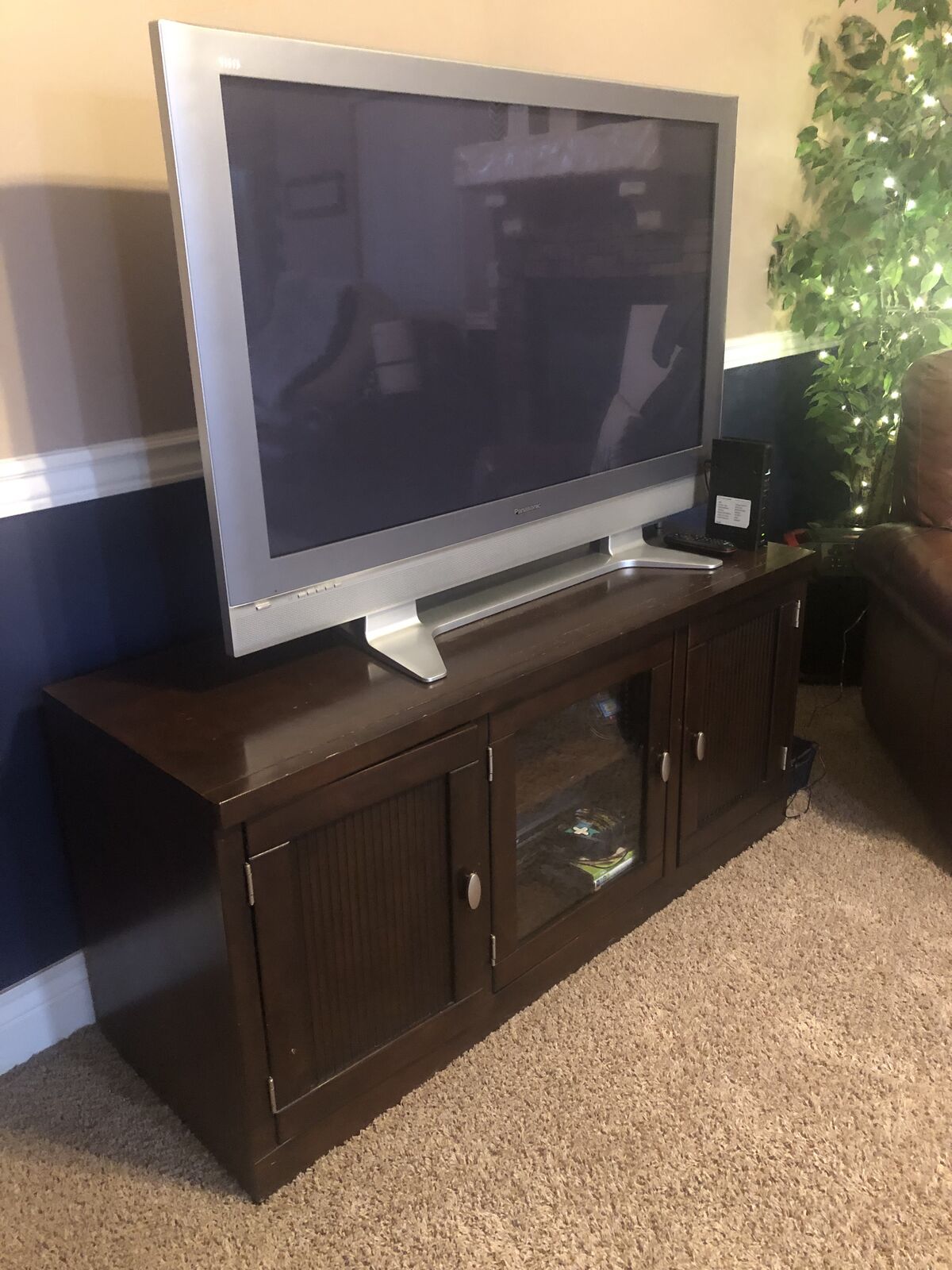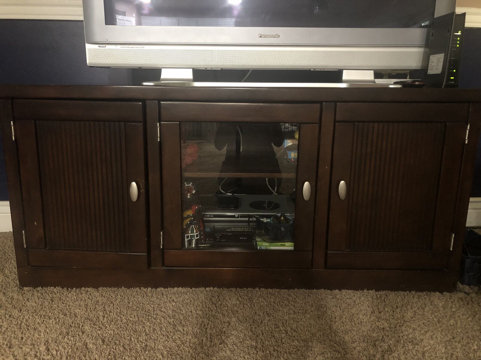 CashAppI paid almost $500 for this entertainment center and have kept it in excellent condition. I bought a different colored one and just need to move this out. I am asking $150 for it which I believe is an excellent deal. It is real wood (not particle board or other cheap material). It is heavy duty, sturdy, and high quality. It has a glass door in the middle with lots of space to put movies, DVD's, books, records, etc. I have loved it! It is 58" L x 20" D x 26" H